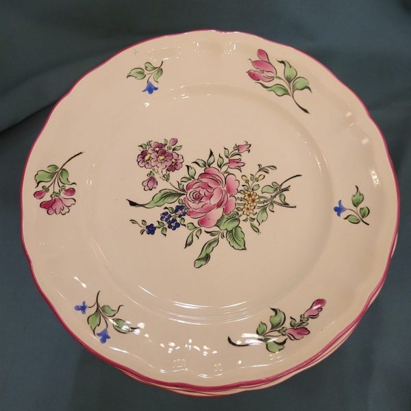 Vaisselle champêtre avec ce bel ensemble de la manufacture de Lunéville en demi porcelaine au modèle Réverbère. Motif différend selon les assiettes qui ont une taille intermédiaire entre la grande assiette et l’assiette à dessert. 21 assiettes sont en très bon état et 3 ont un le liseré rouge un peu effacé à un endroit.