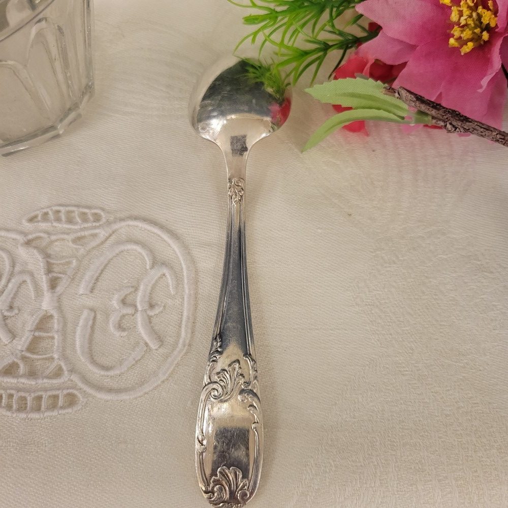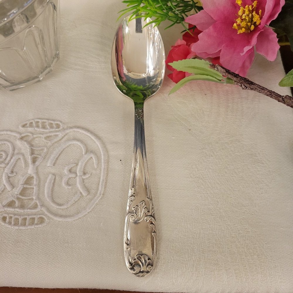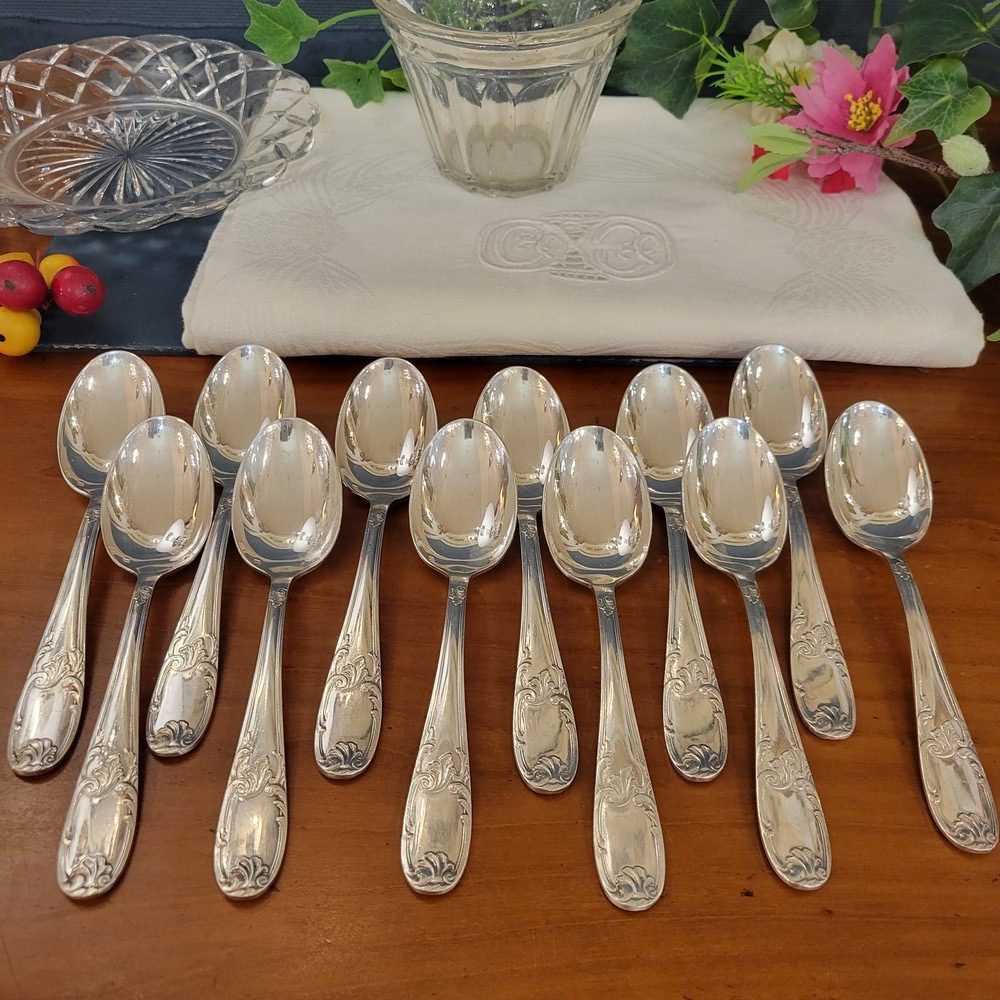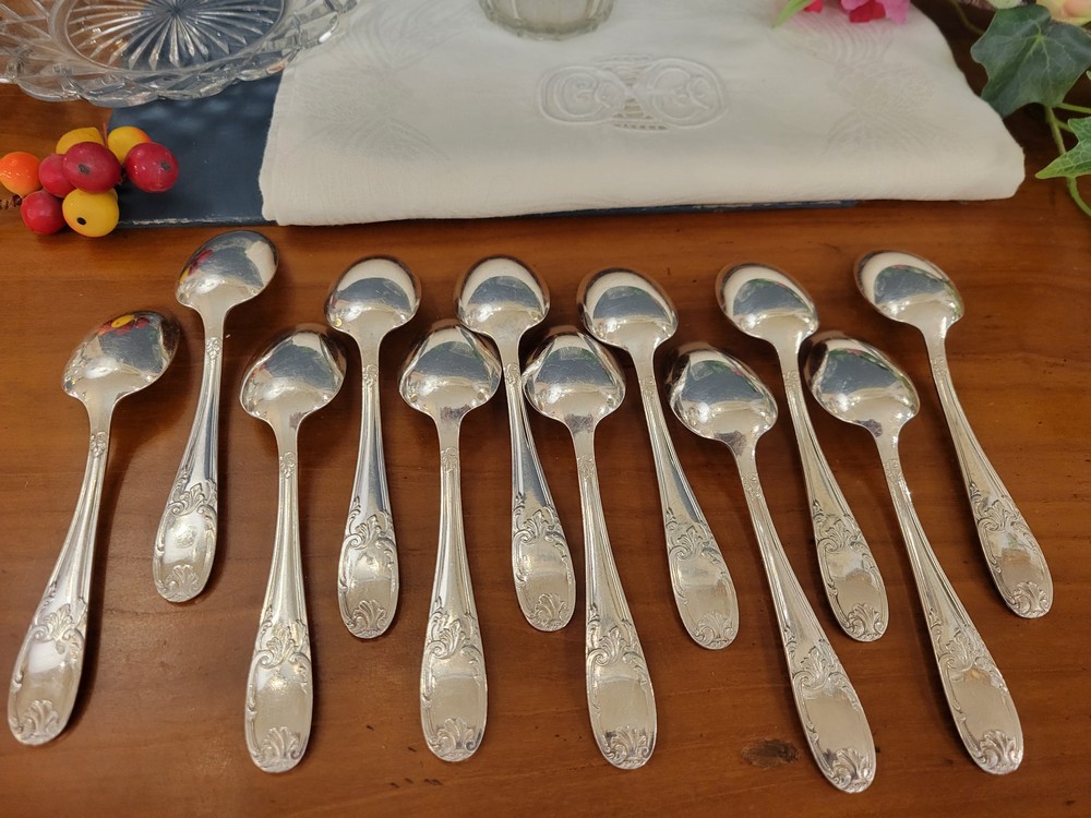 12 petites cuillères à dessert en métal argenté au poinçon non identifié. De pur style Louis XV et d’époque 1950, elles sont en bon état , avec les traces d’usage habituels mais pas de désargenture.