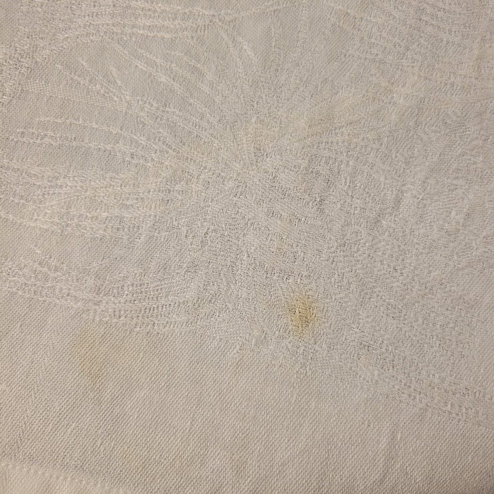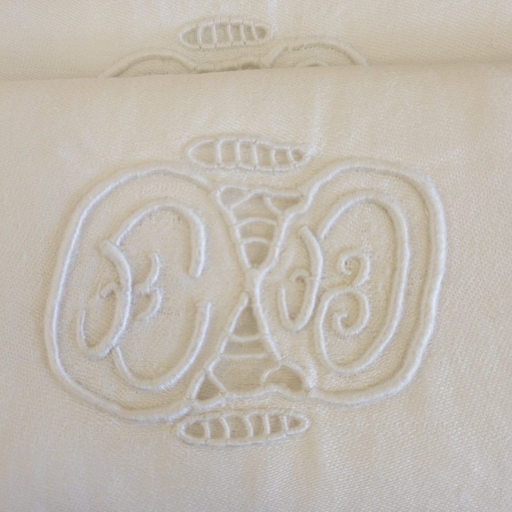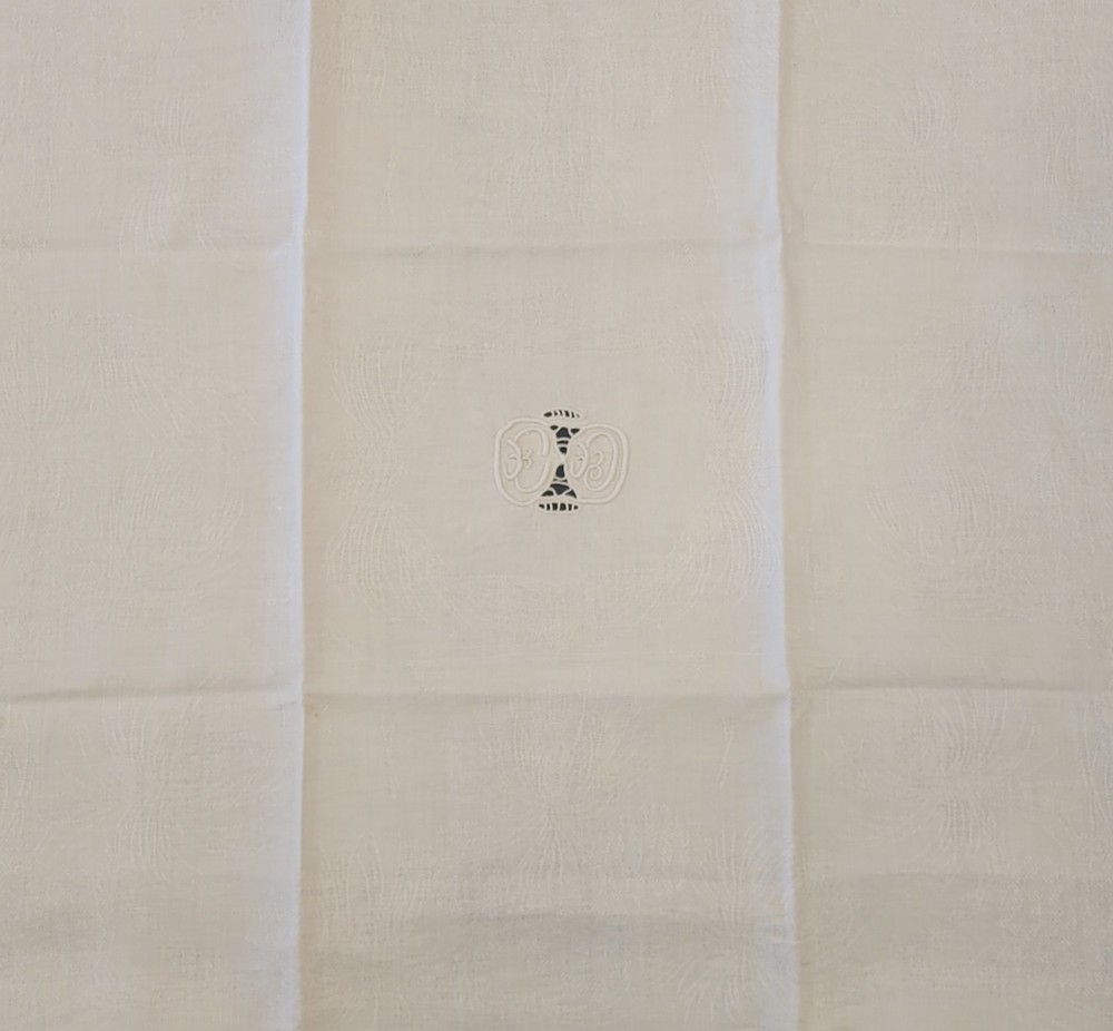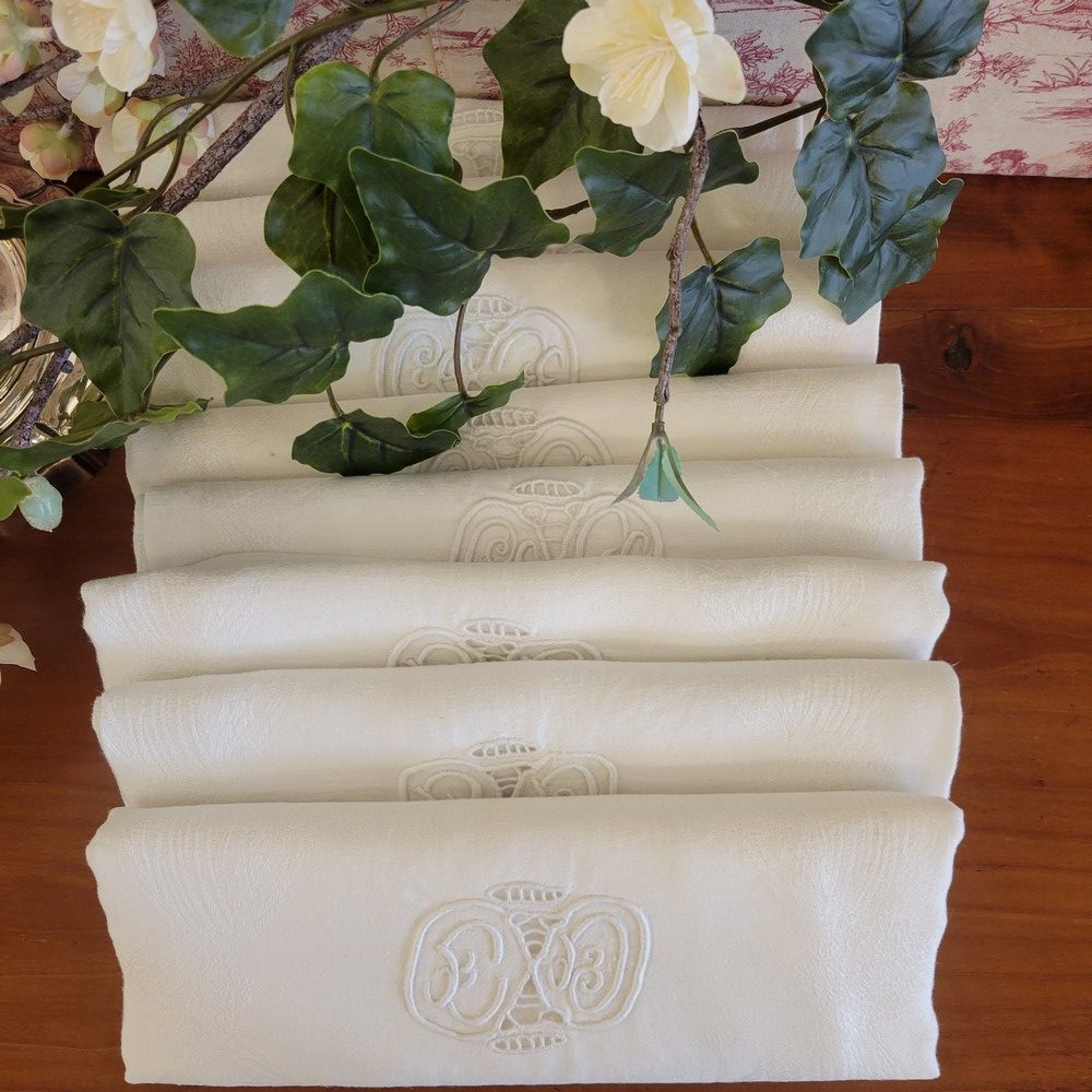 12 Serviettes en fil blanc damassé. Monogrammée E.D ou C.D. Broderie ajourée au centre. 7 sont en bon état et 5 ont des tâches jaunes.