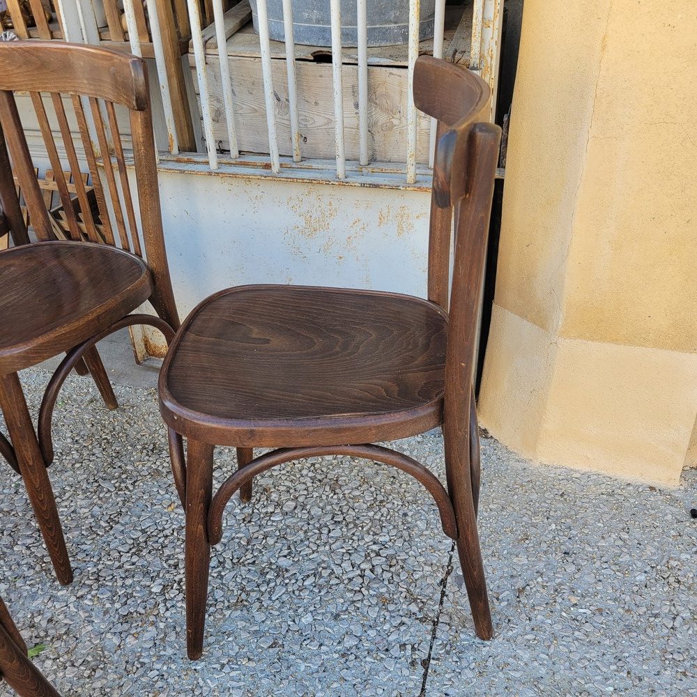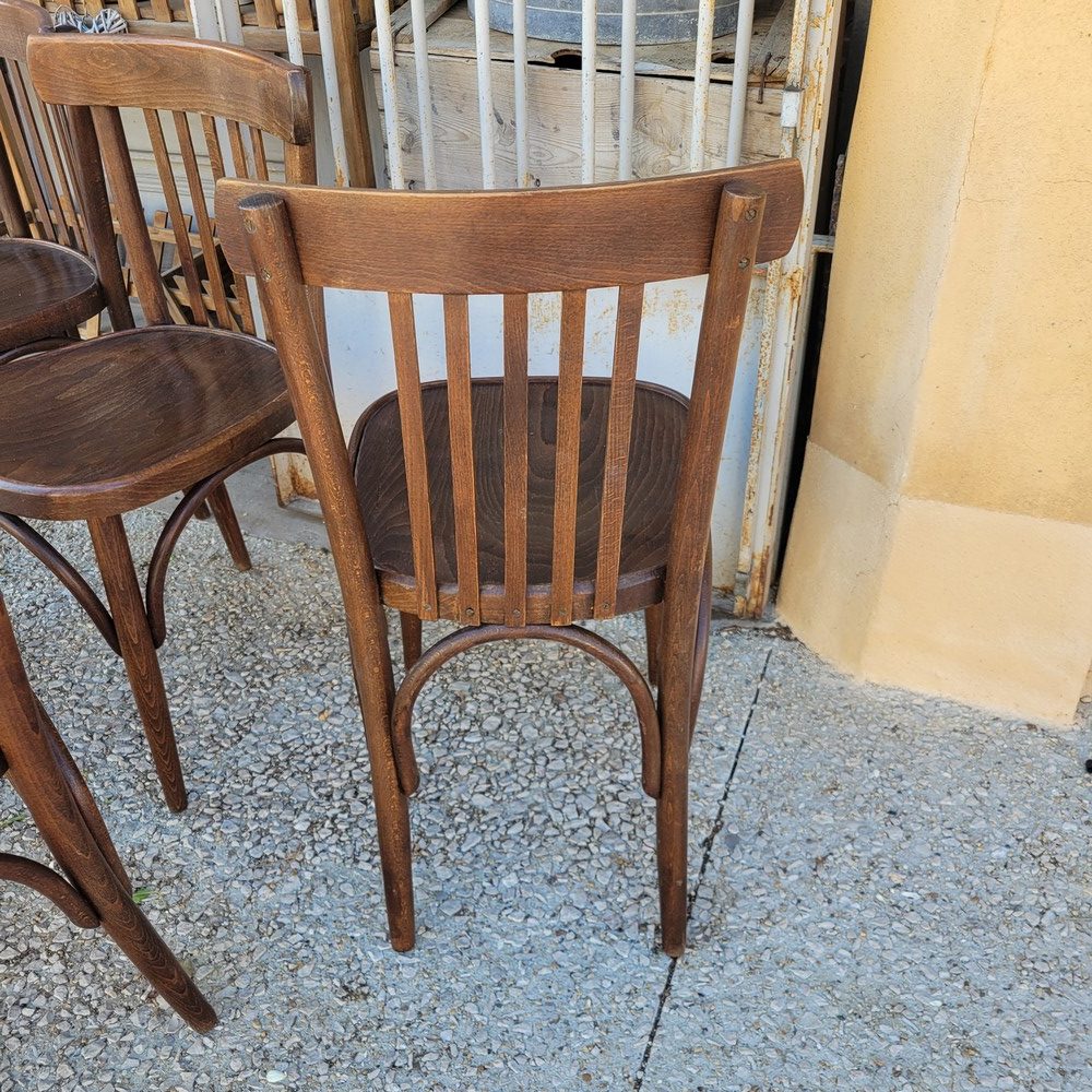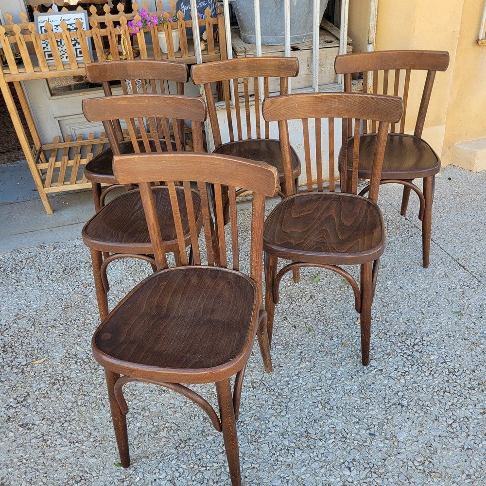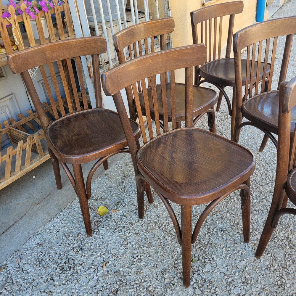 6 Chaises Bistrot, dans l’esprit Baumann mais sans signature. Des années 1940, elles sont en hêtre et en bon état, ce qui garantit leur solidité et leur stabilité. Petite fente sans gravité sur  2 assises.