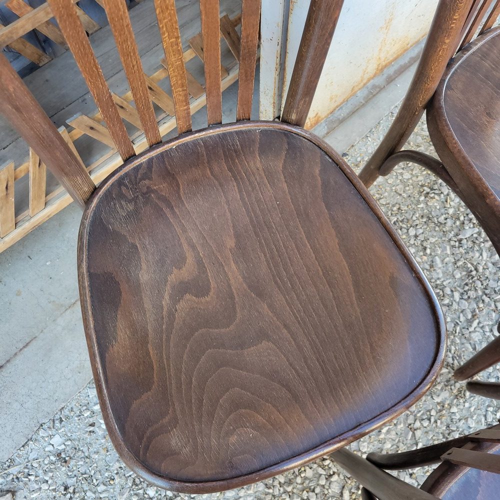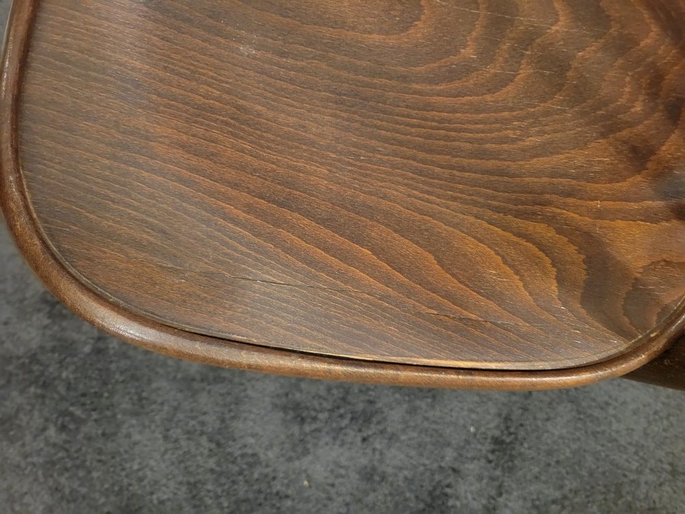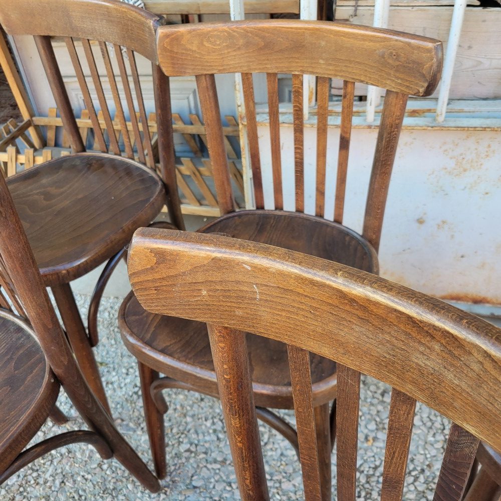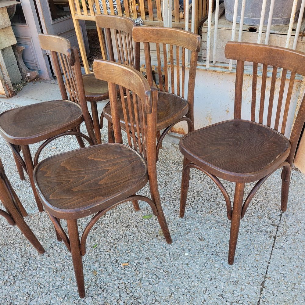 6 Chaises Bistrot, dans l’esprit Baumann mais sans signature. Des années 1940, elles sont en hêtre et en bon état, ce qui garantit leur solidité et leur stabilité. Petite fente sans gravité sur  2 assises.