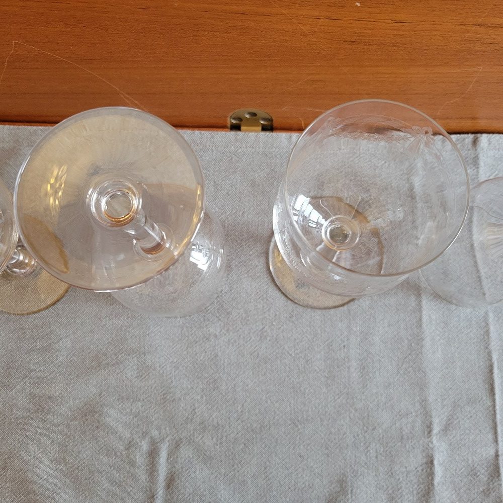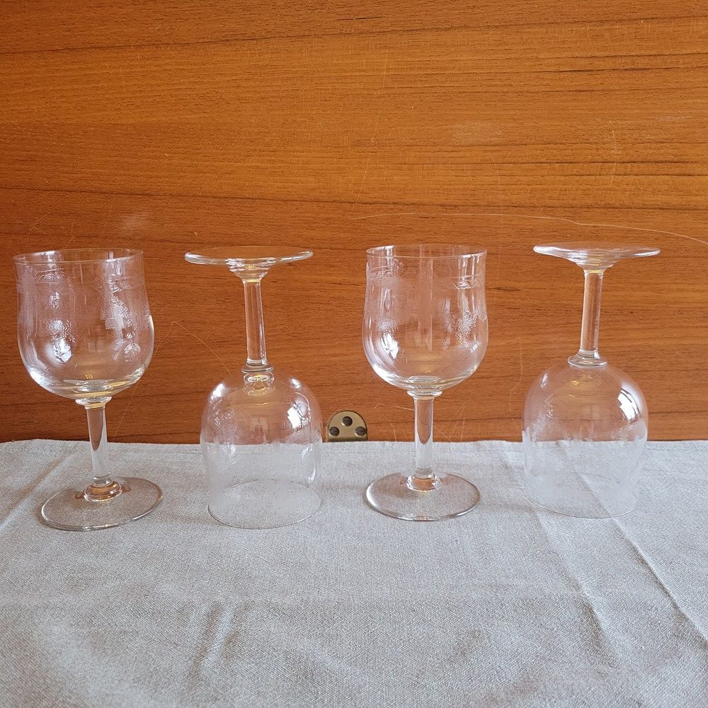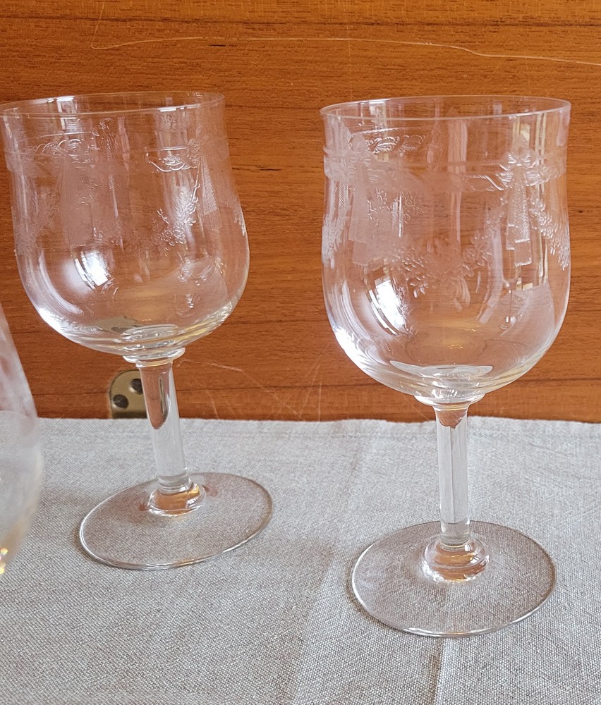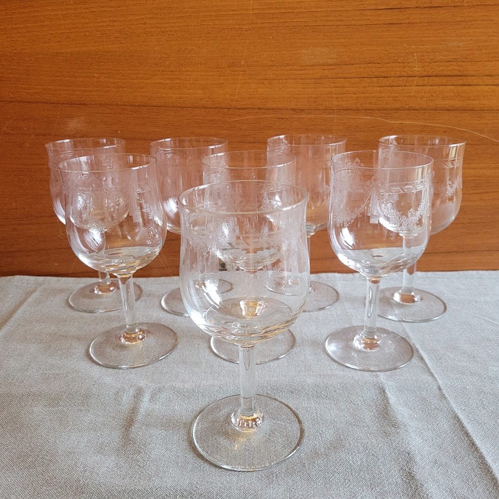 8 verres à pied, en verre soufflé, d’époque 1900. Ils sont décorés de guirlandes de roses gravées. Ils sont en bon état.