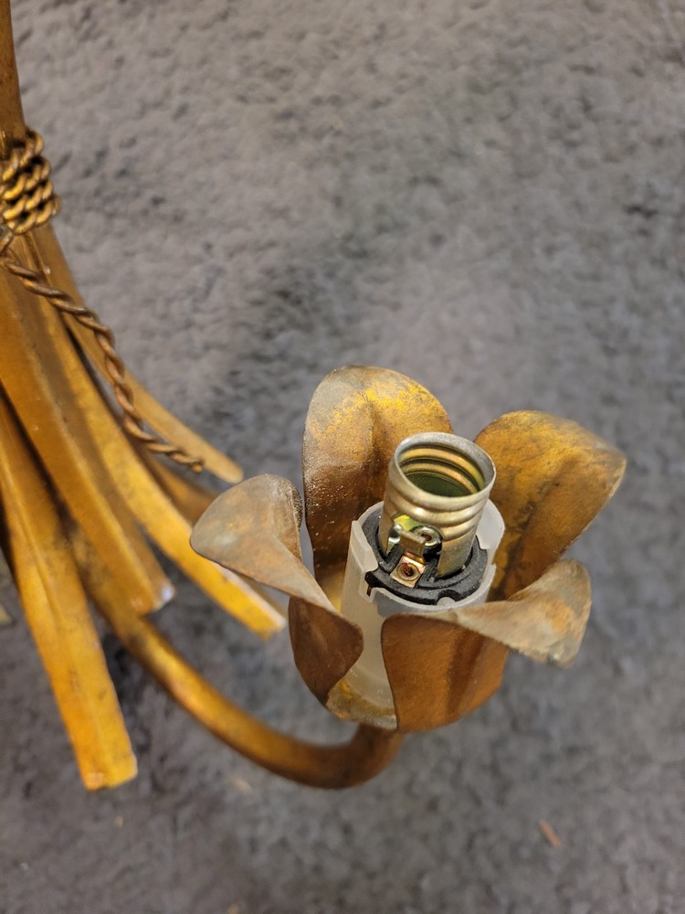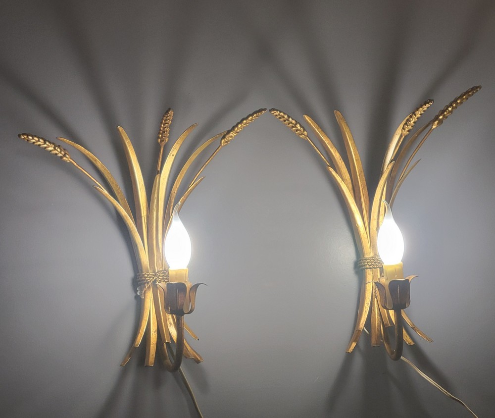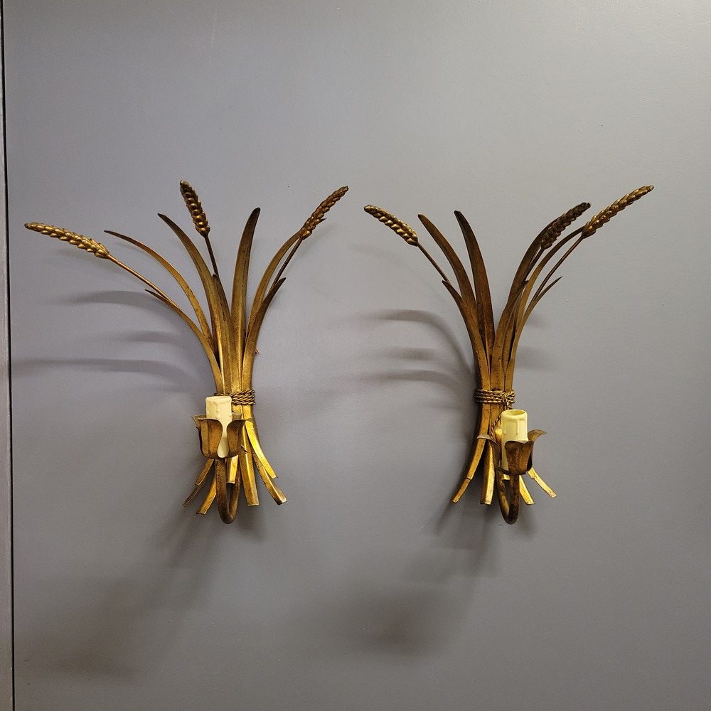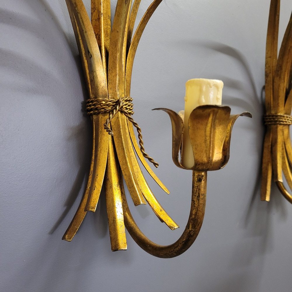 Paire d’appliques vintage à épis de blé. En métal peint en doré, elles sont munies d’un bras de lumière fonctionnant avec des ampoules à vis E14. Elles datent des années 1950.