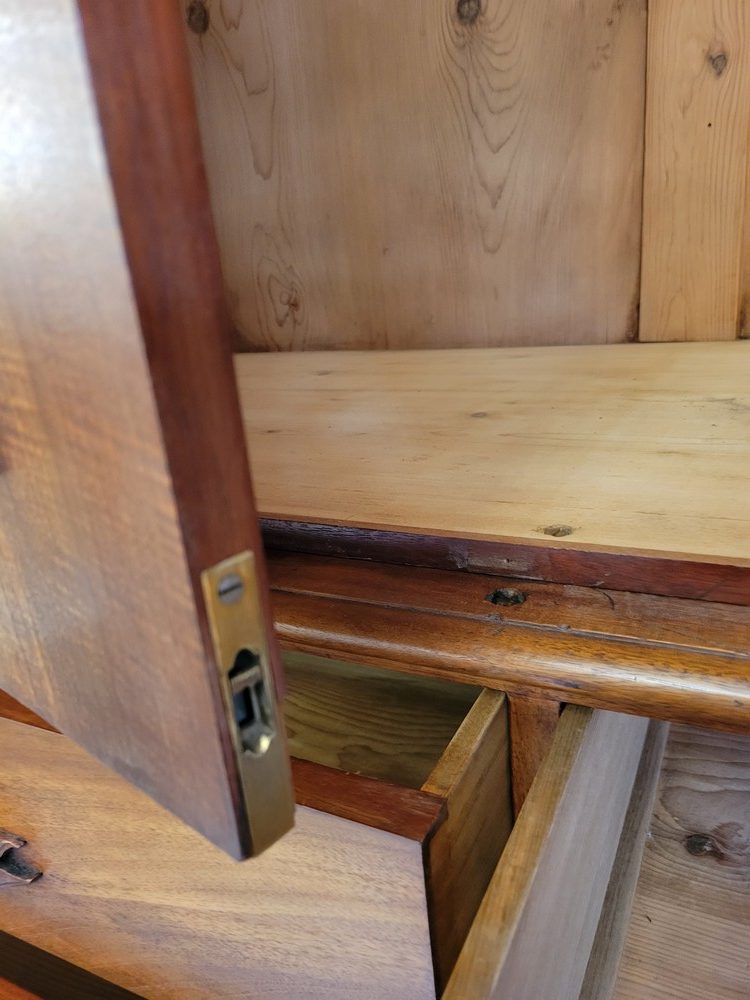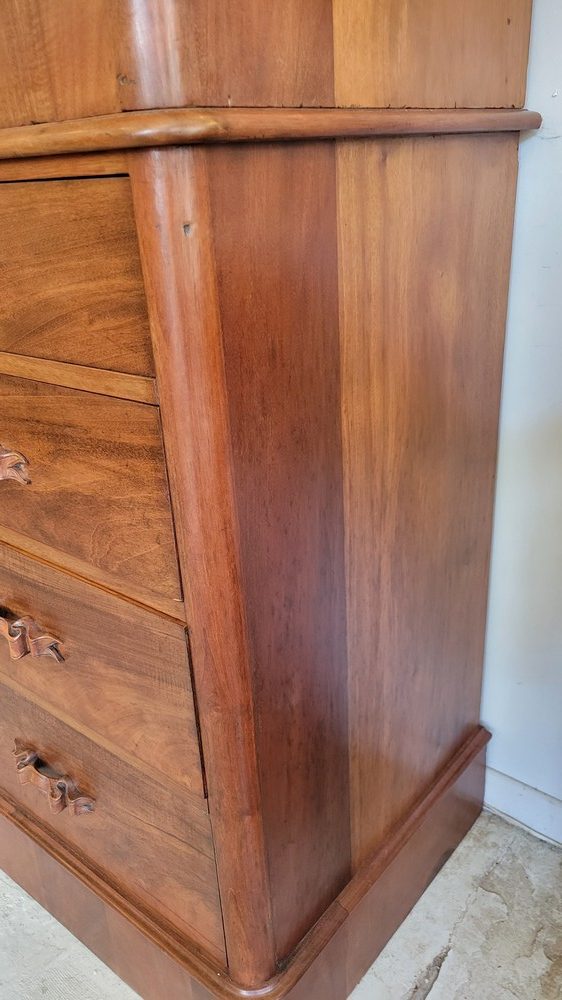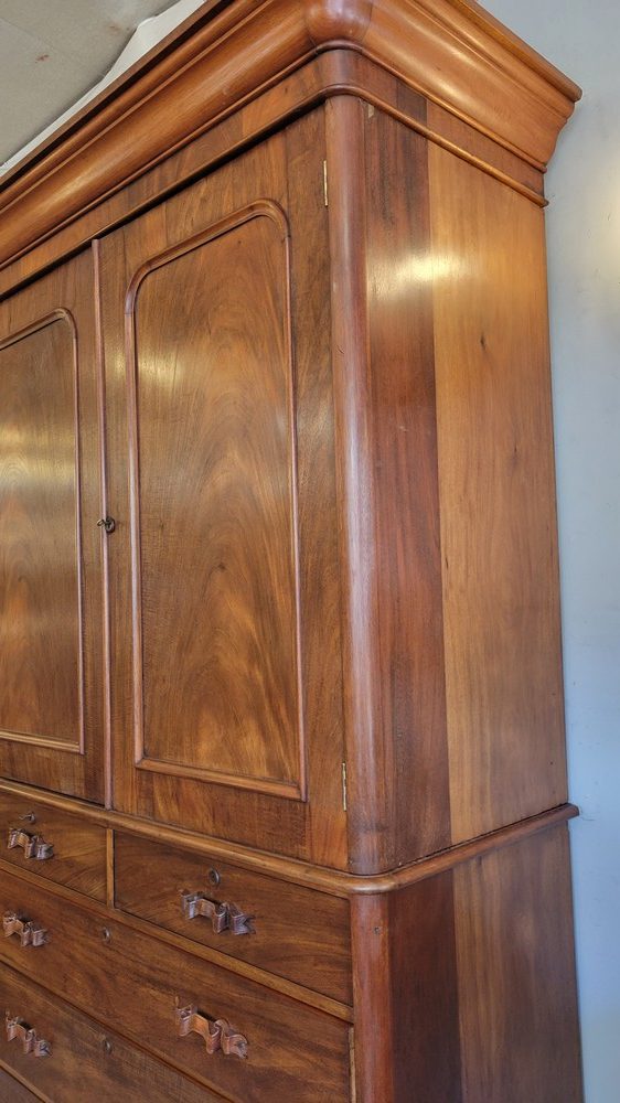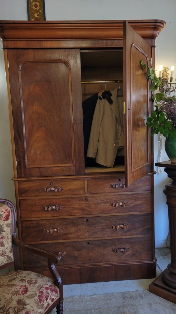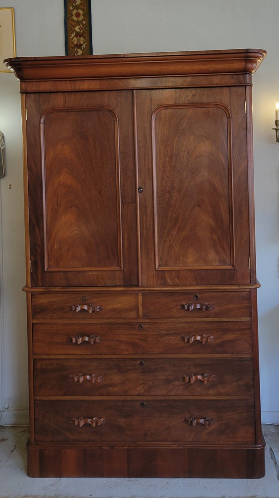 Meuble à 2 corps avec une penderie dans la partie supérieure et 4 tiroirs en partie inférieure, avec des poignée originales. En acajou massif, d’époque XIXè, cette pantalonnière est parfaite pour ranger et organiser ses vêtements. Très bon état. Meuble d’origine anglaise, d’après les inscriptions sur les serrures.