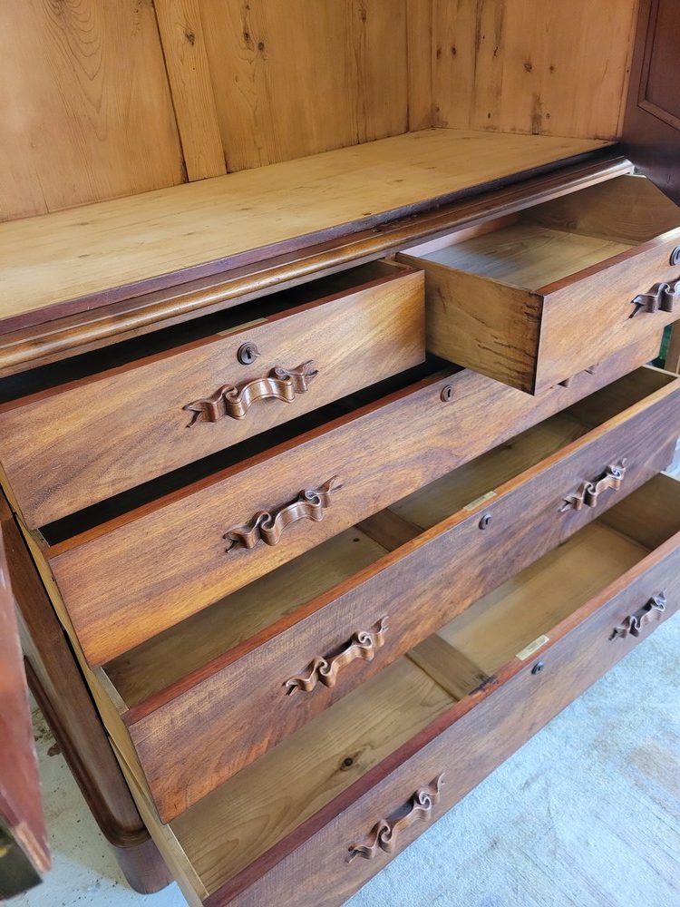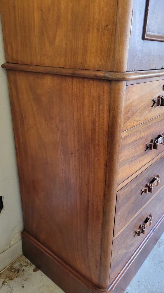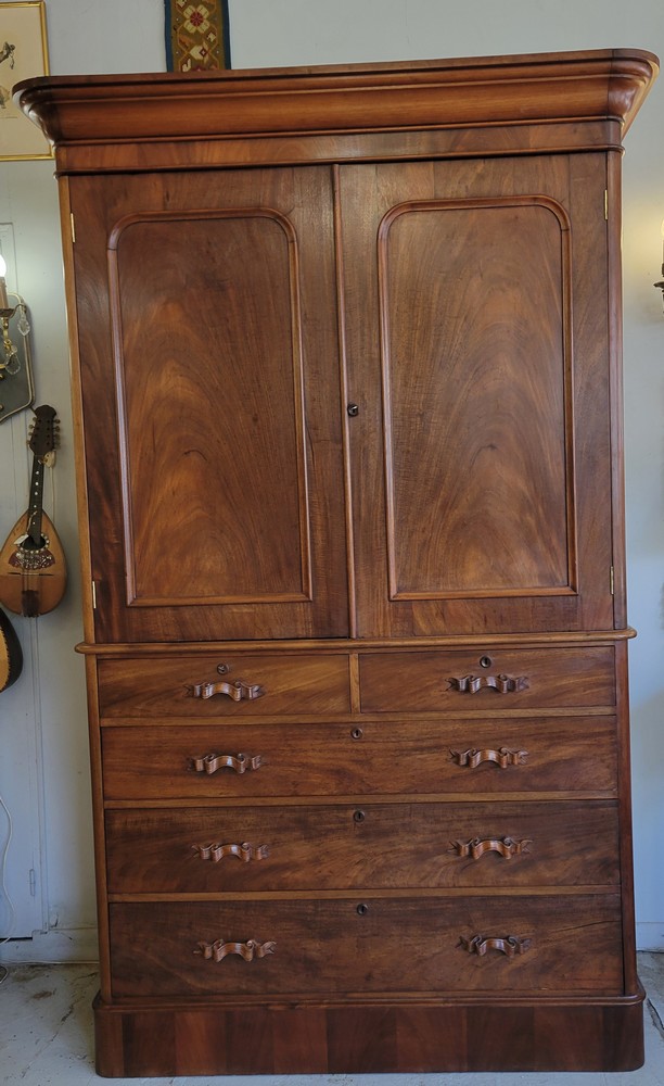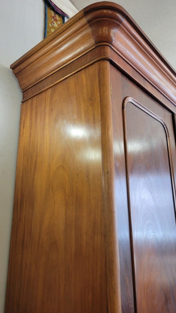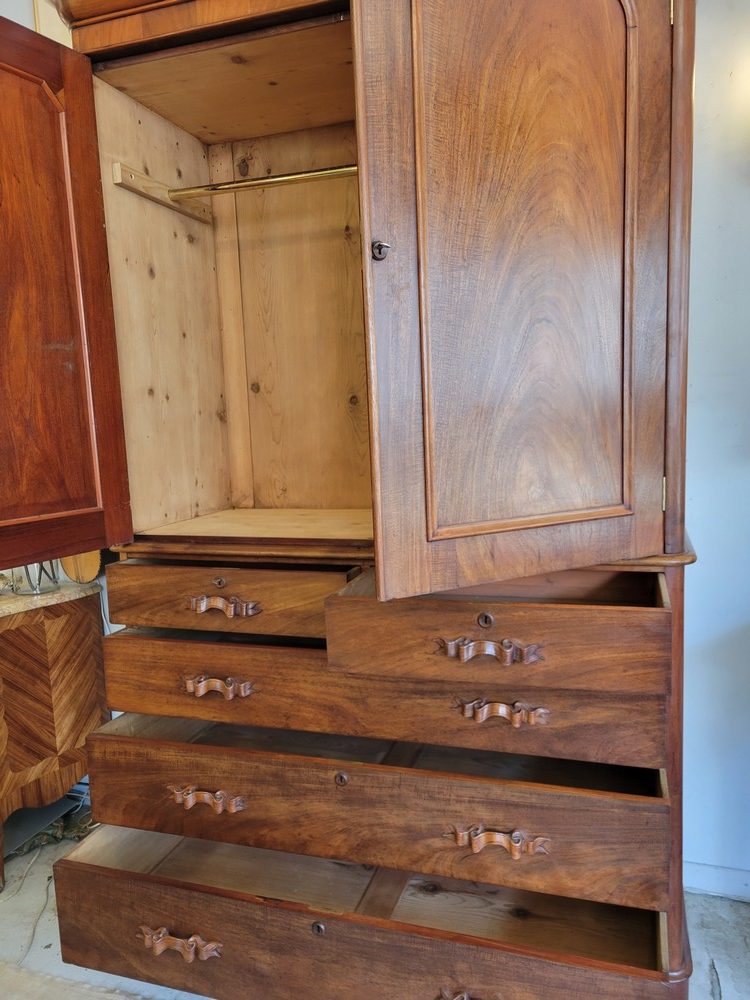 Meuble à 2 corps avec une penderie dans la partie supérieure et 4 tiroirs en partie inférieure, avec des poignée originales. En acajou massif, d’époque XIXè, cette pantalonnière est parfaite pour ranger et organiser ses vêtements. Très bon état. Meuble d’origine anglaise, d’après les inscriptions sur les serrures.