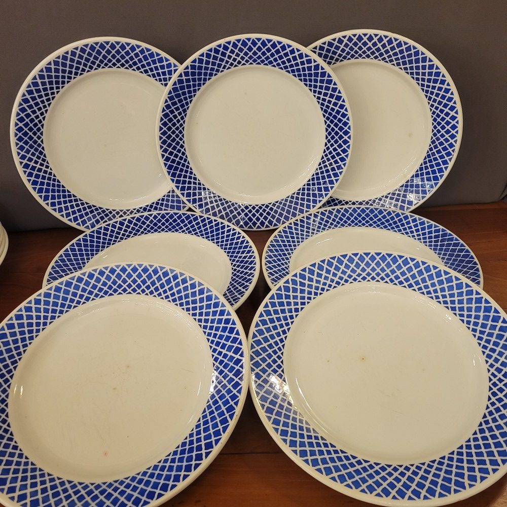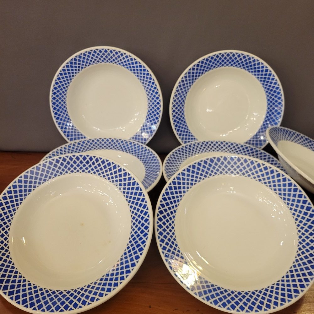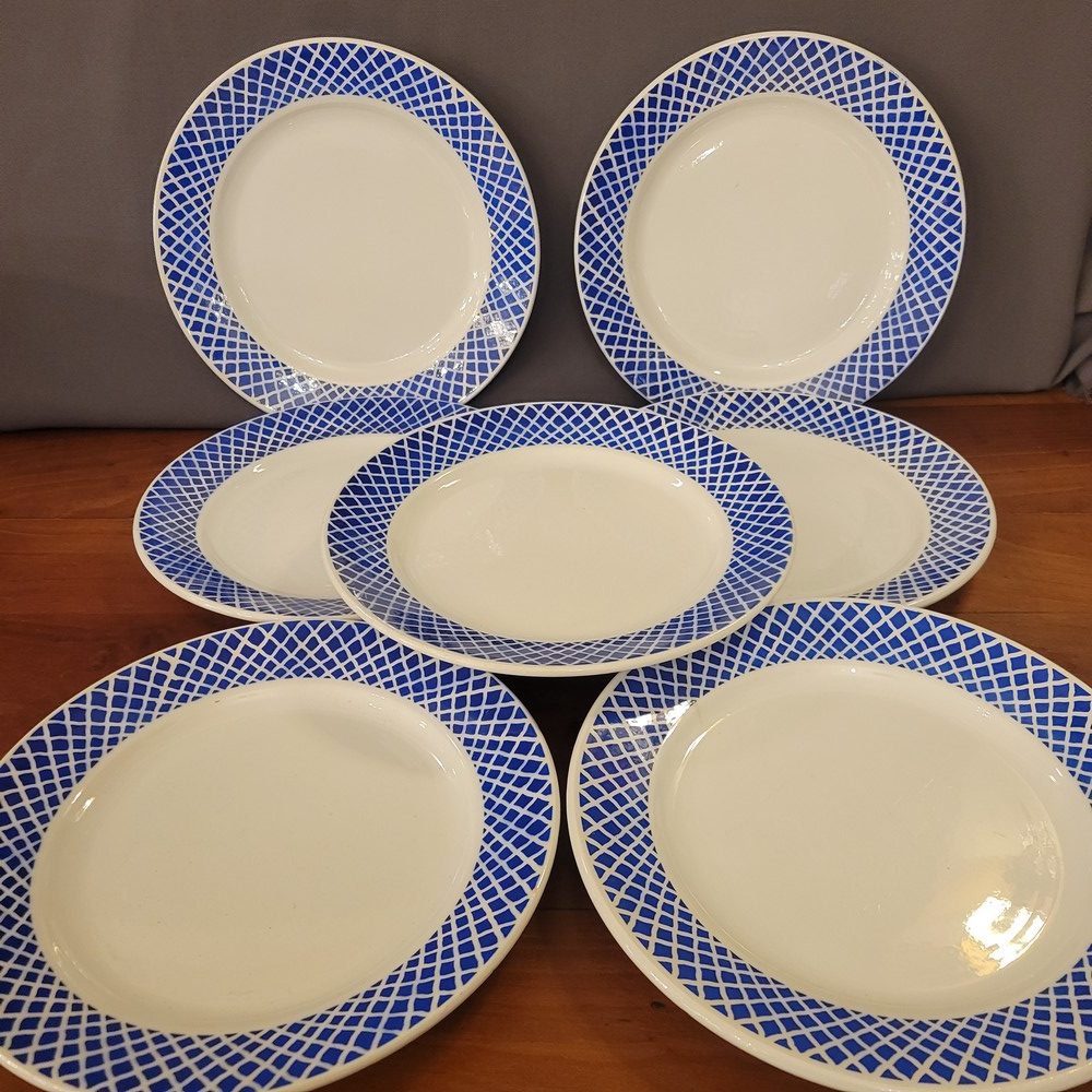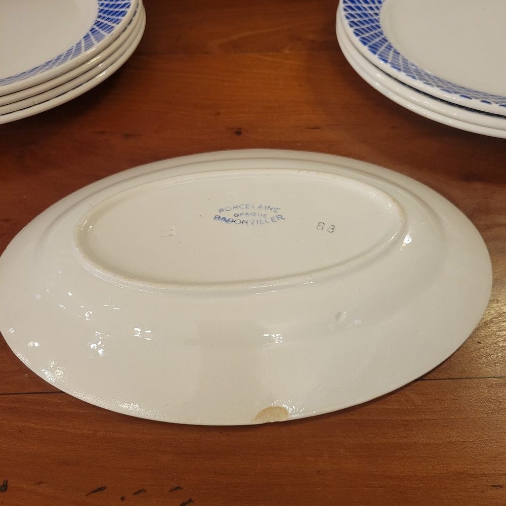 Partie de service en porcelaine opaque de Badonviller. Décor géométrique d’un joli bleu. Composé de 7 assiettes à dessert, 7 assiettes plates, 7 assiettes creuses et 1 ravier. Les assiettes à dessert sont en bon état, le reste de la vaisselle présente des marques d’usage. (petites tâches ou rayures)