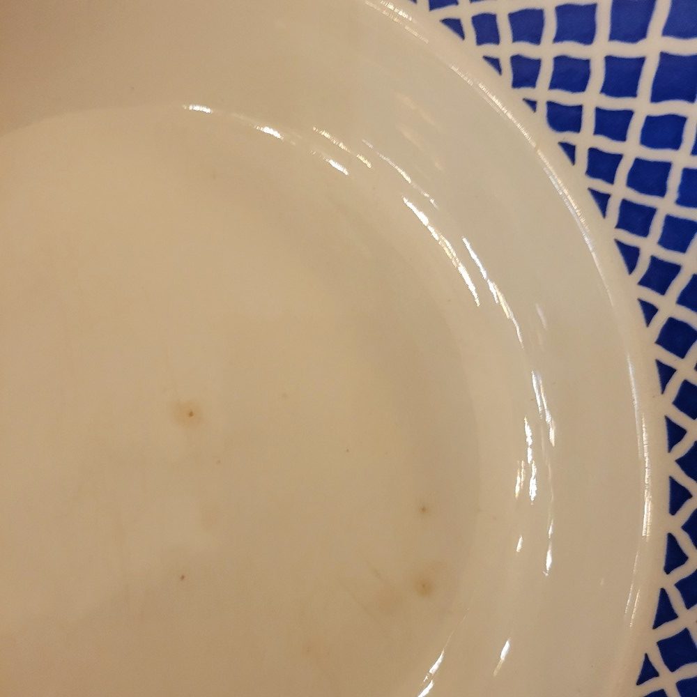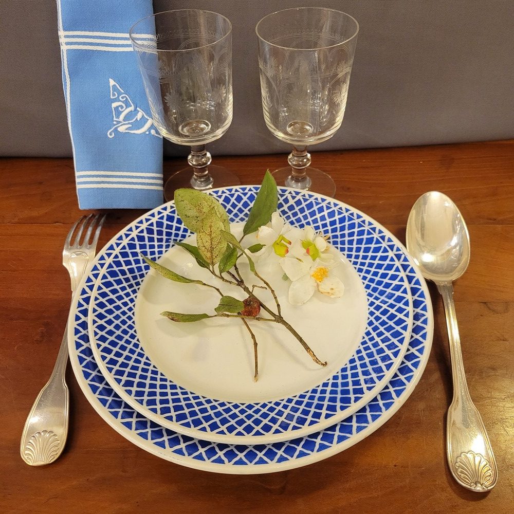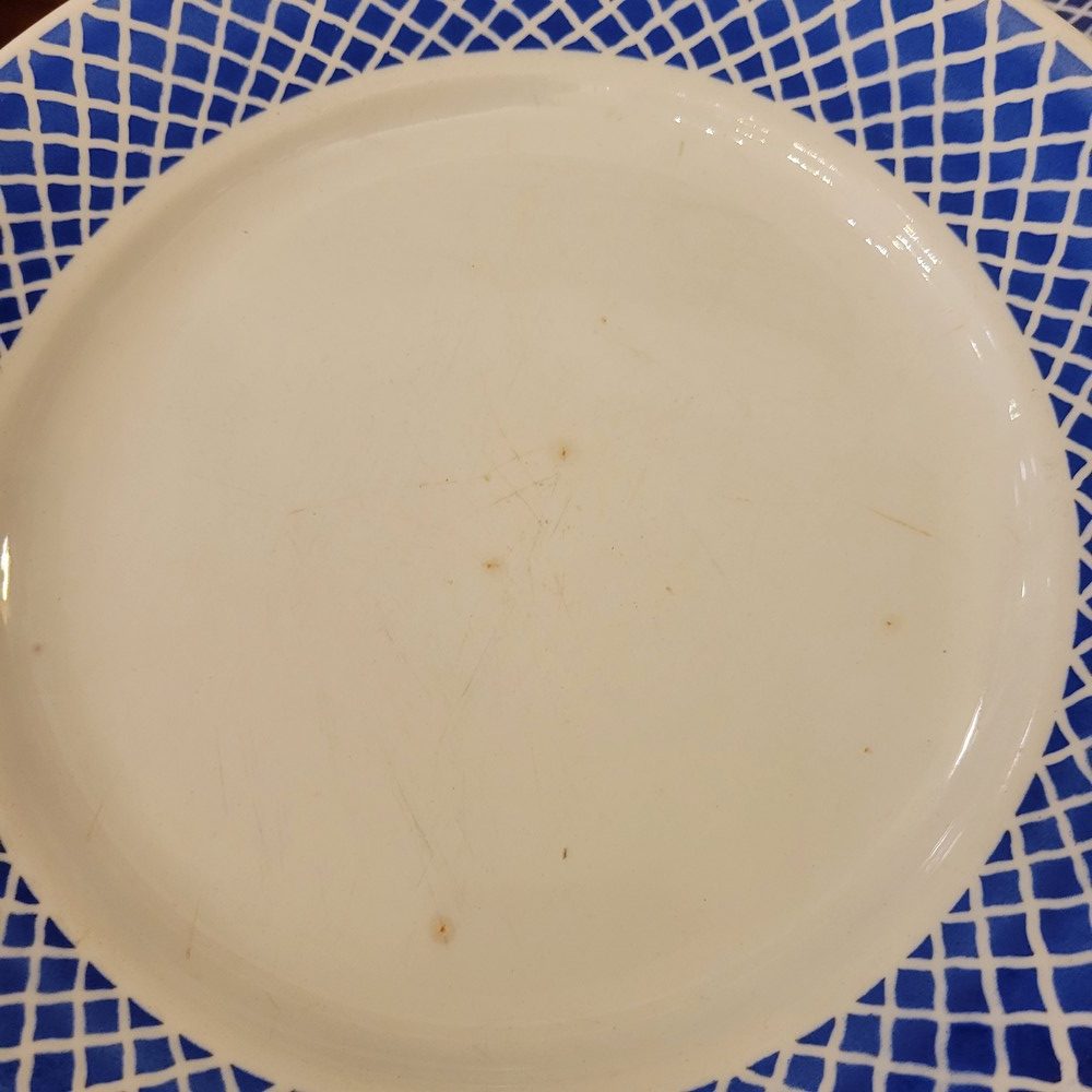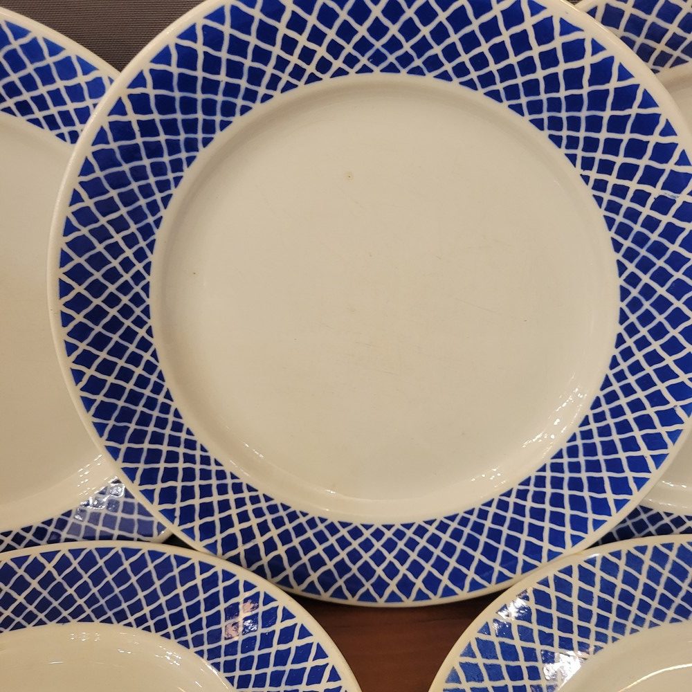 Partie de service en porcelaine opaque de Badonviller. Décor géométrique d’un joli bleu. Composé de 7 assiettes à dessert, 7 assiettes plates, 7 assiettes creuses et 1 ravier. Les assiettes à dessert sont en bon état, le reste de la vaisselle présente des marques d’usage. (petites tâches ou rayures)