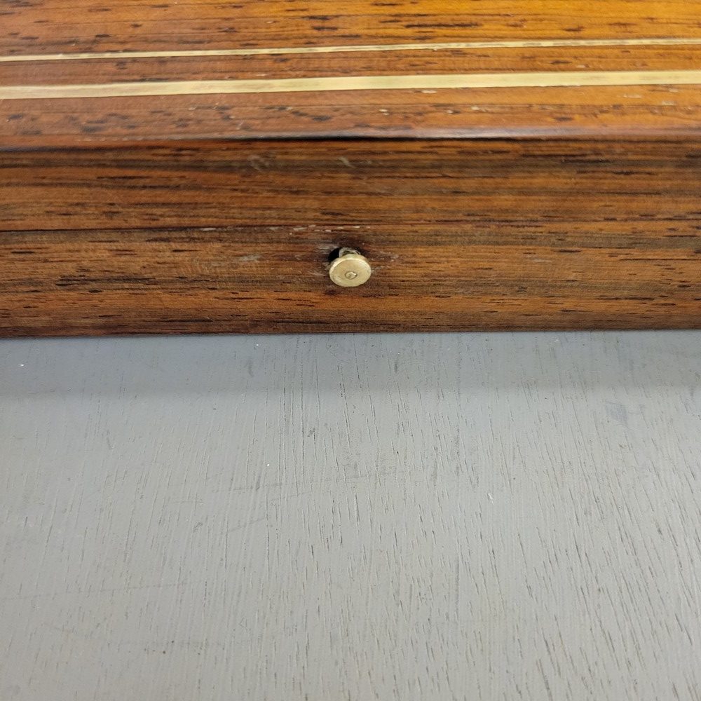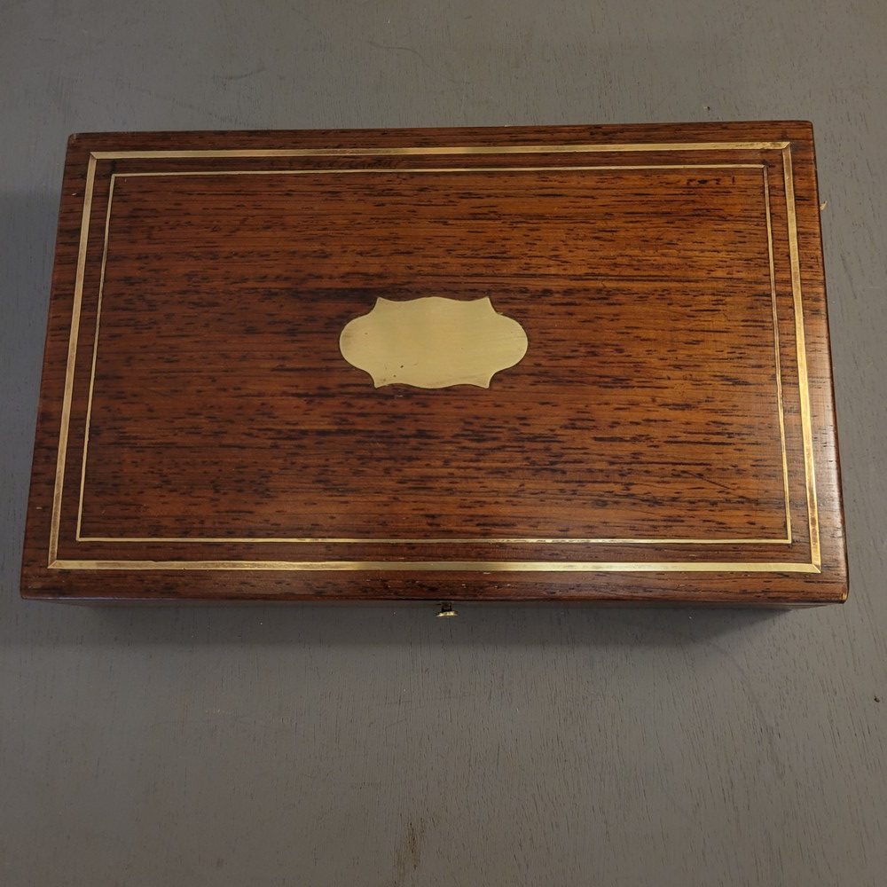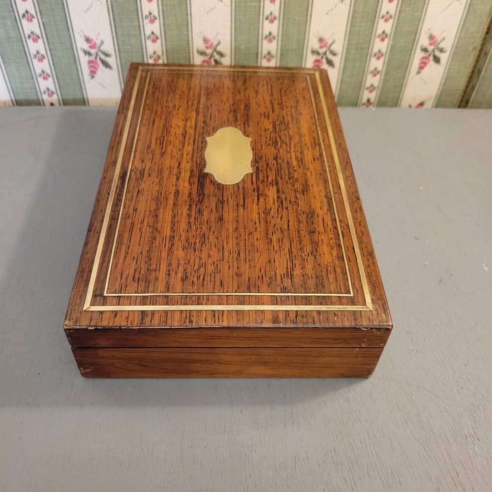 Coffret en Acajou avec incrustations de laiton, d’époque XIXè. Petit bouton fermoir. Intérieur cloisonné. Bon état.