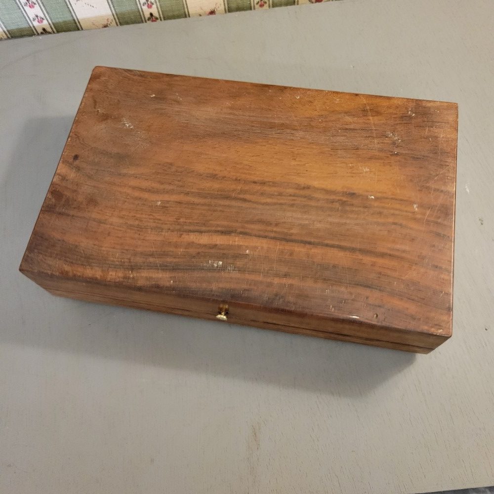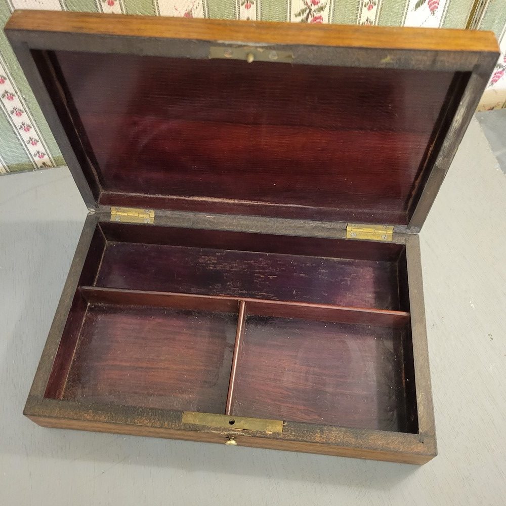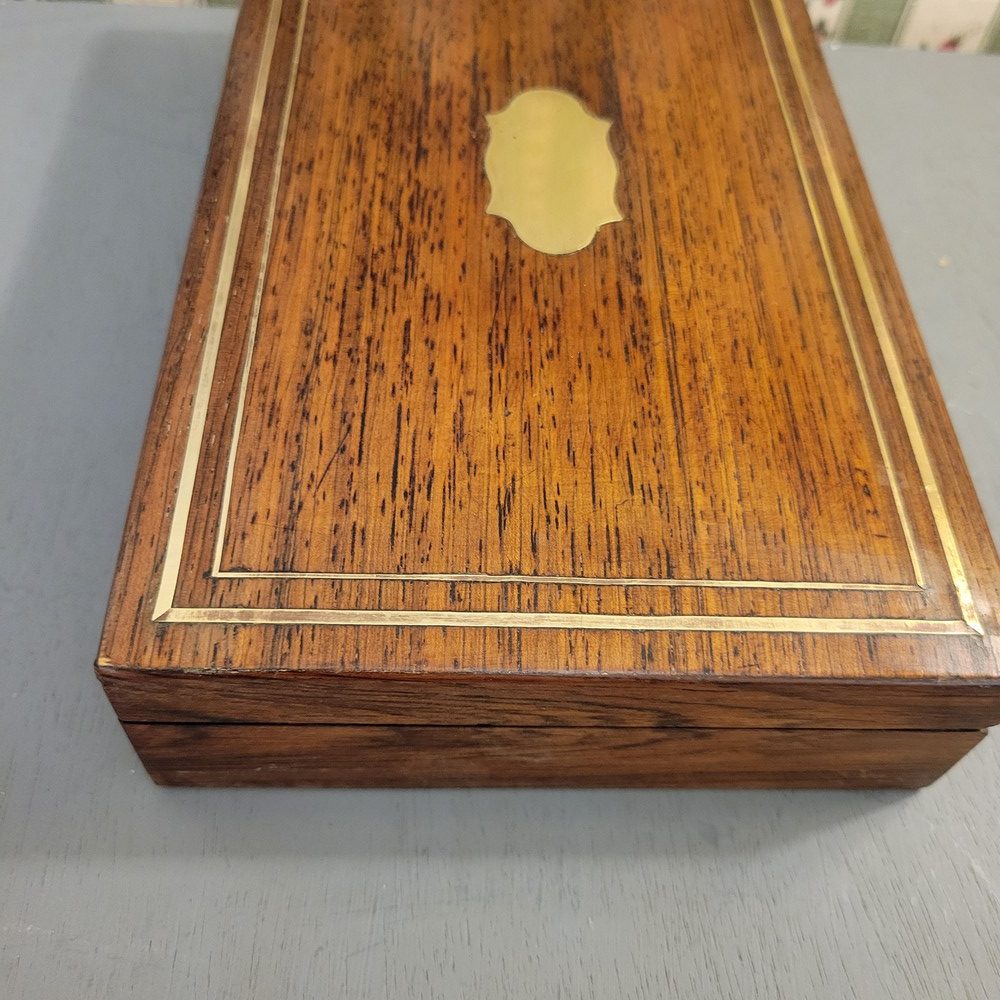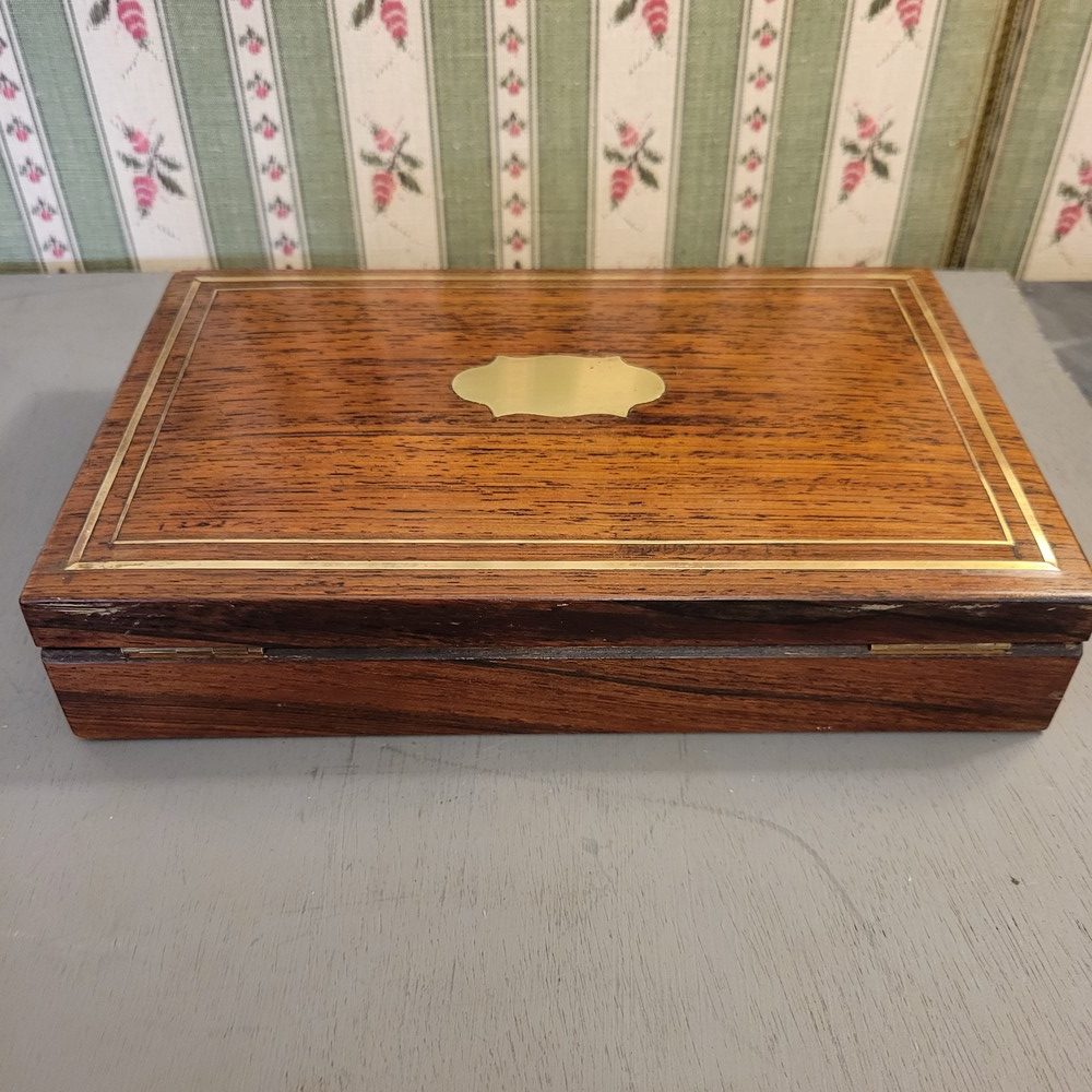 Coffret en Acajou avec incrustations de laiton, d’époque XIXè. Petit bouton fermoir. Intérieur cloisonné. Bon état.