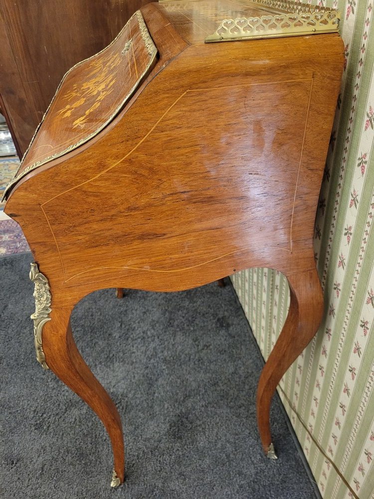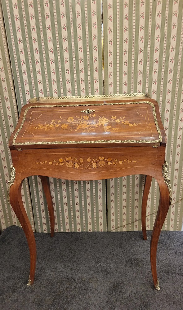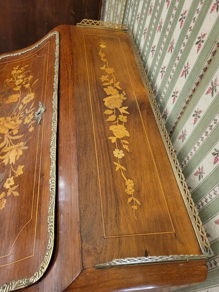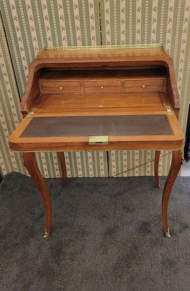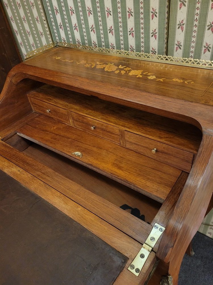 Charmant bonheur du jour ou bureau de dame, de style Louis XV, datant des années 1950. Meuble de qualité en bois de rose, marqueté de motifs floraux. Les garnitures sont en bronze et la galerie en laiton est décorée de petits cœurs.. L’abattant découvre un pupitre en cuir d’origine, ainsi qu’un plateau coulissant et 3 petits tiroirs. L’ensemble est en bon état.