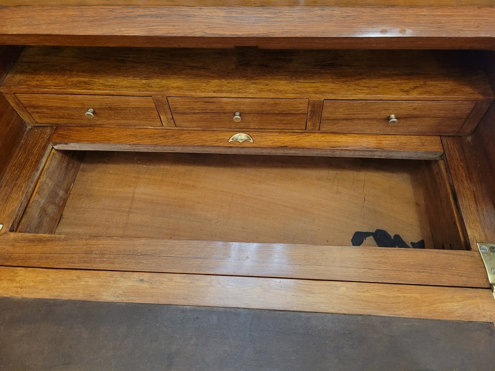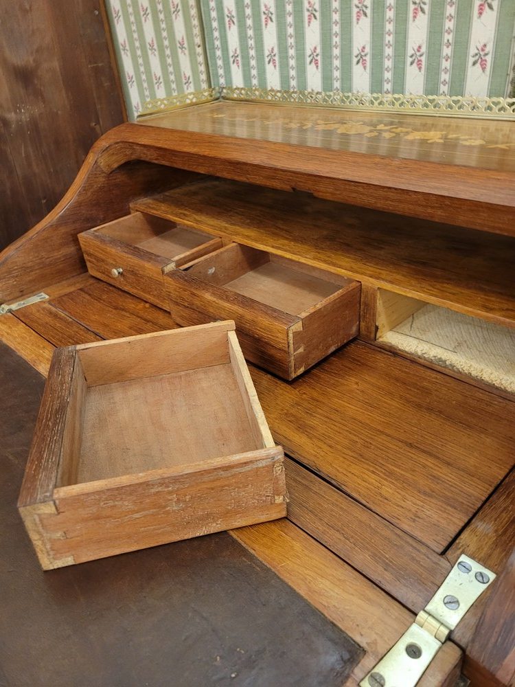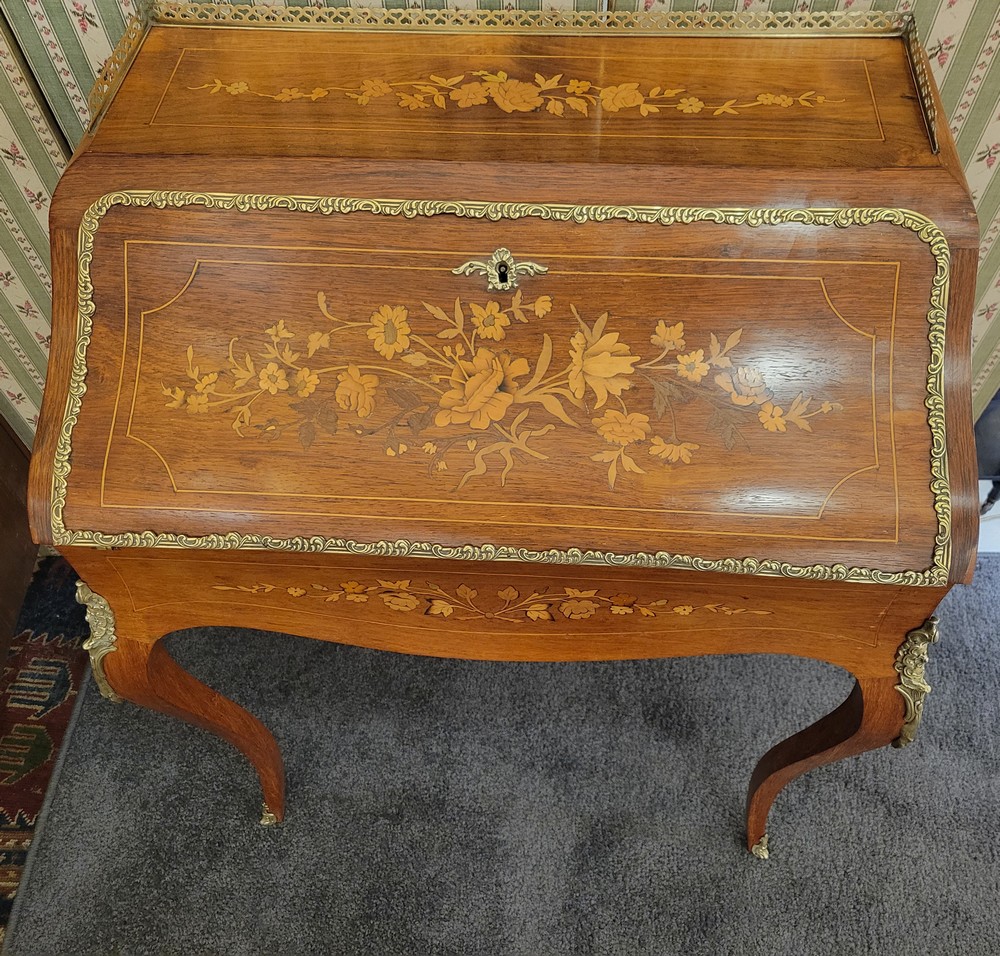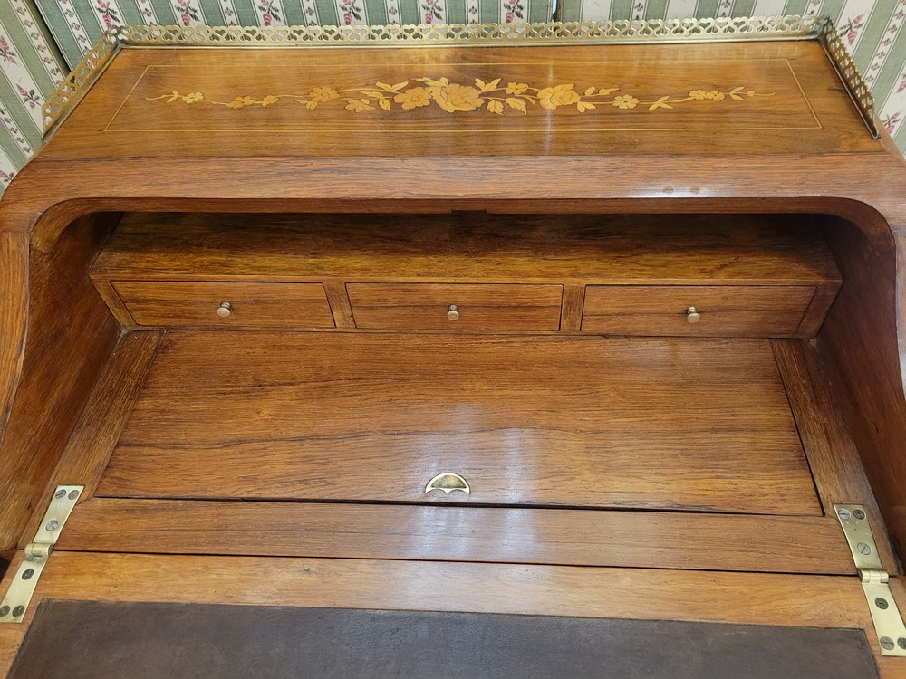 Charmant bonheur du jour ou bureau de dame, de style Louis XV, datant des années 1950. Meuble de qualité en bois de rose, marqueté de motifs floraux. Les garnitures sont en bronze et la galerie en laiton est décorée de petits cœurs.. L’abattant découvre un pupitre en cuir d’origine, ainsi qu’un plateau coulissant et 3 petits tiroirs. L’ensemble est en bon état.