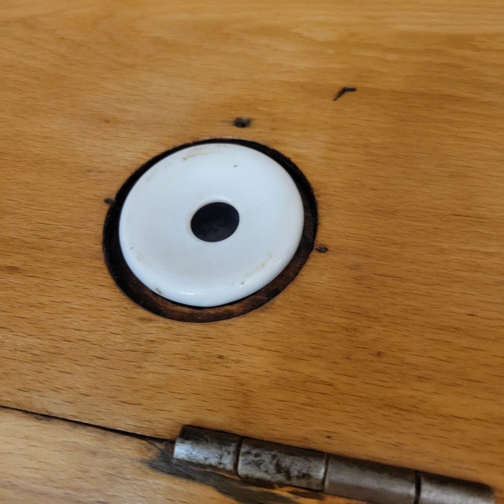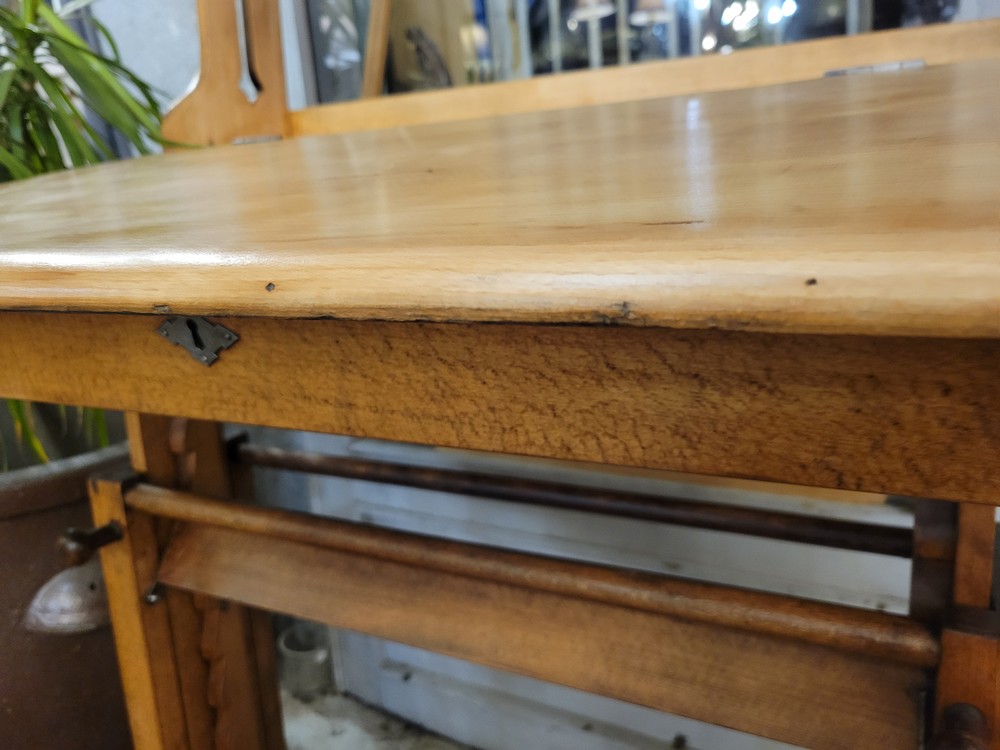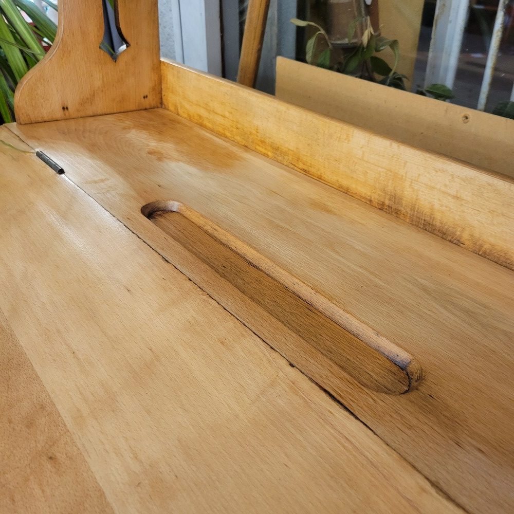 Bureau d’écolier évolutif des années 1940, en hêtre massif. La chaise attenante et amovible au bureau se règle en hauteur (4 niveaux) et le pupitre propose 9 niveaux de hauteur. Ce meuble suit donc la croissance de l’enfant et fonctionne également pour un adulte. La position la plus haute permet même de travailler debout. Le plateau se soulève pour dévoiler un casier de rangement. Un emplacement est prévu pour ranger les crayons et un autre pour l’encrier en porcelaine. Il est surmonté d’une étagère pour exposer des livres. Ce meuble déco et pratique est en très bon état.