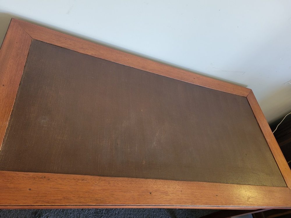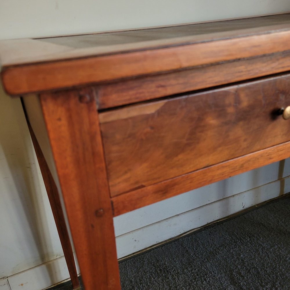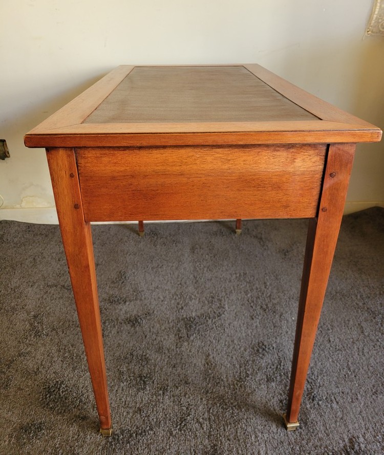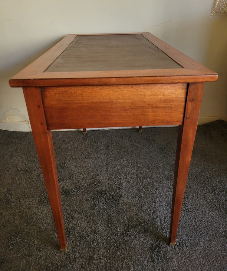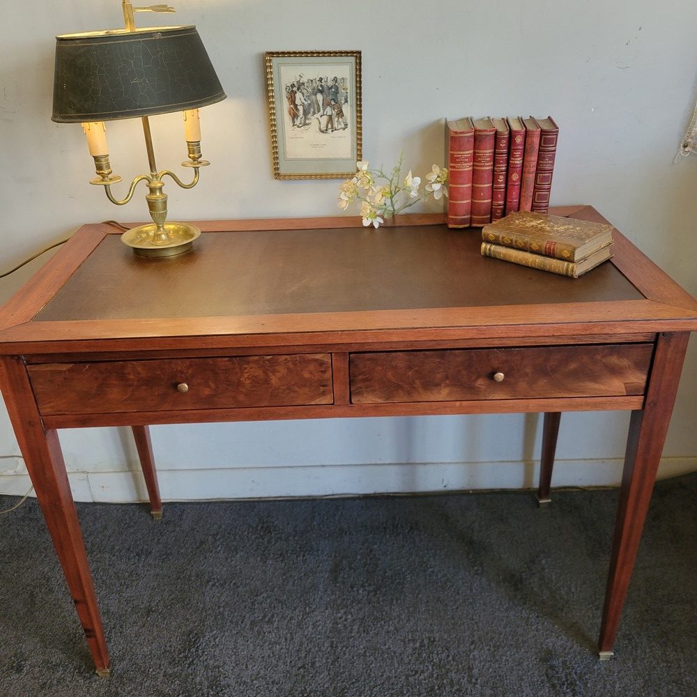 Bureau de style Directoire, en acajou. Modèle de milieu, sobre et classique. Plateau refait en skaï. 2 tiroirs en façade.
