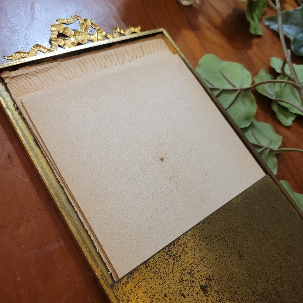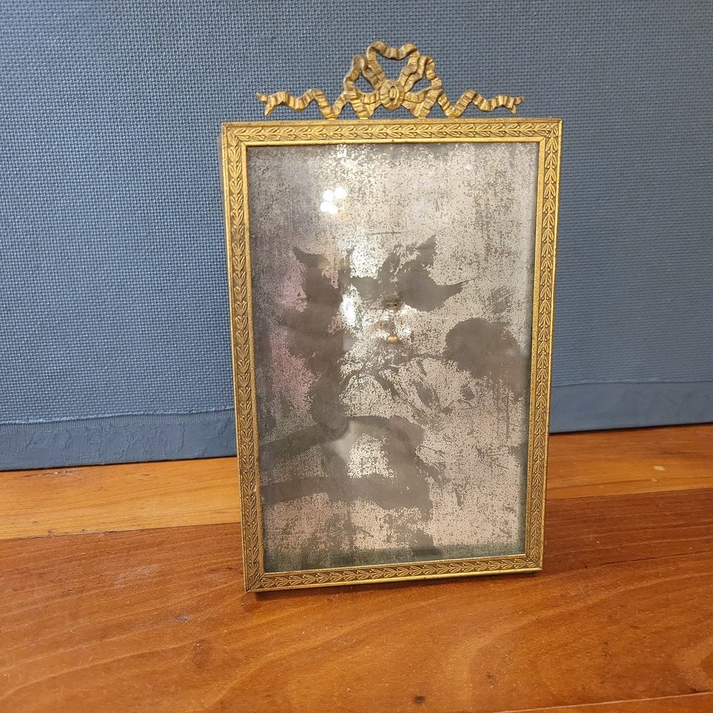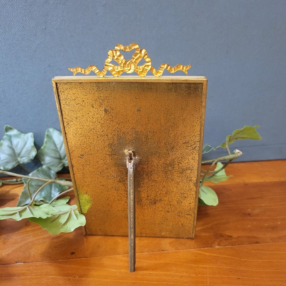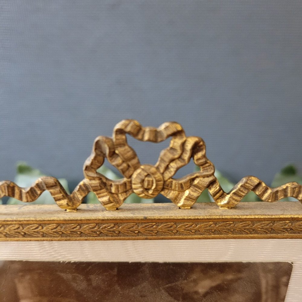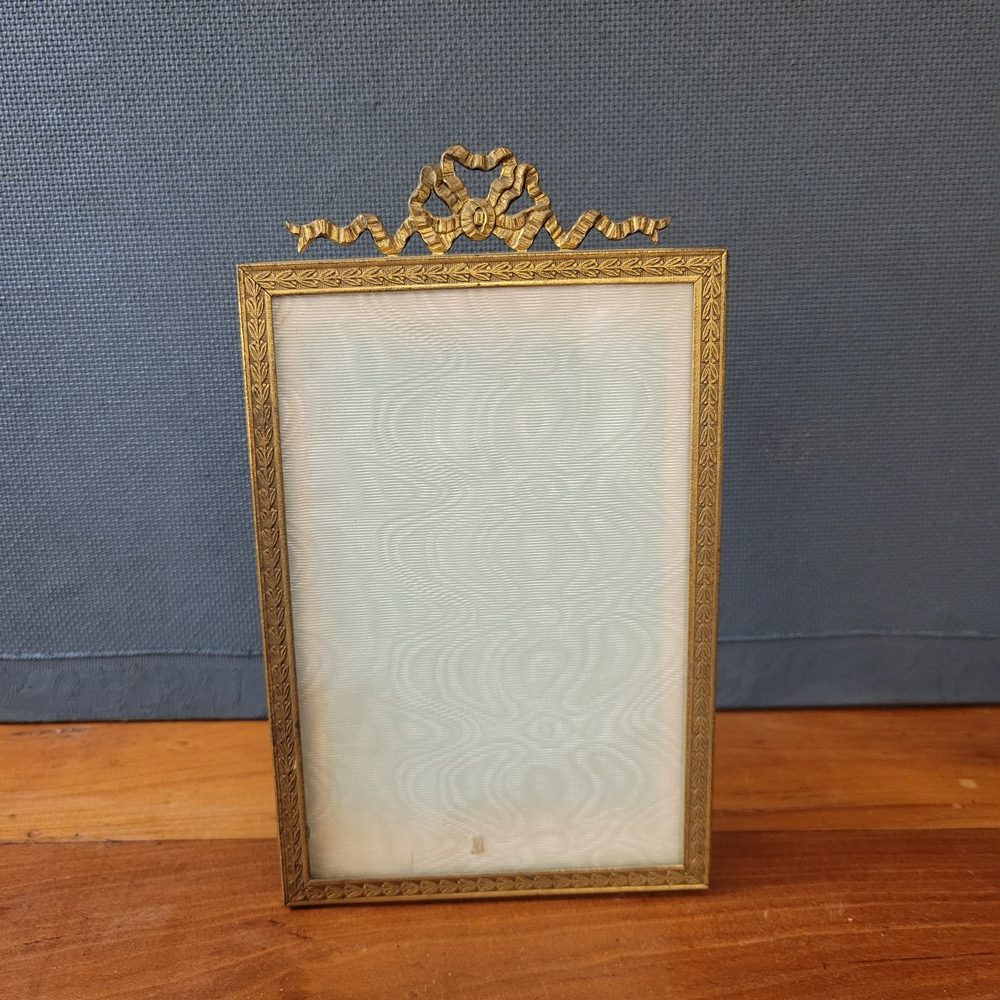 Cadre photo ancien, vitré, avec un fronton en laiton au décor de ruban. Il permet de présenter 1 photo rectangulaire et verticale. Cadre à poser.