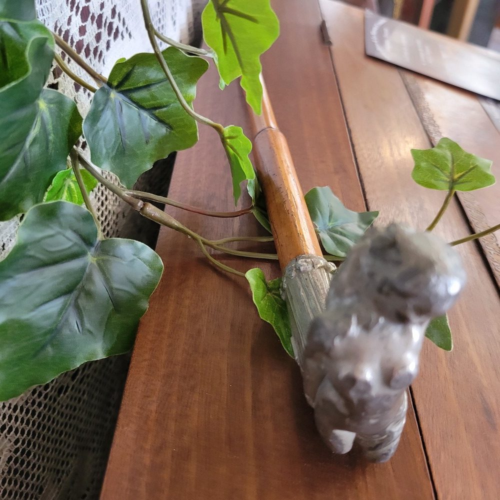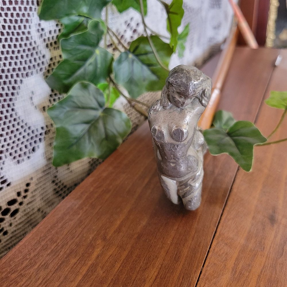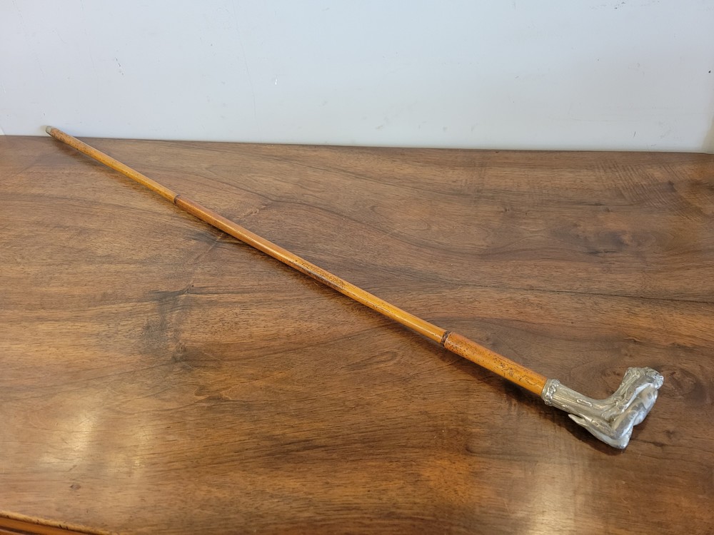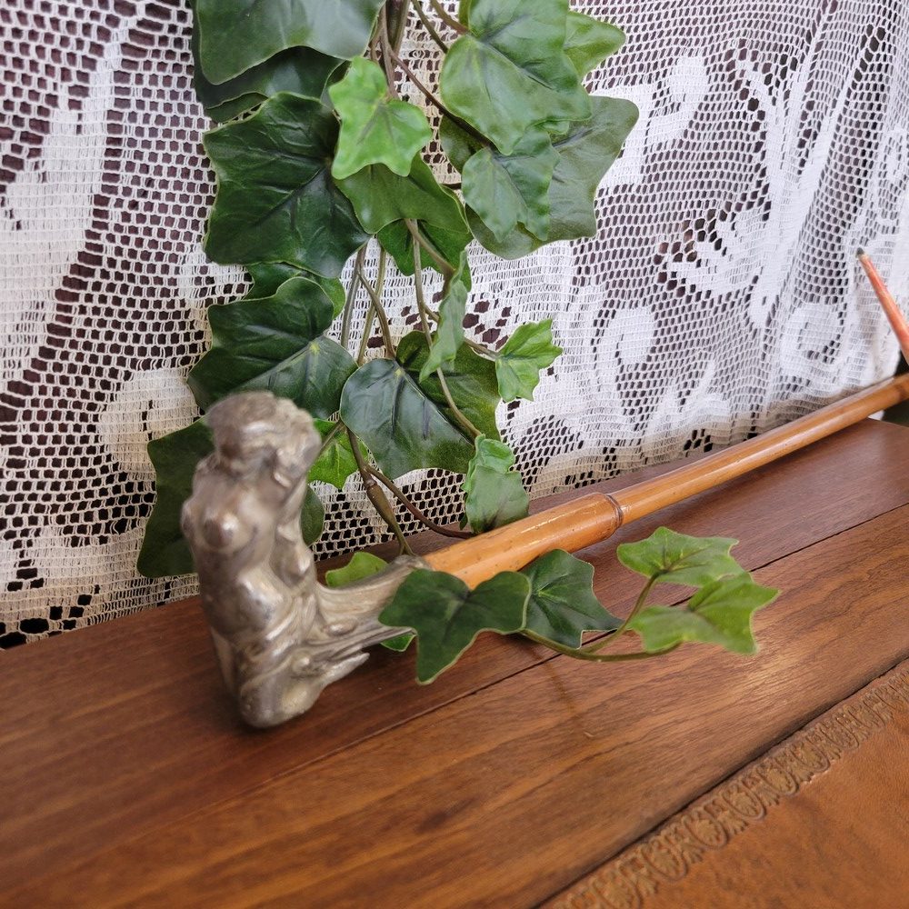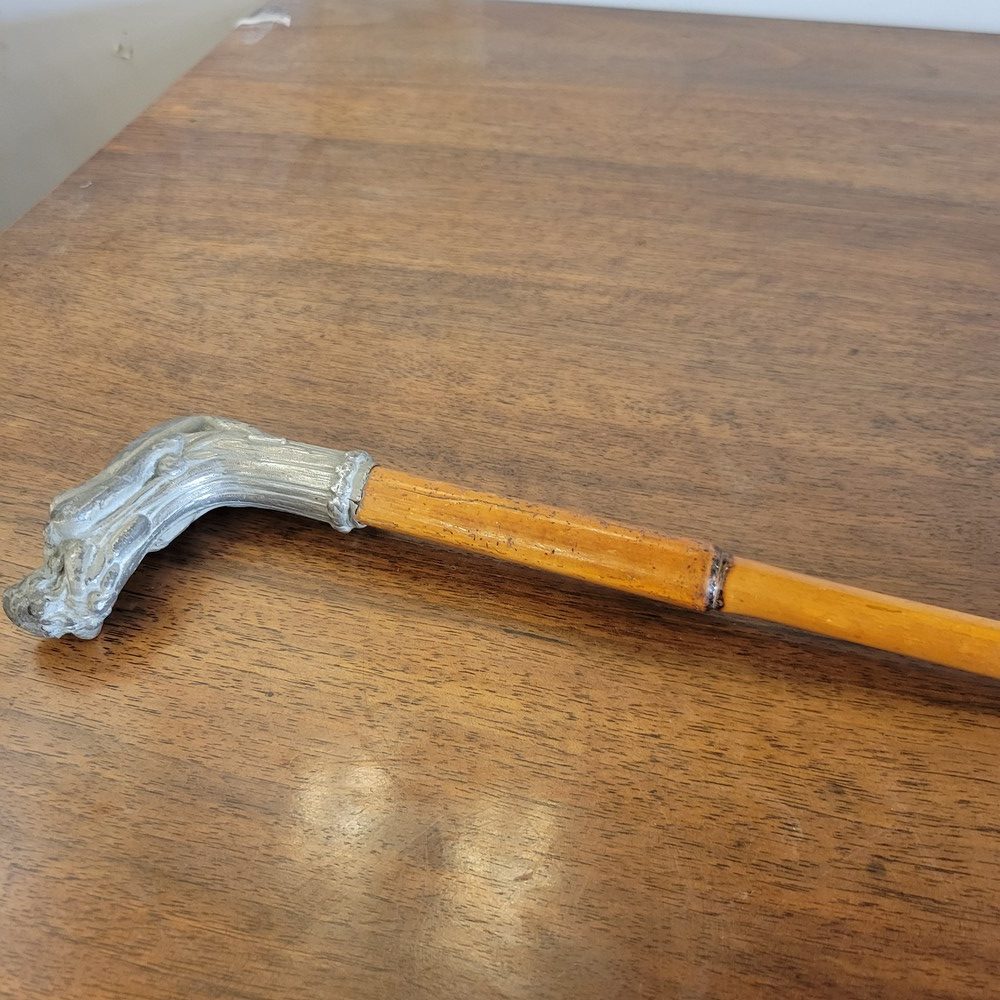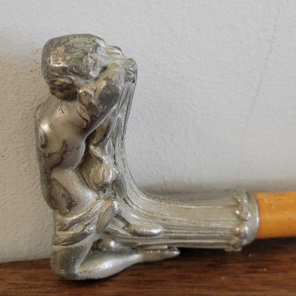 Canne d’apparat en bois (bambou?) avec un pommeau représentant une femme nue couchée dans des roseaux. Une belle ondine en métal gris (peut-être de l’étain…) qui rappelle le style Art-Nouveau. Epoque 1900.