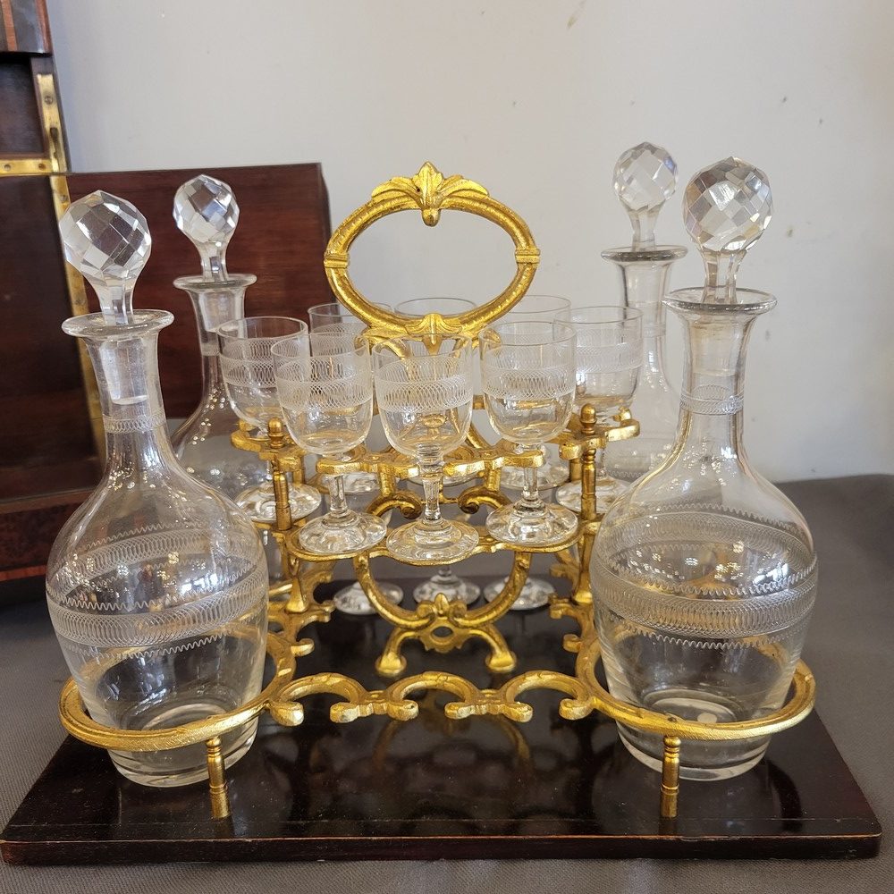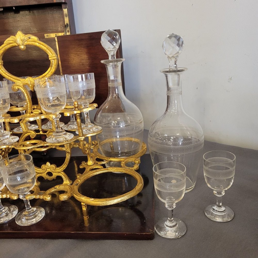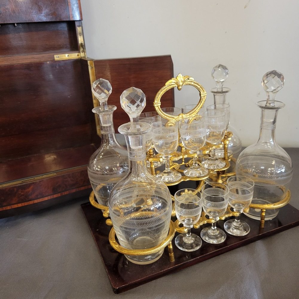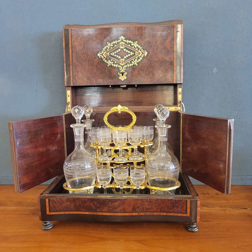 Cave à Liqueur XIXè, d’époque Napoléon III. Service de 16 verres et 4 carafes en cristal gravé de chez Saint Louis. Présence de 2 étiquettes d’origine sous 2 carafes. Tout est en bon état mais il manque 3 verres. Beau coffret en placage de loupe d’amboine avec marqueterie de laiton, de nacre et de palissandre; Egalement en bon état. La clé fonctionne, l’abattant s’ouvre en pinçant la charnière de gauche.