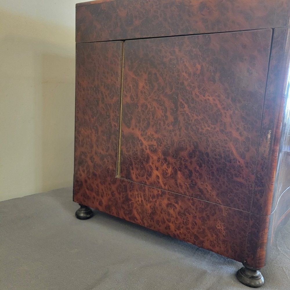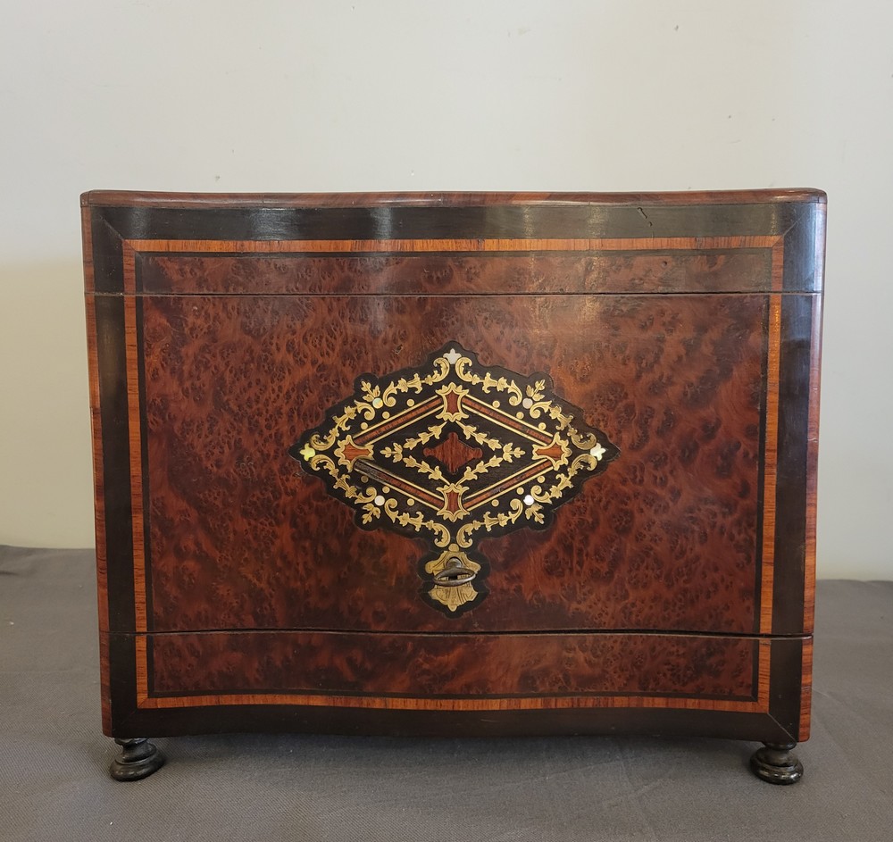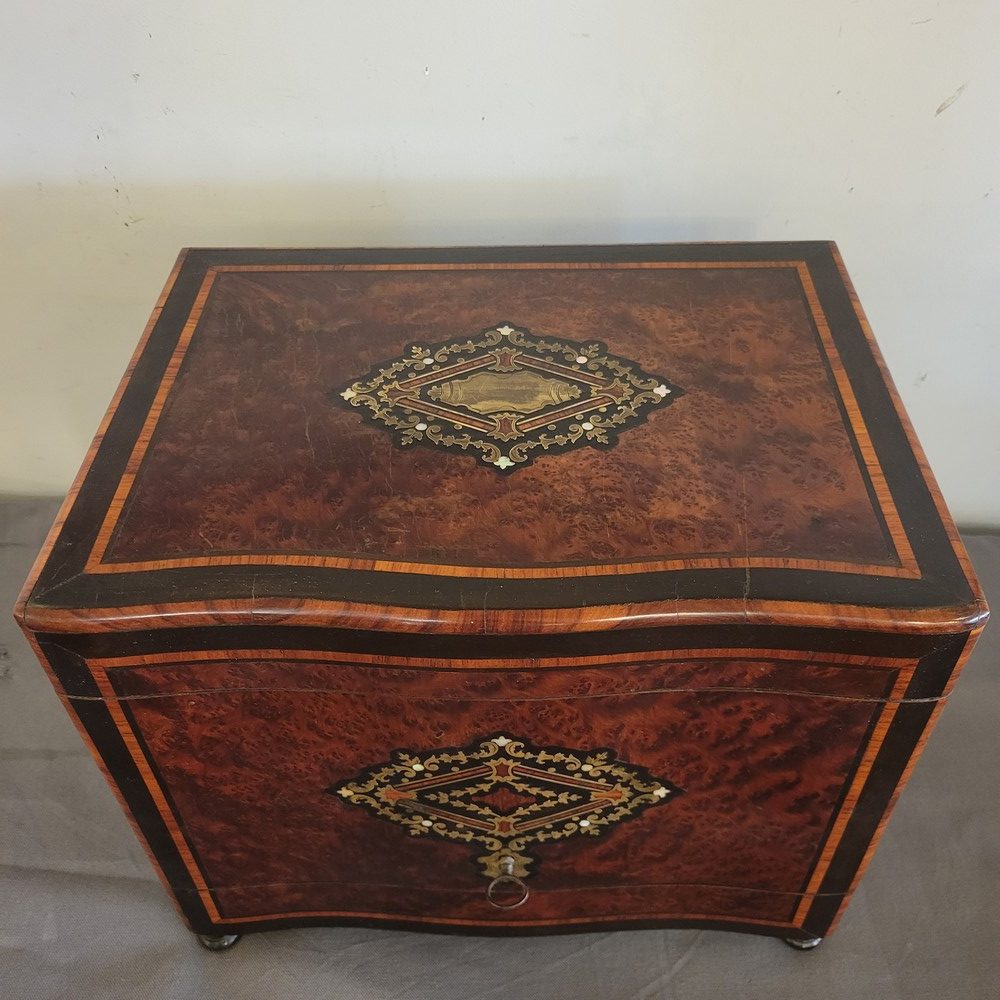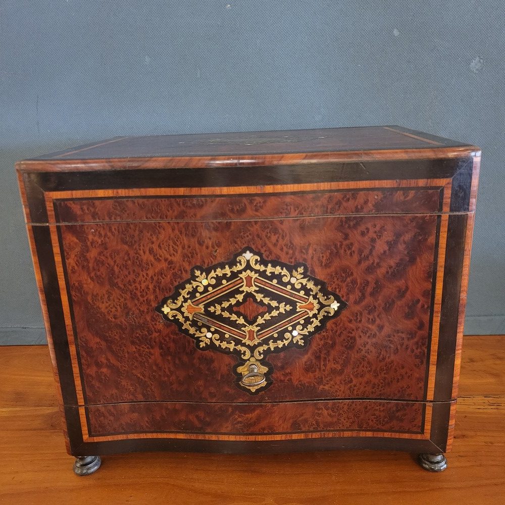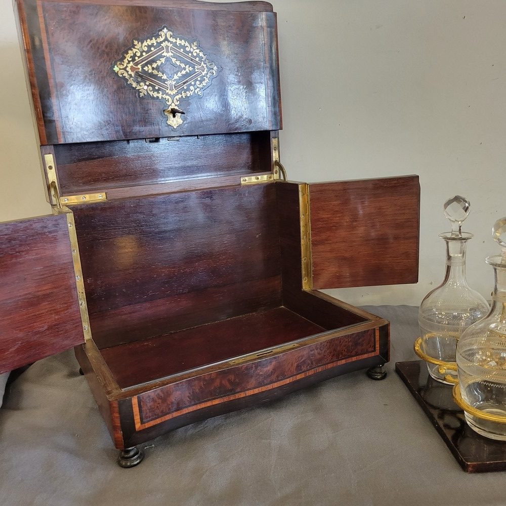 Cave à Liqueur XIXè, d’époque Napoléon III. Service de 16 verres et 4 carafes en cristal gravé de chez Saint Louis. Présence de 2 étiquettes d’origine sous 2 carafes. Tout est en bon état mais il manque 3 verres. Beau coffret en placage de loupe d’amboine avec marqueterie de laiton, de nacre et de palissandre; Egalement en bon état. La clé fonctionne, l’abattant s’ouvre en pinçant la charnière de gauche.