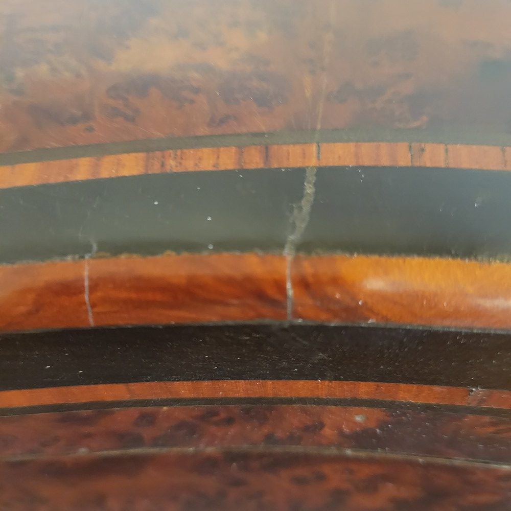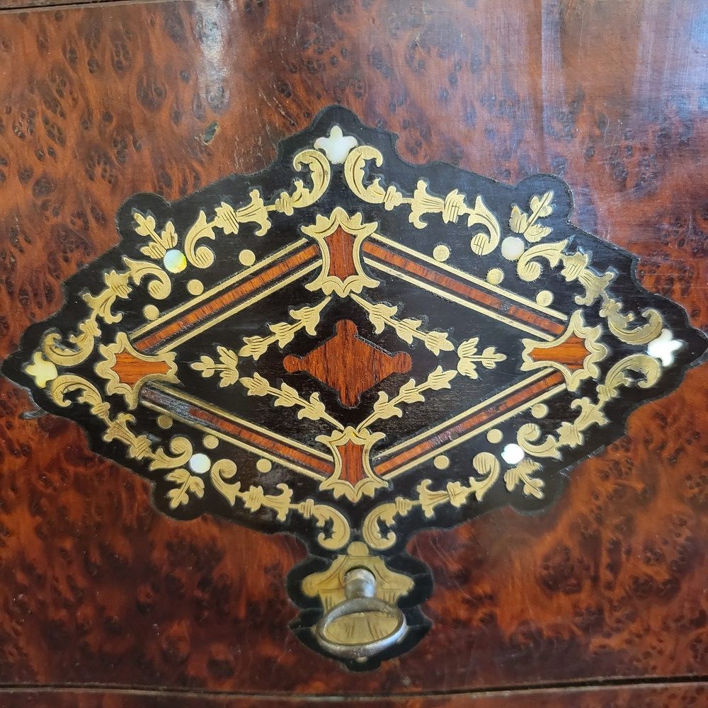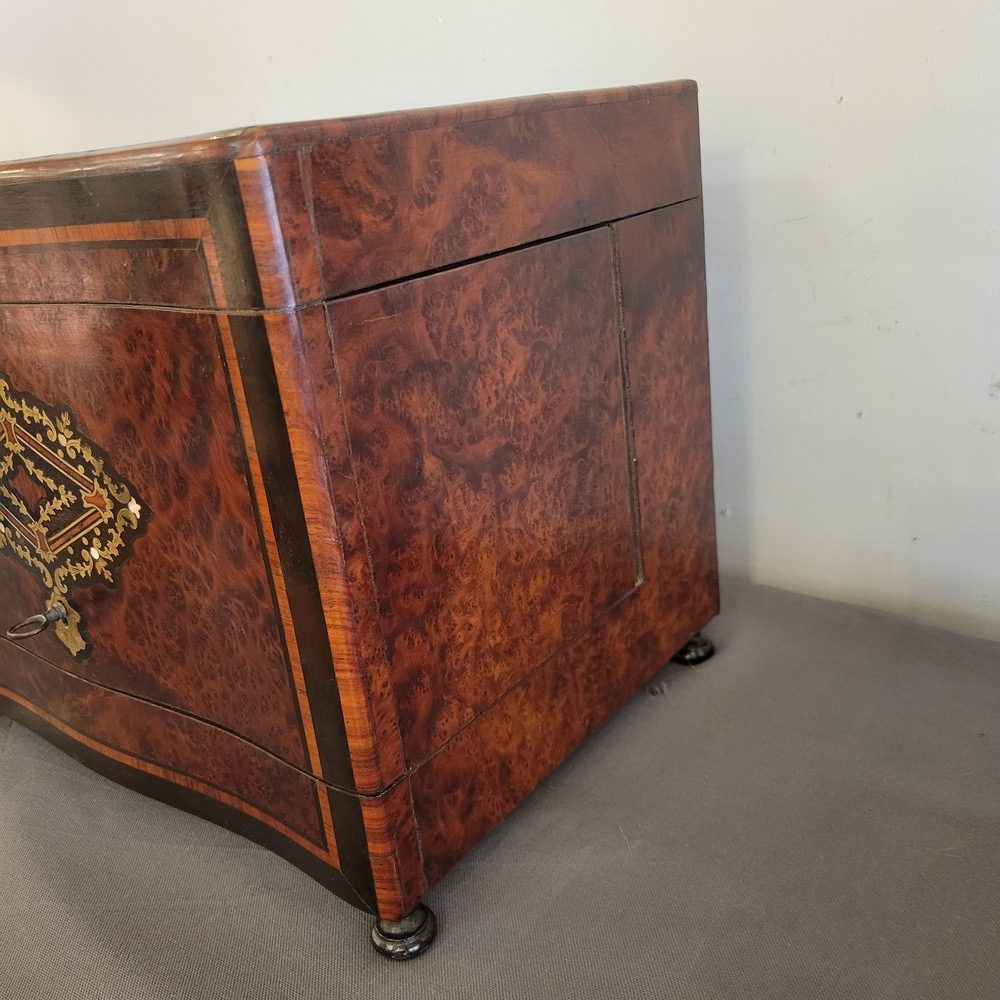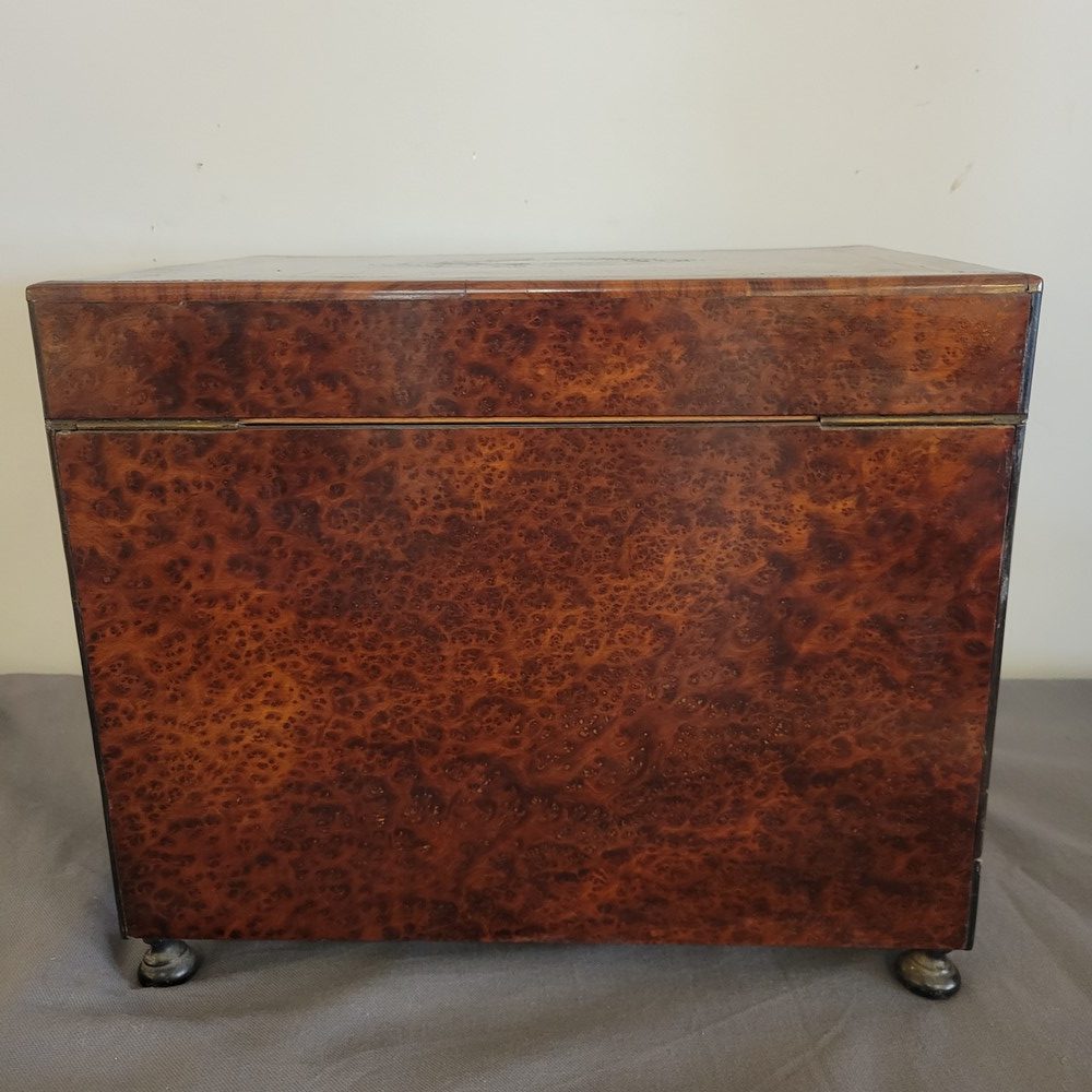 Cave à Liqueur XIXè, d’époque Napoléon III. Service de 16 verres et 4 carafes en cristal gravé de chez Saint Louis. Présence de 2 étiquettes d’origine sous 2 carafes. Tout est en bon état mais il manque 3 verres. Beau coffret en placage de loupe d’amboine avec marqueterie de laiton, de nacre et de palissandre; Egalement en bon état. La clé fonctionne, l’abattant s’ouvre en pinçant la charnière de gauche.