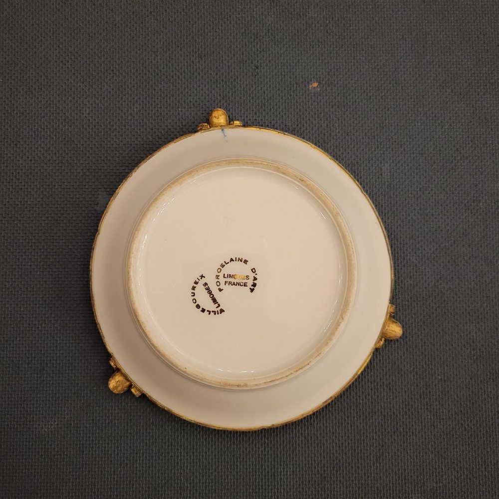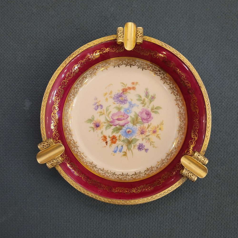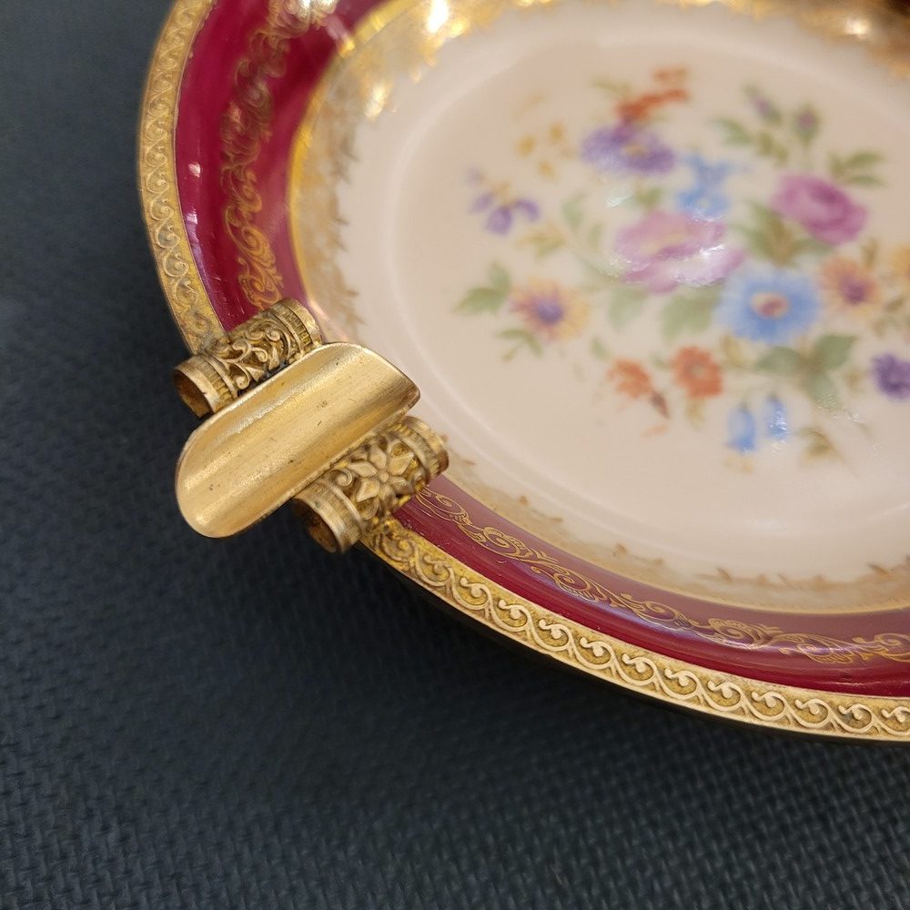 Cendrier en porcelaine de Limoges, cerclé de laiton. Années 1950. Décor central de fleurs, signé au dos Porcelaine d’art Villegoureix Limoges. Très bon état.
