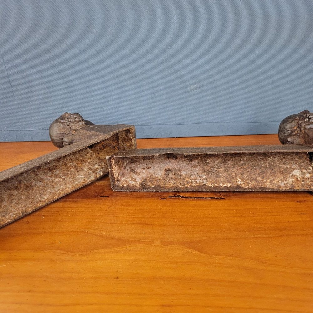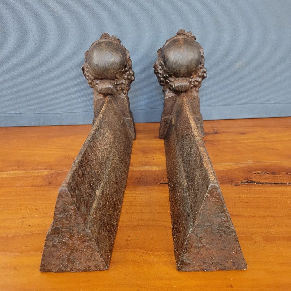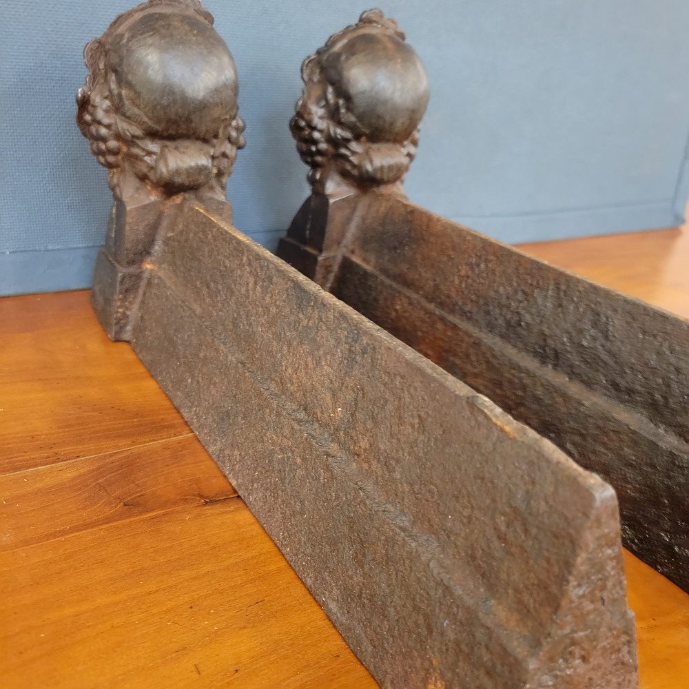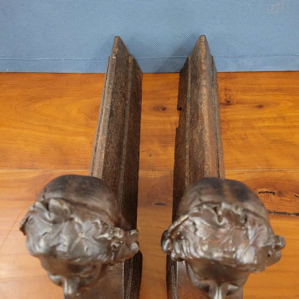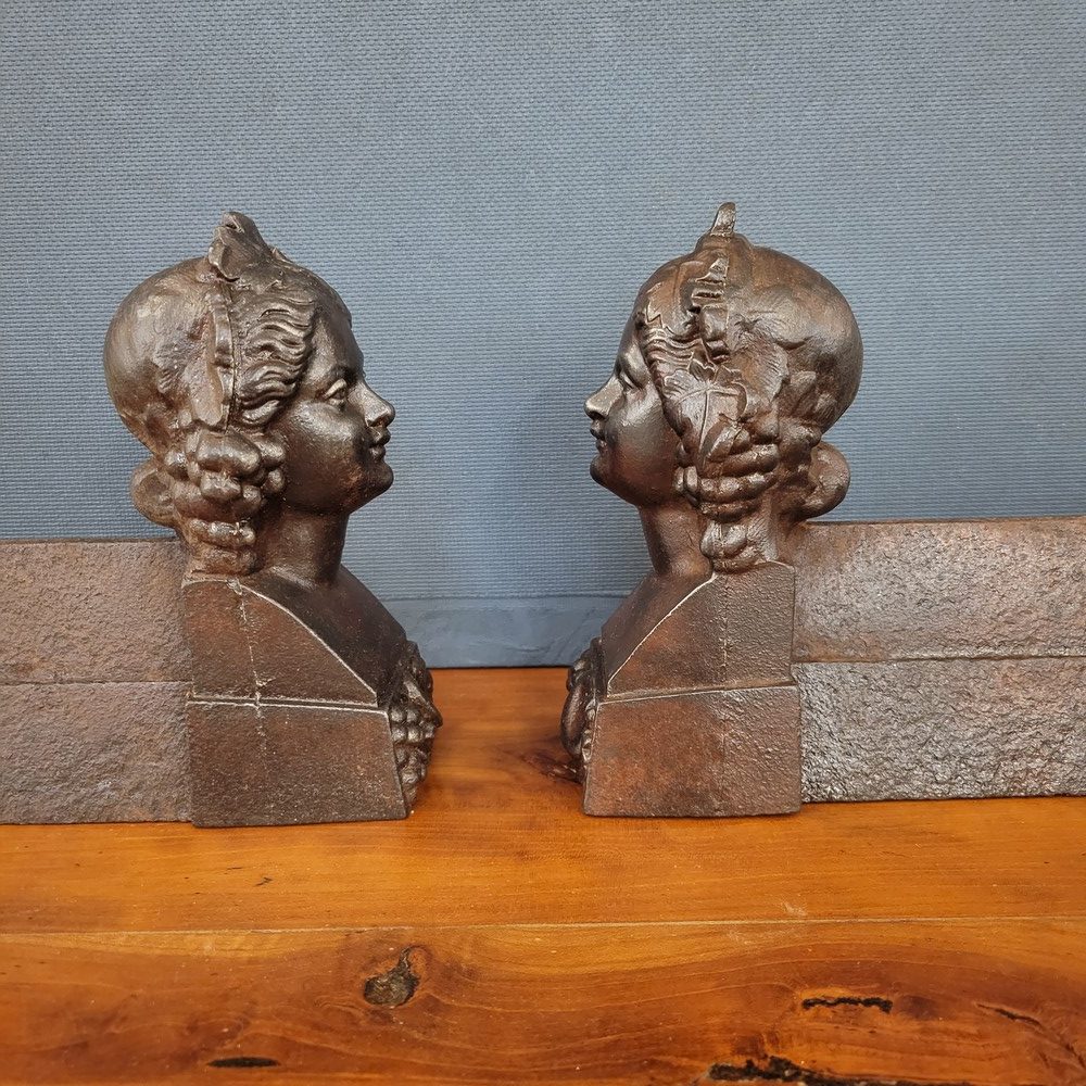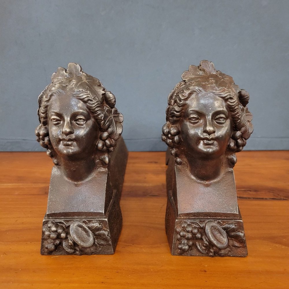 Paire de petits chenets avec buste de femme. Epoque XIXè, en fonte. Une barre un peu abimée.
