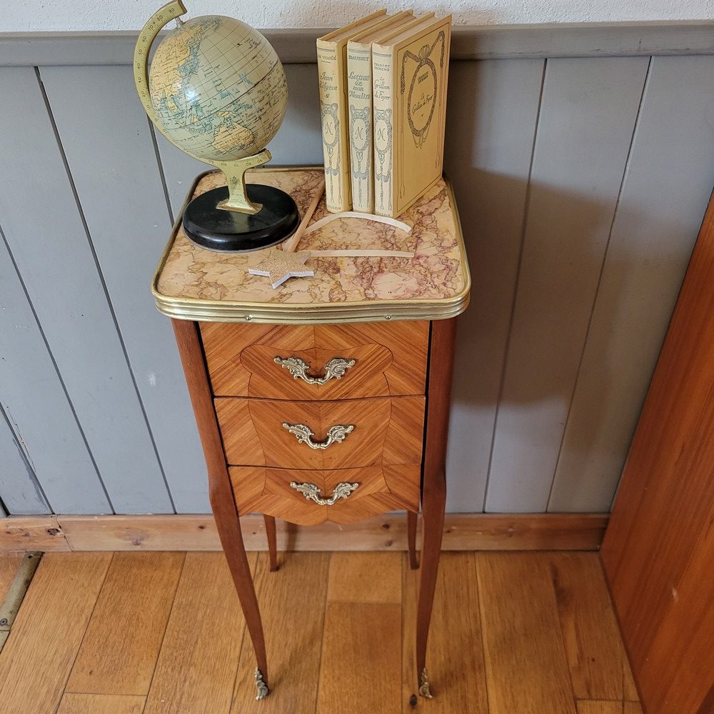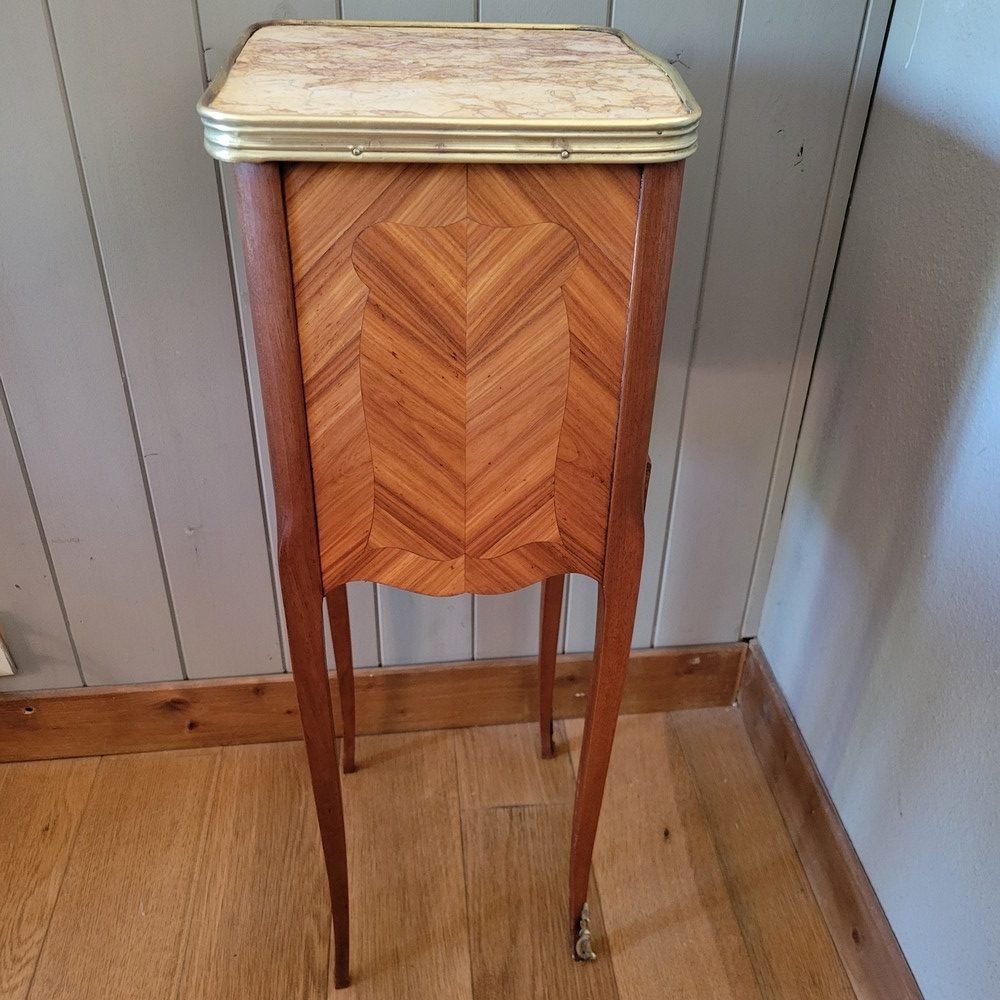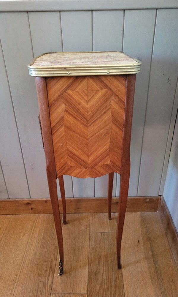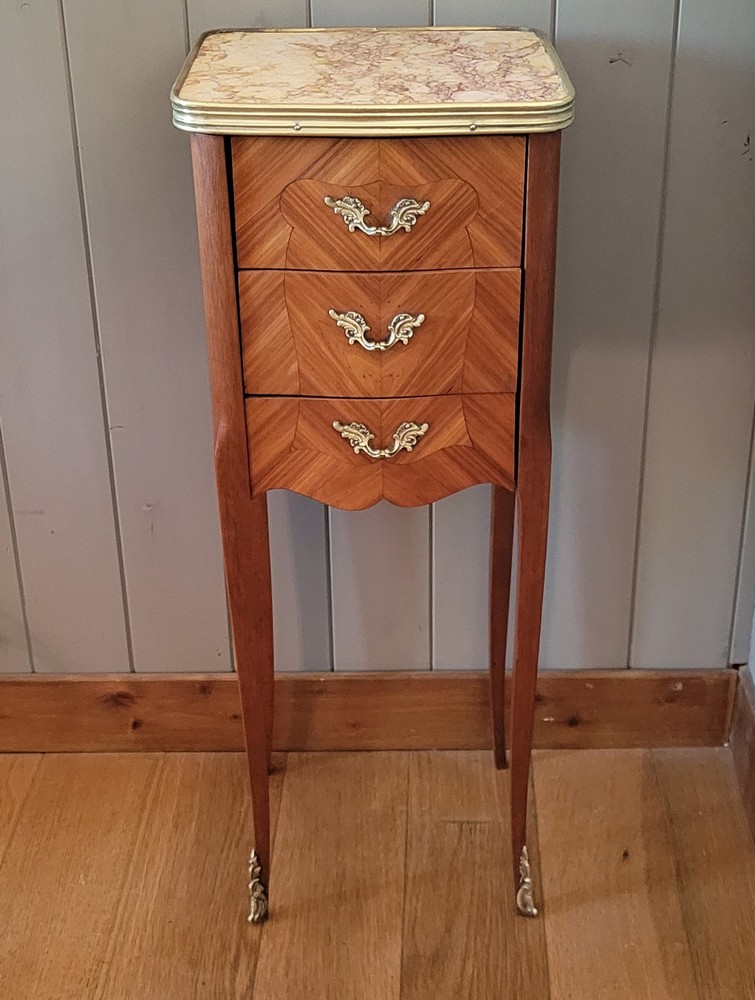 Petit chevet solitaire de style Louis XV, d’époque 1930 en bois de rose marqueté. Plateau en marbre cerclé de laiton, poignées et sabots en bronze. 3 tiroirs en façade. Epoque 1930, bon état général.
