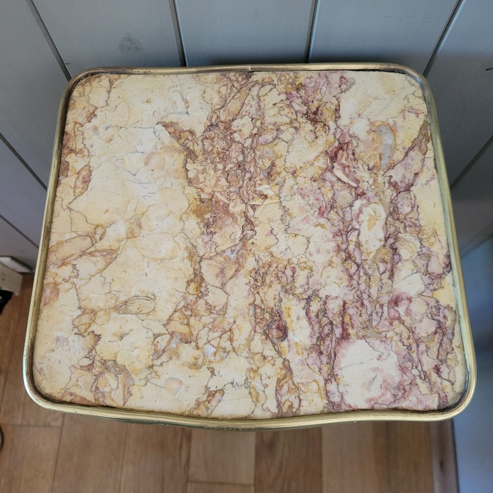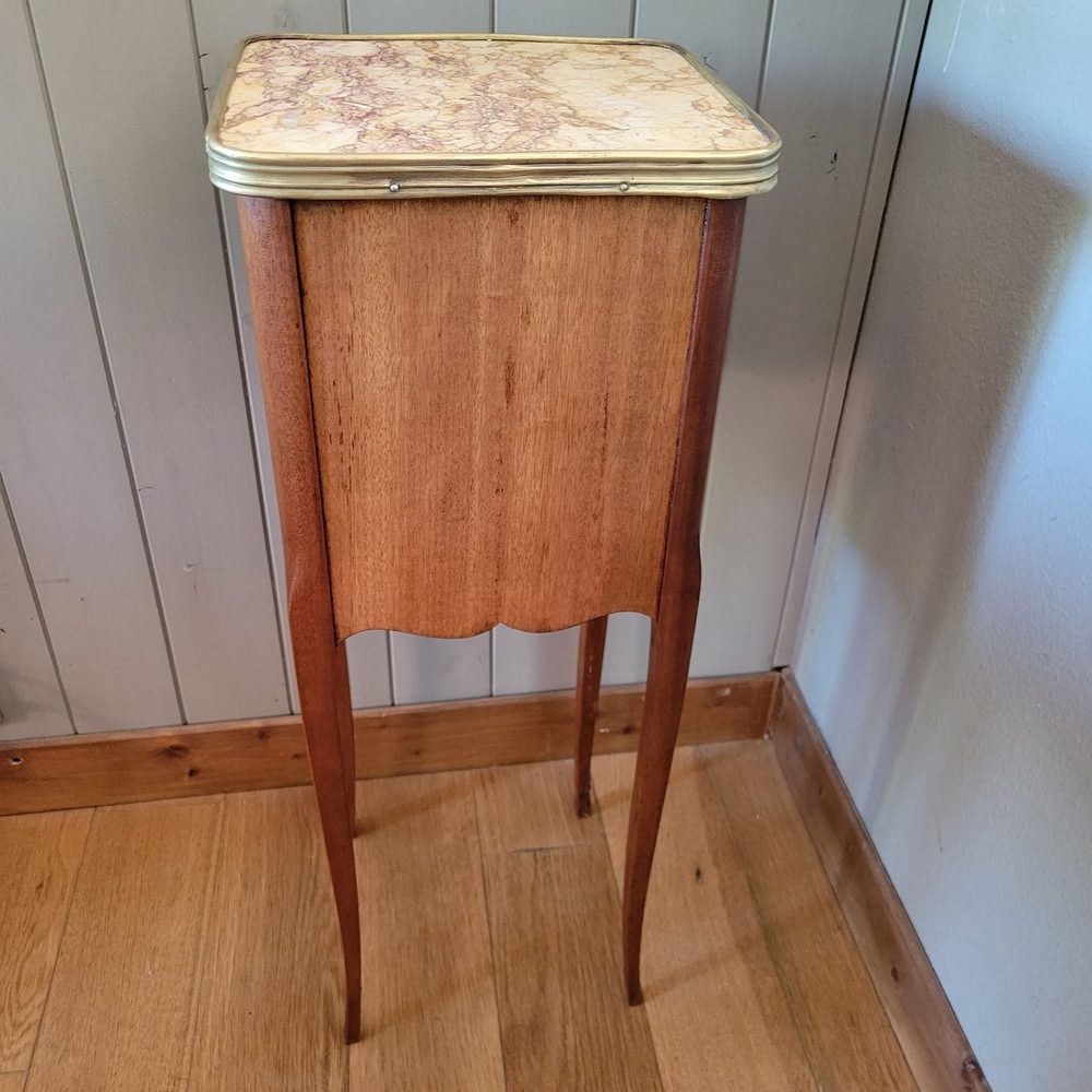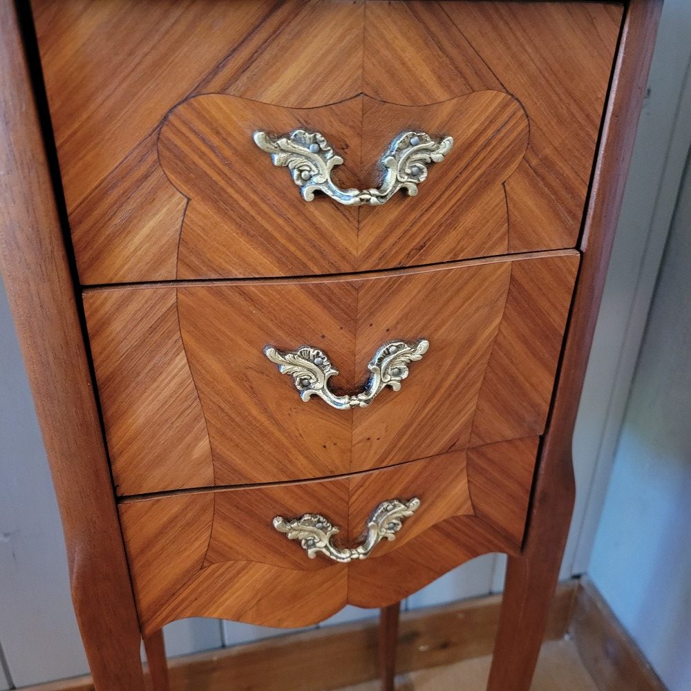 Petit chevet solitaire de style Louis XV, d’époque 1930 en bois de rose marqueté. Plateau en marbre cerclé de laiton, poignées et sabots en bronze. 3 tiroirs en façade. Epoque 1930, bon état général.