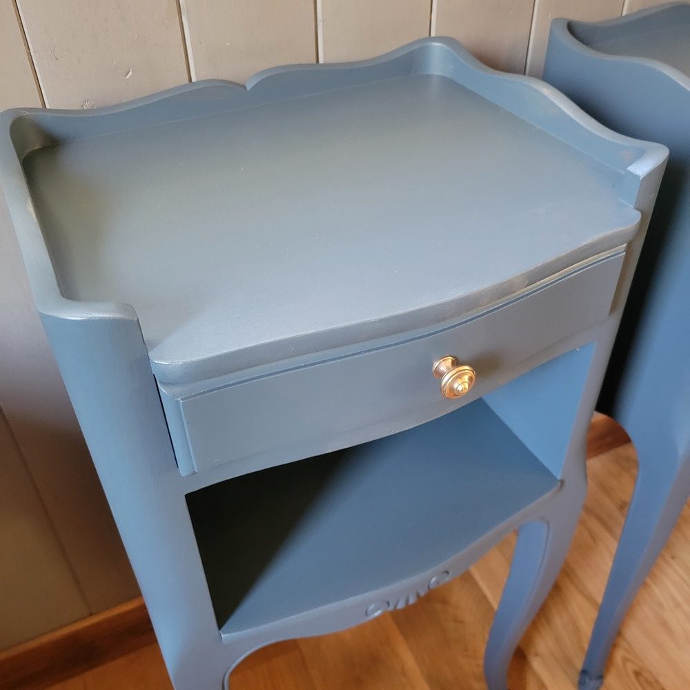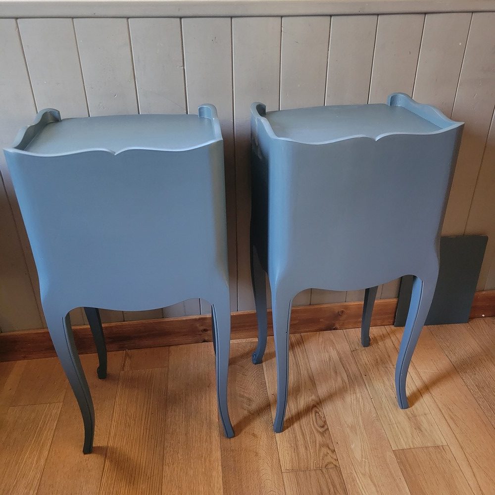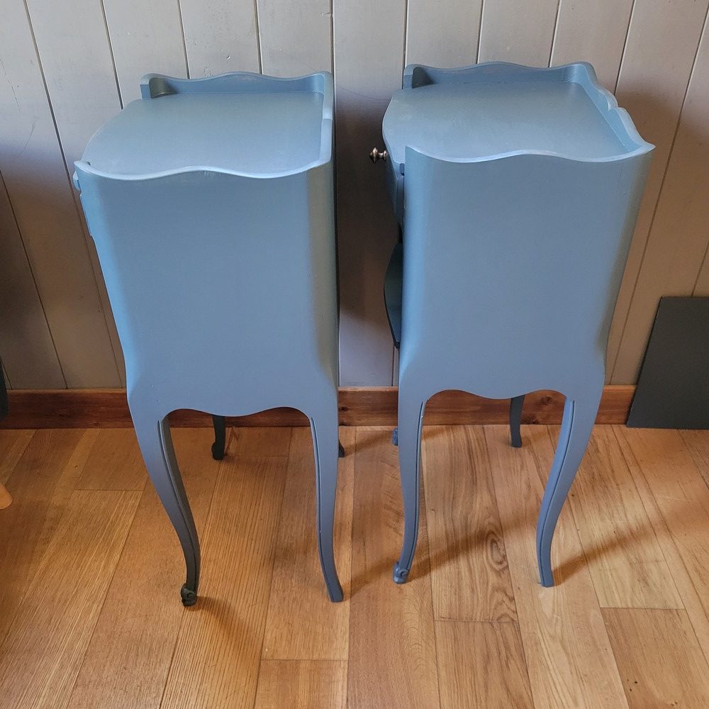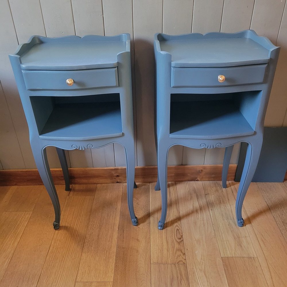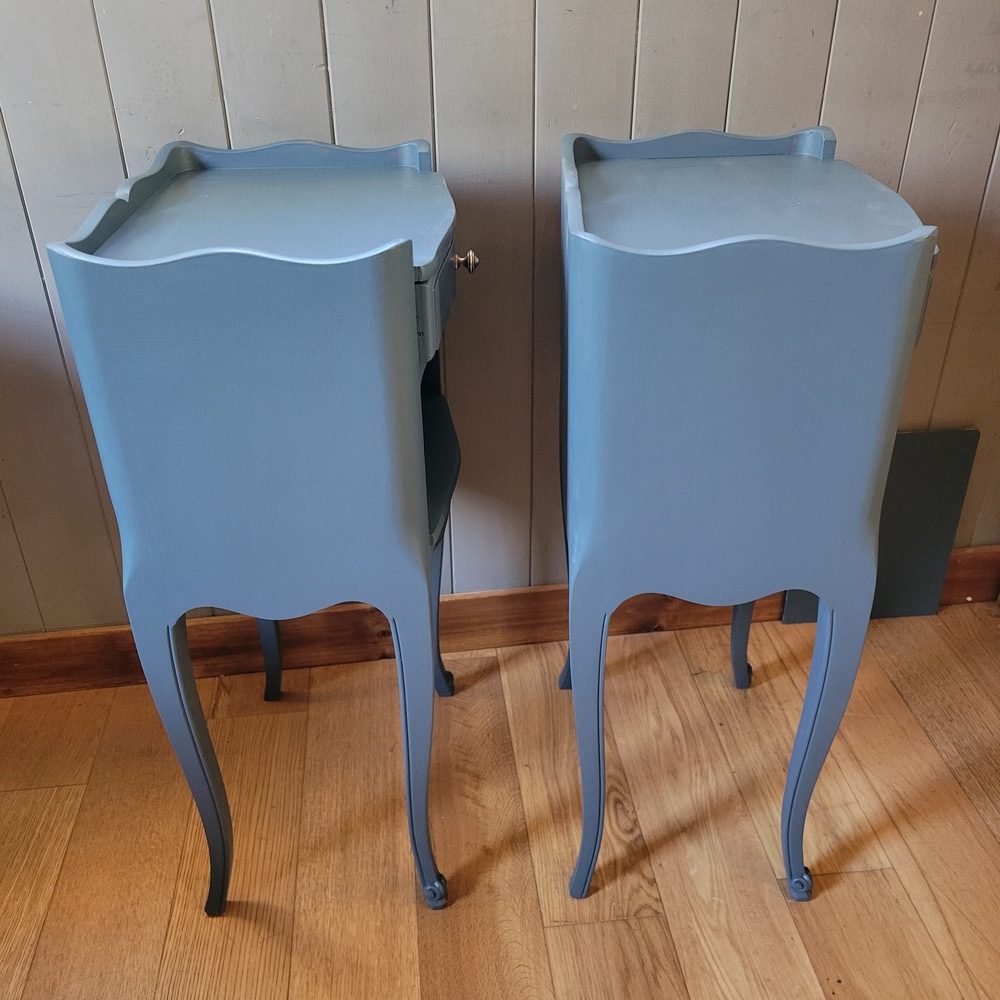 Paire de chevets en bois patiné gris, de style Louis XV, munis d’1 tiroir et d’1 niche. Bon état pour les deux. Epoque moderne.