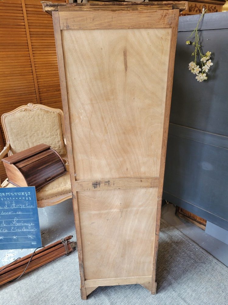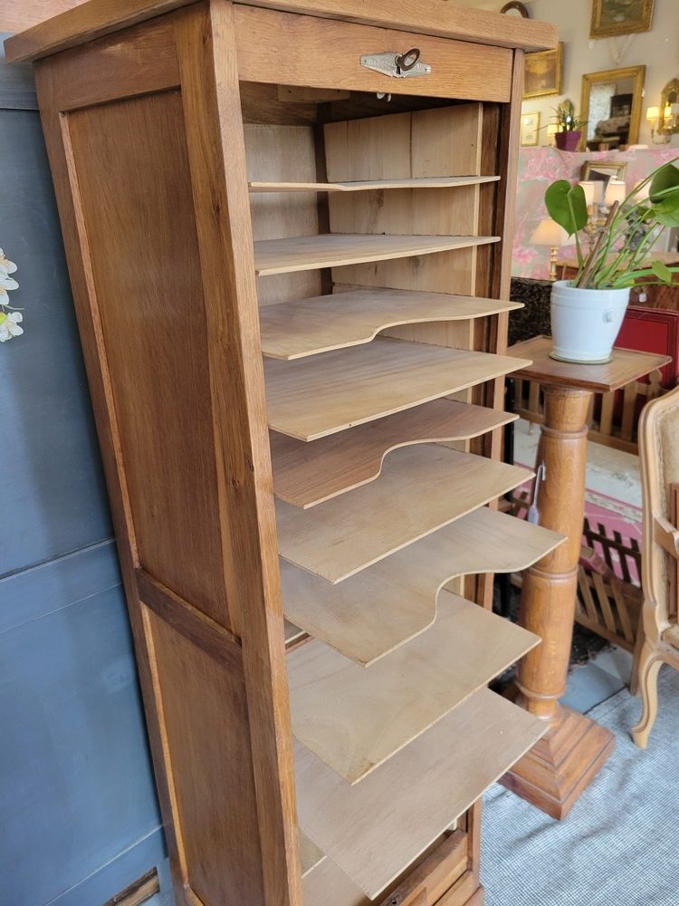 Classeur Colonne à un rideau en chêne clair, datant des années 1940. Meuble à la base administratif pour ranger ses documents et ses dossiers, il peut être détourné pour le linge ou les chaussures. Il est en bon état avec le rideau qui coulisse très bien et possède sa clé d’origine avec une poignée en bois. En tous 12 étagères amovibles, dont 4 incurvées.