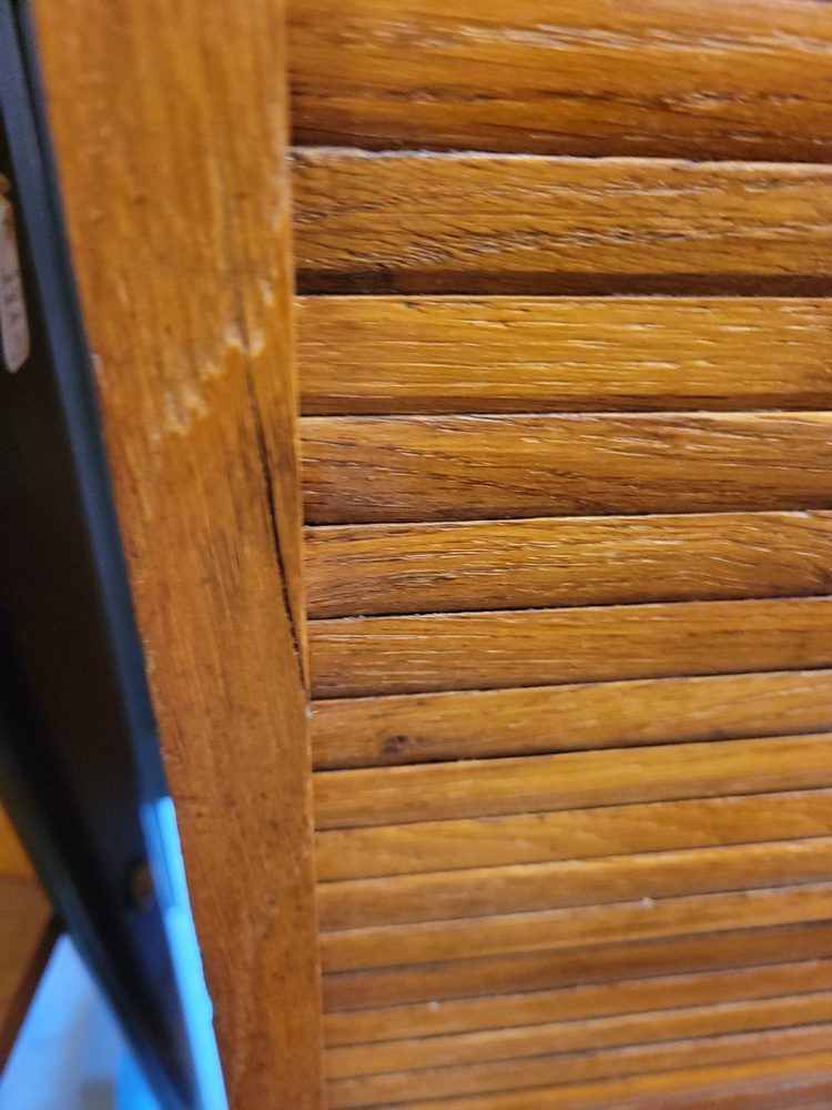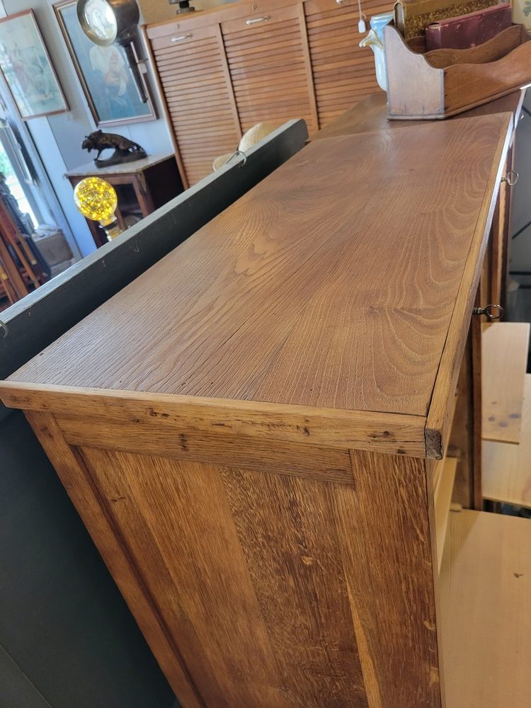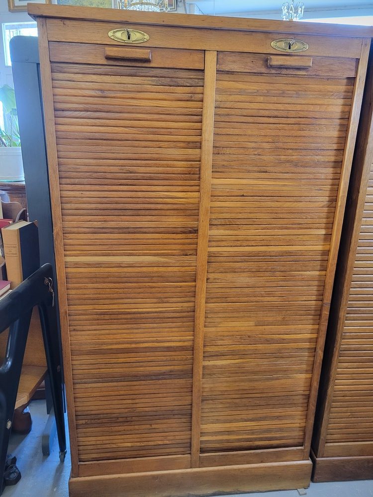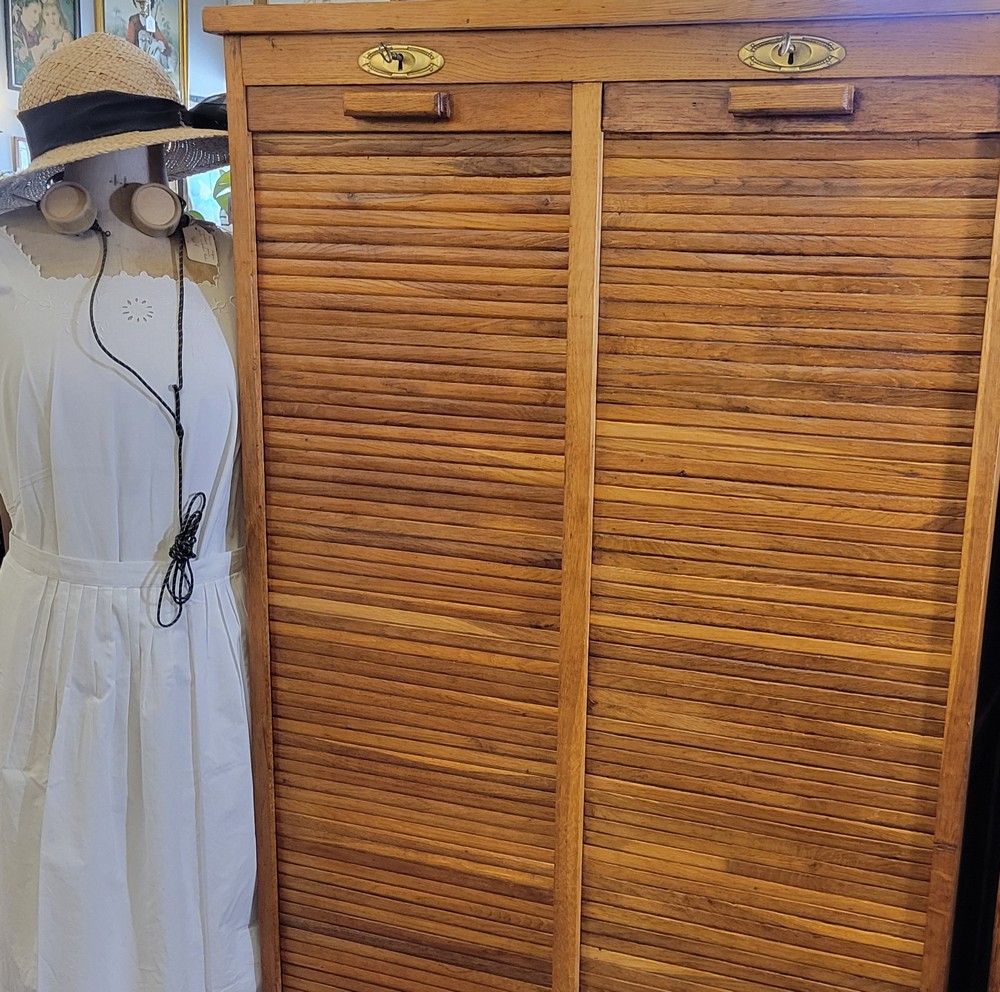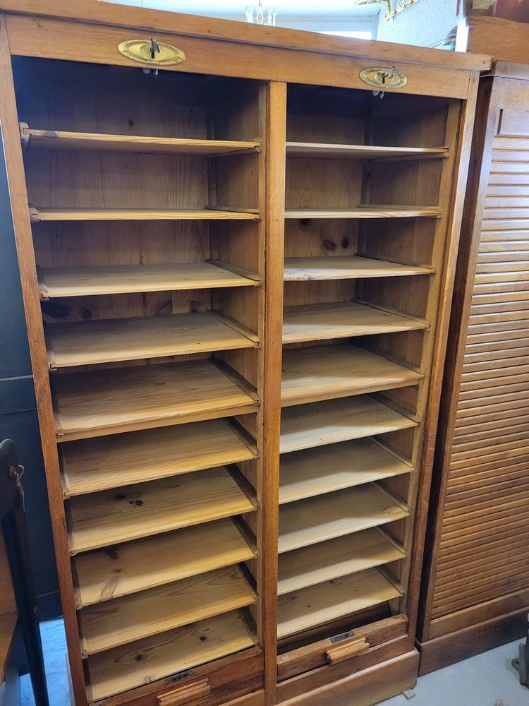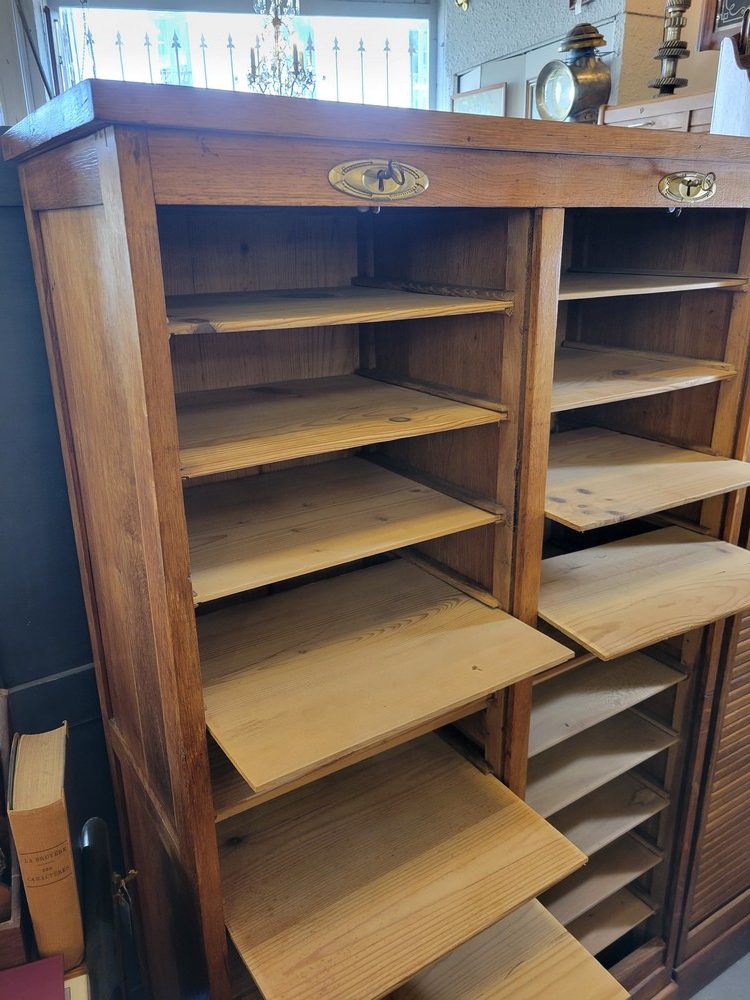 Classeur à double rideaux en chêne, datant des années 1940.Il est en bon état avec des rideaux qui coulissent très bien. Il est muni de chaque côté de 10 étagères amovibles en sapin. A noter une petite fente sur un montant(cf la photo)