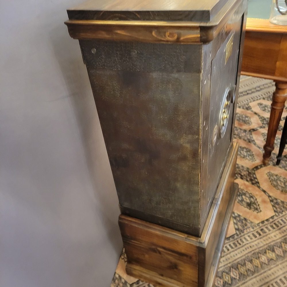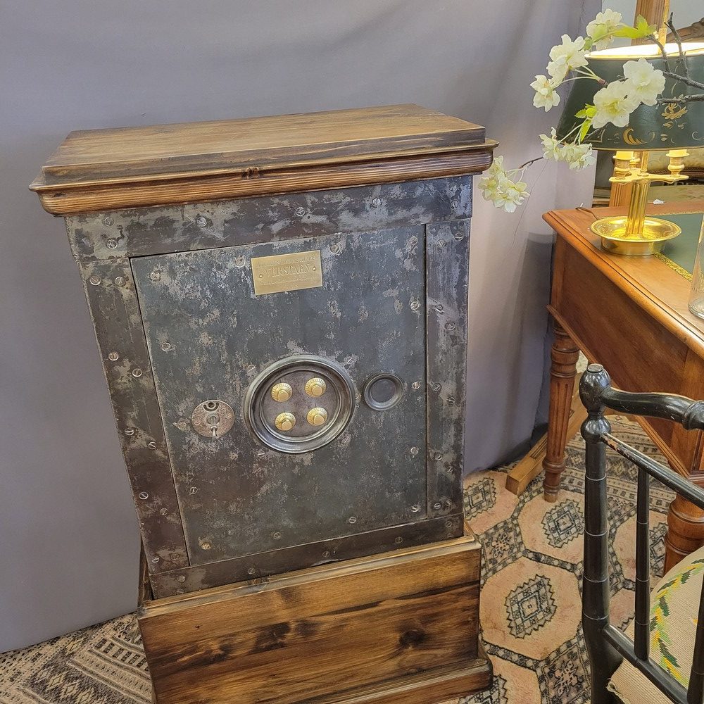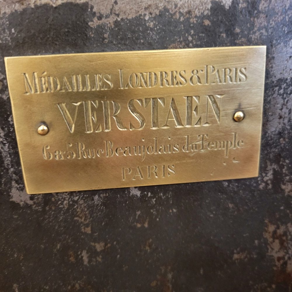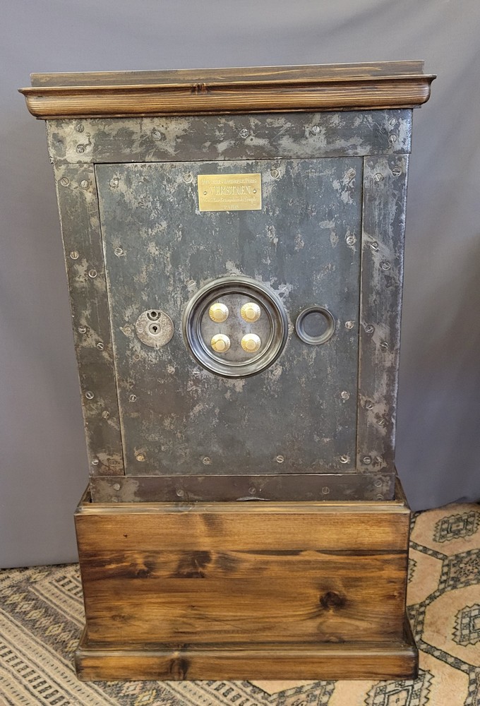 Beau coffre-fort , Fin XIXè, en acier brossé et incombustible, de la marque Verstaen. Plaque en laiton gravée « Médailles LONDRES & PARIS, VERSTAEN, 6 & 5 rue Beaujolais du Temple, PARIS ». Il s’ouvre avec 1 clé percée et 1 combinaison. La combinaison à lettres peut se changer à volonté. Nous pouvons  vous fournir un tuto pour expliquer le fonctionnement. L’intérieur comprend 2 étagères . La structure en bois n’est pas d’origine. La plaque tournante qui cache la serrure est manquante.