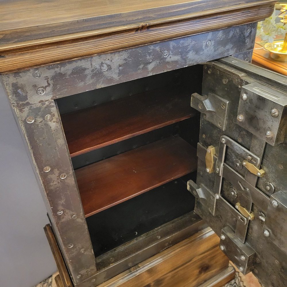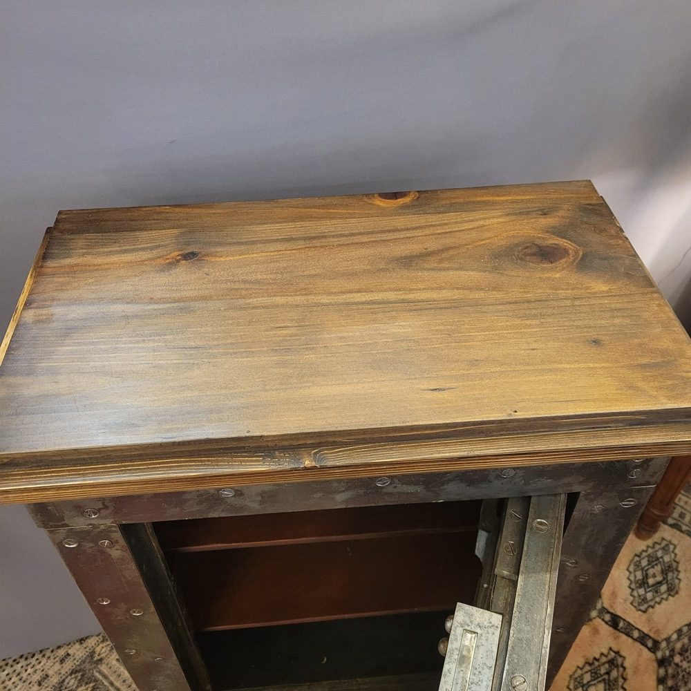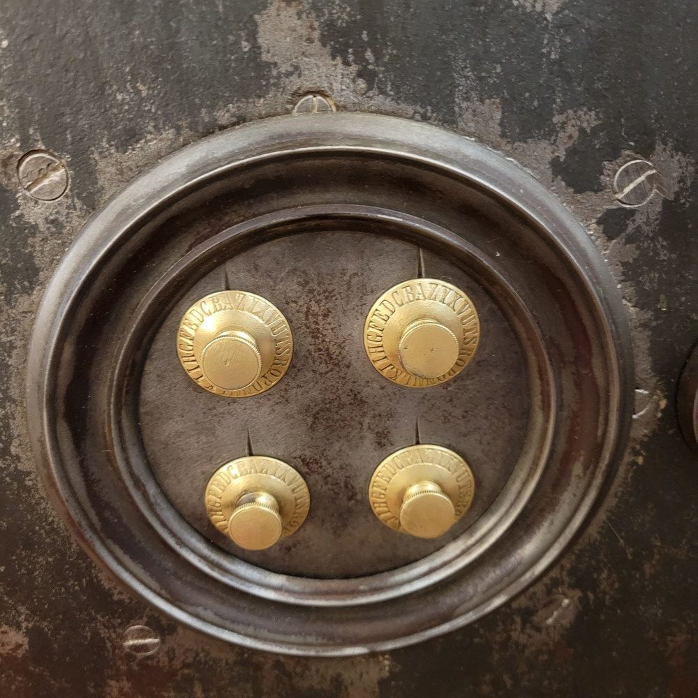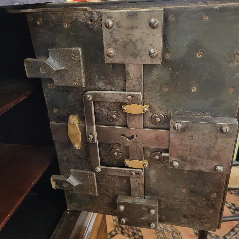Beau coffre-fort , Fin XIXè, en acier brossé et incombustible, de la marque Verstaen. Plaque en laiton gravée « Médailles LONDRES & PARIS, VERSTAEN, 6 & 5 rue Beaujolais du Temple, PARIS ». Il s’ouvre avec 1 clé percée et 1 combinaison. La combinaison à lettres peut se changer à volonté. Nous pouvons  vous fournir un tuto pour expliquer le fonctionnement. L’intérieur comprend 2 étagères . La structure en bois n’est pas d’origine. La plaque tournante qui cache la serrure est manquante.