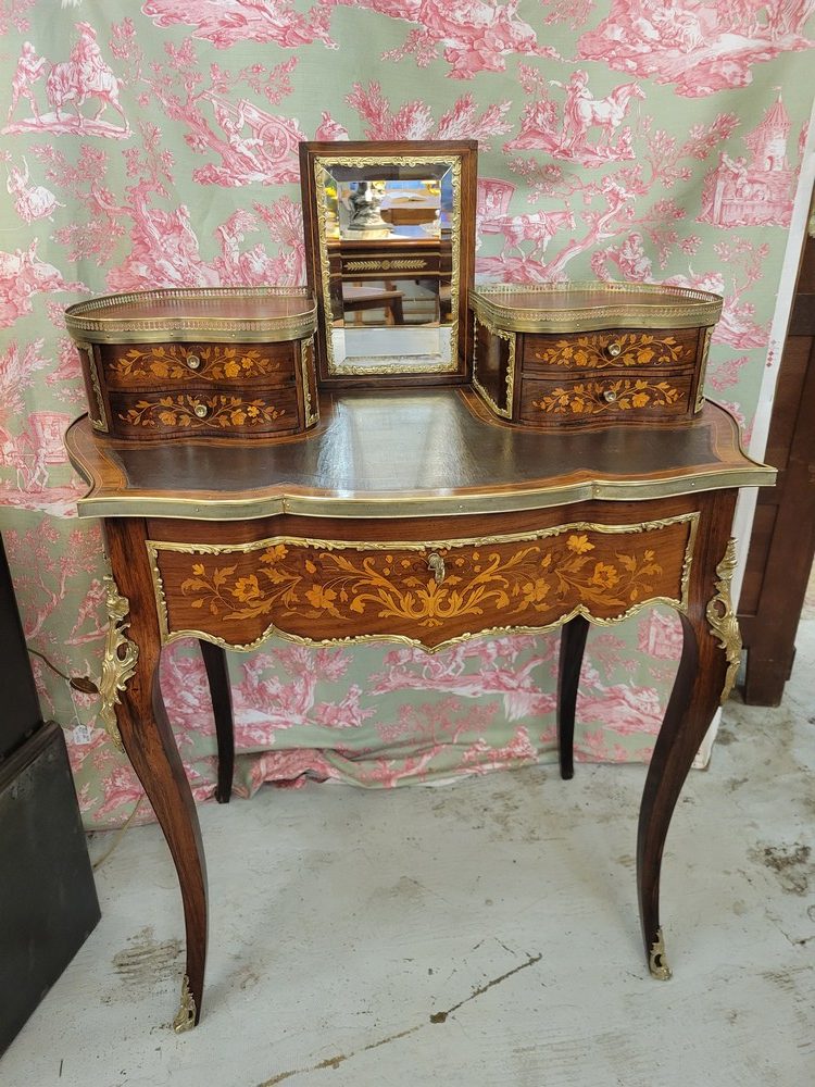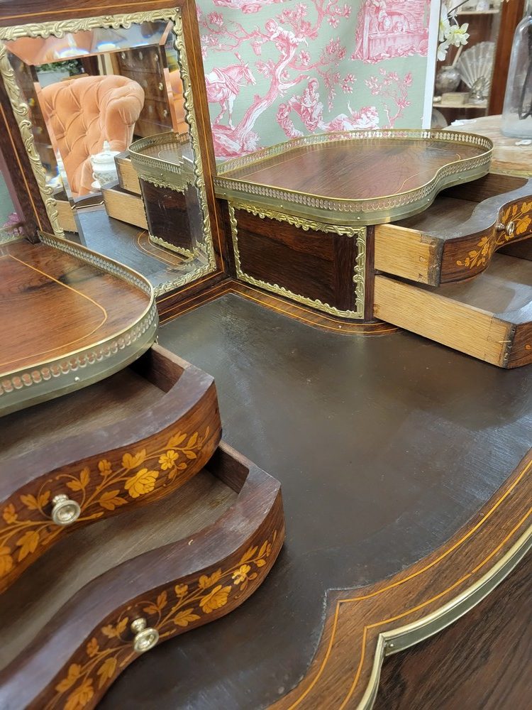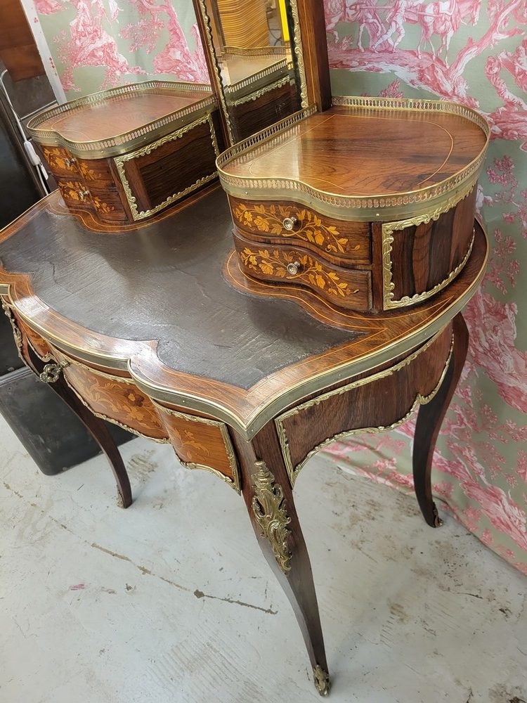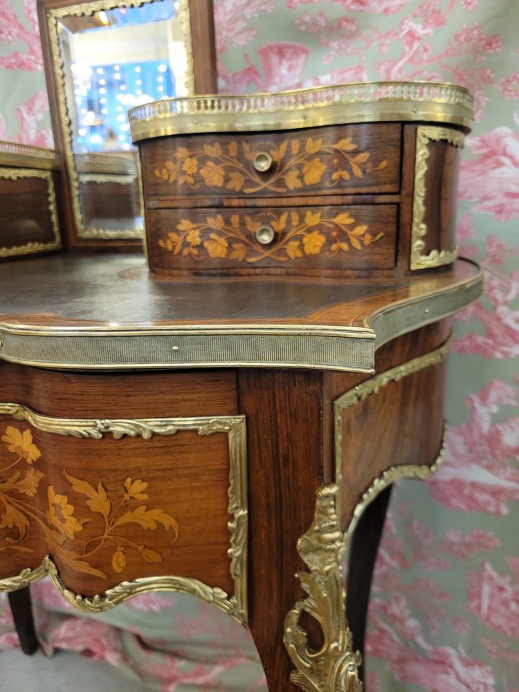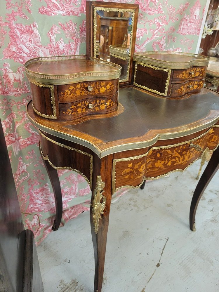 Adorable coiffeuse de style Louis XV, d’époque 1900. En  palissandre et bois de rose marqueté, elle est décorée de motifs floraux sur les 3 faces ainsi que de garnitures en bronze. Sa forme violonnée accentue le côté gracieux et raffiné. Les 5 tiroirs en façade sont propre à l’intérieur. Le grand tiroir est muni d’une jolie clé et la serrure fonctionne. Le plateau en cuir est en assez bon état.  Le miroir est biseauté. Très bon état général.