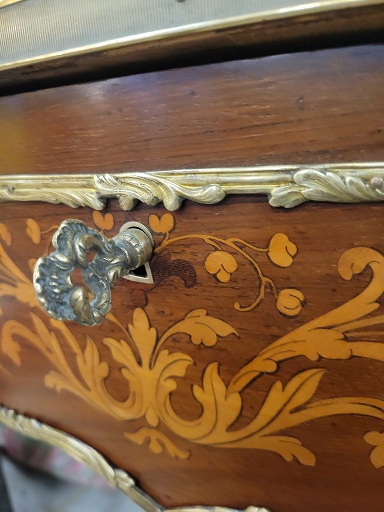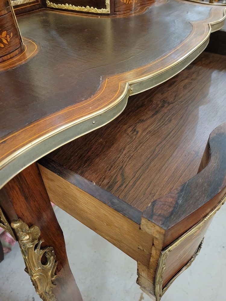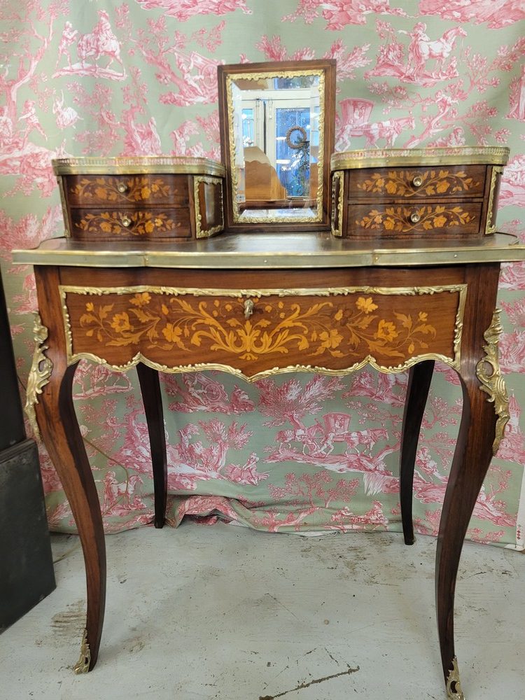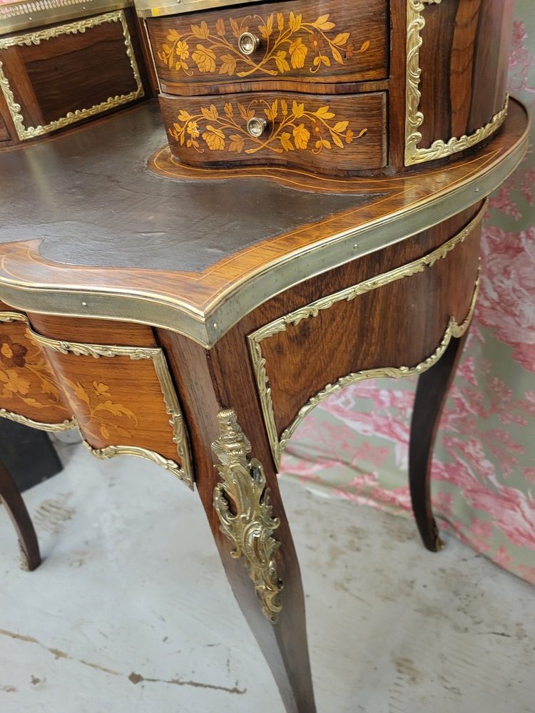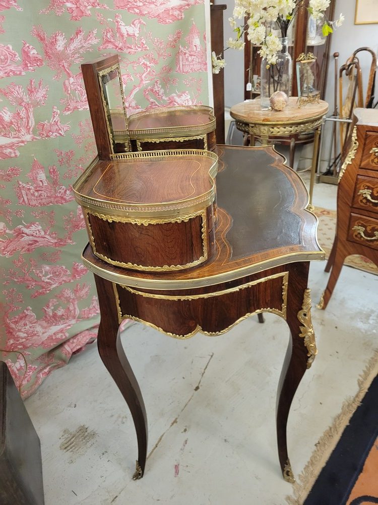 Adorable coiffeuse de style Louis XV, d’époque 1900. En  palissandre et bois de rose marqueté, elle est décorée de motifs floraux sur les 3 faces ainsi que de garnitures en bronze. Sa forme violonnée accentue le côté gracieux et raffiné. Les 5 tiroirs en façade sont propre à l’intérieur. Le grand tiroir est muni d’une jolie clé et la serrure fonctionne. Le plateau en cuir est en assez bon état.  Le miroir est biseauté. Très bon état général.
