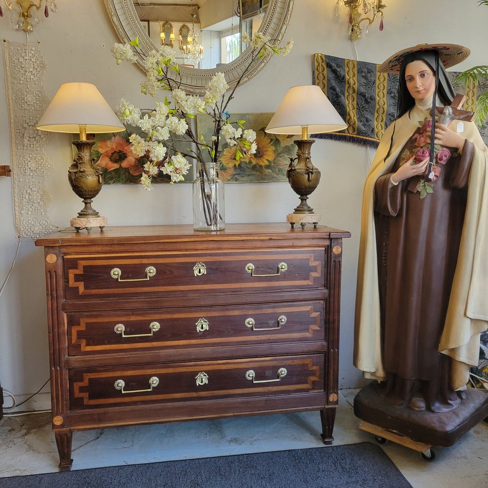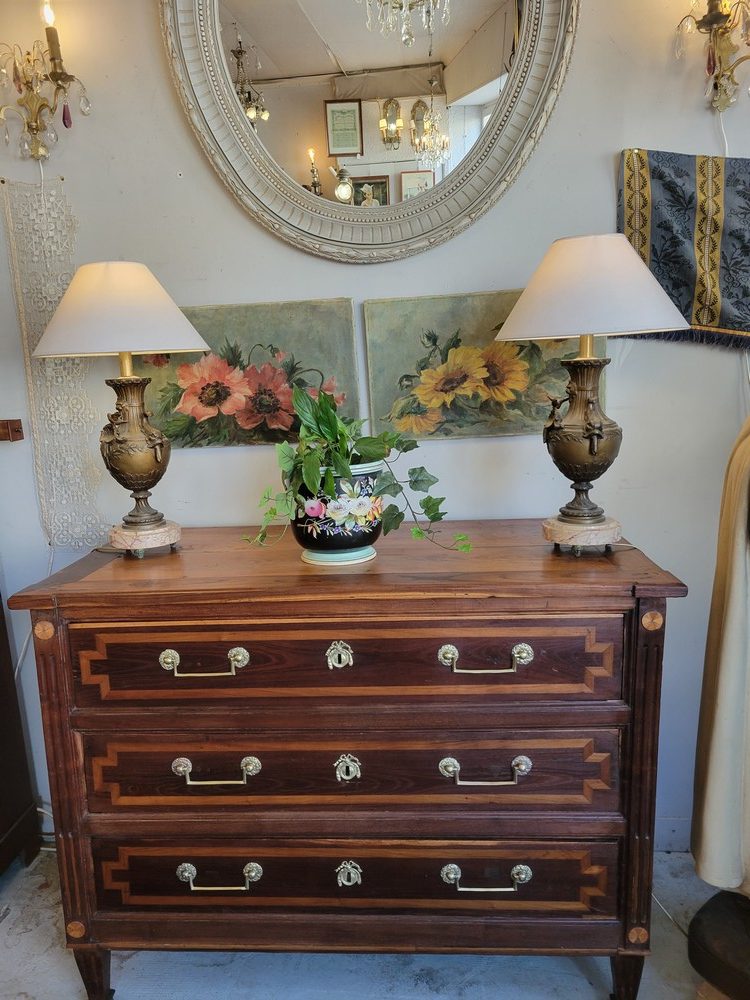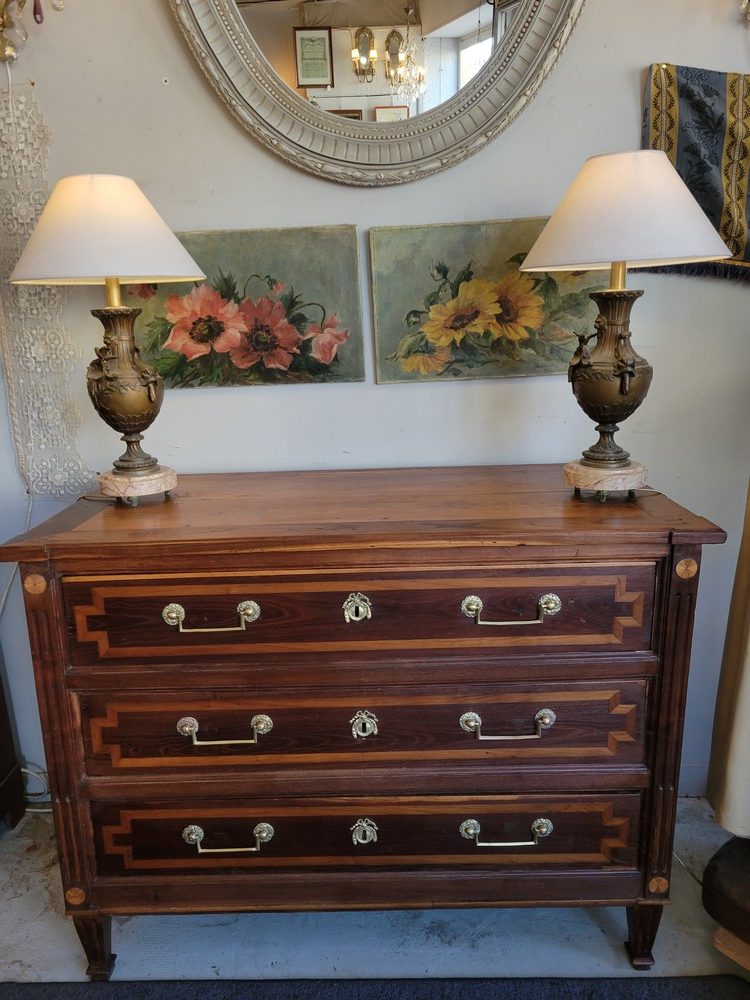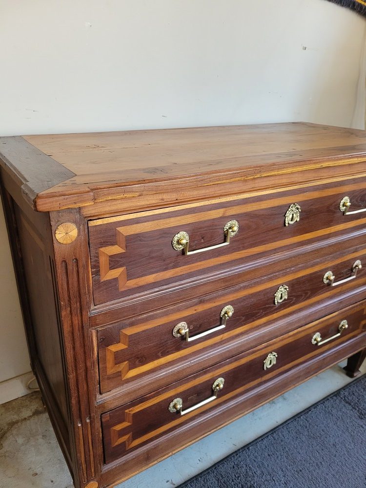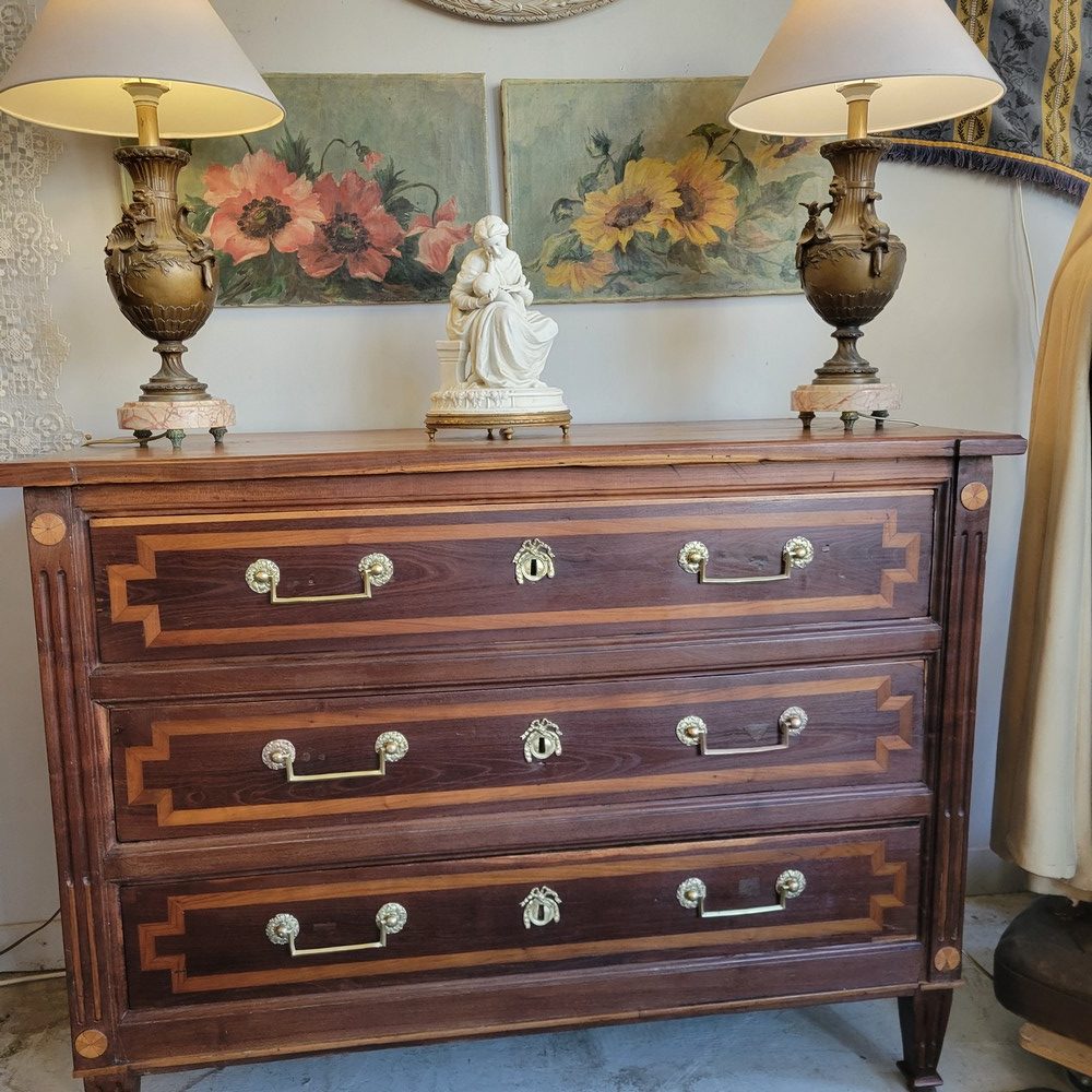Belle commode de style Louis XVI, époque XVIIIè. Meuble campagnard et rustique plein de charme en bois massif avec un jeu de marqueterie en bois plus clair. Plusieurs essences de bois ont été utilisées (châtaignier, merisier …). 3 tiroirs en façade, munis de poignées ballantes en laiton. Bon état général malgré de nombreuses traces d’usage et de petits bobos restaurés au fil du temps (cf.photos). Meuble propre et sain.