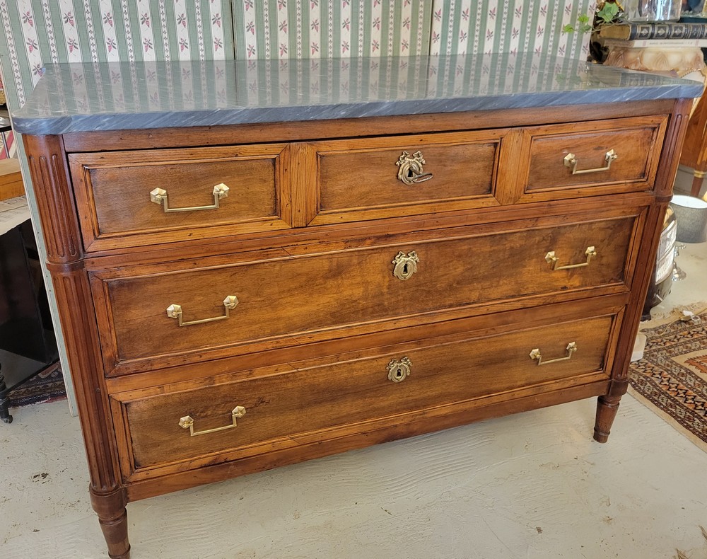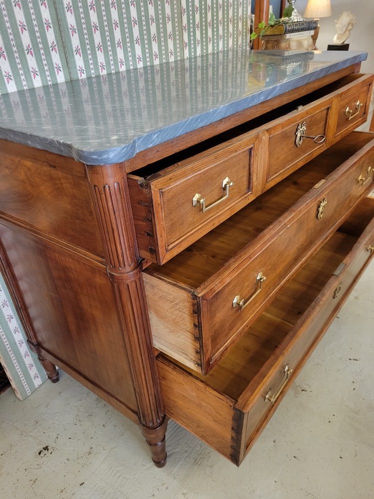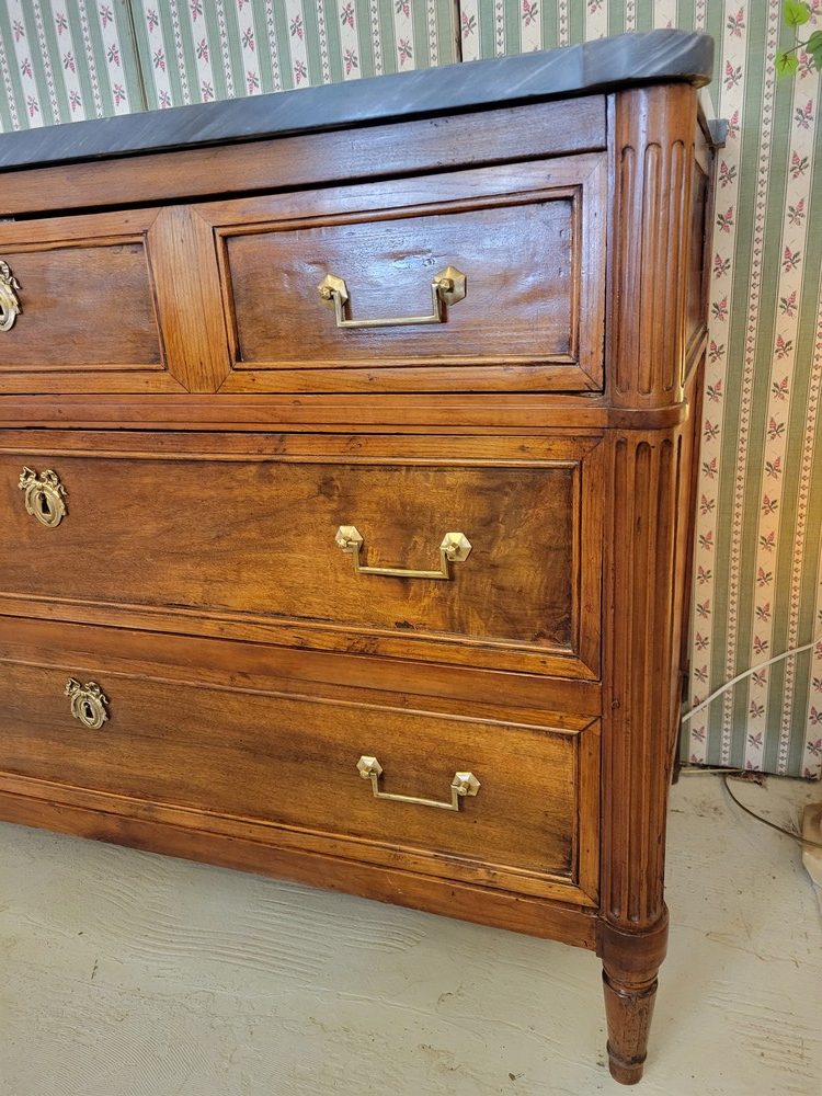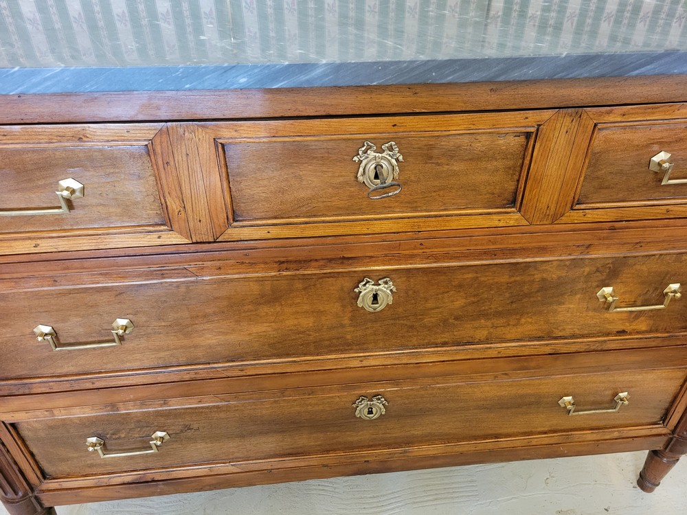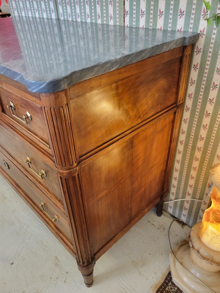 Belle commode de style Louis XVI, époque XVIIIè. Meuble  plein de charme en noyer, surmonté d’un marbre gris- bleu turquin. 3 tiroirs en façade, munis de poignées ballantes en laiton. Bon état. Meuble propre et sain.