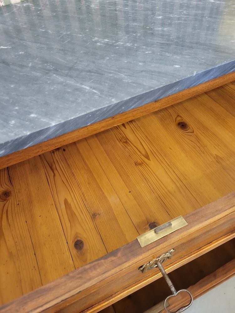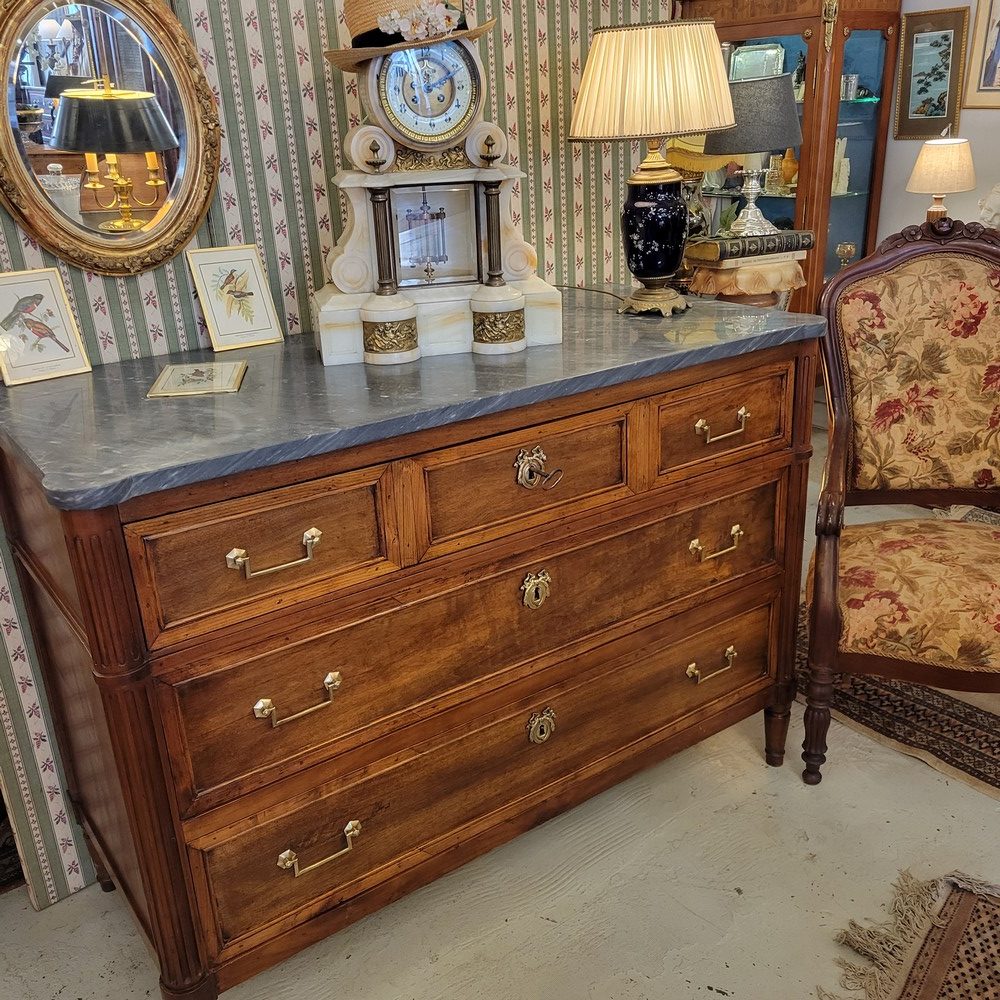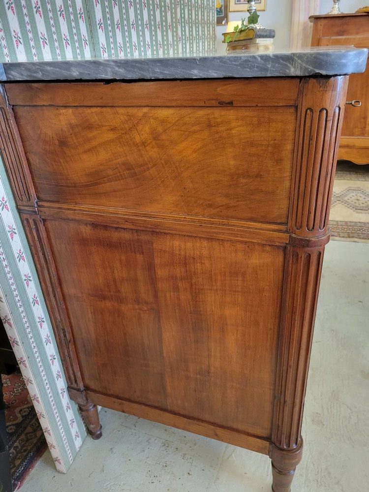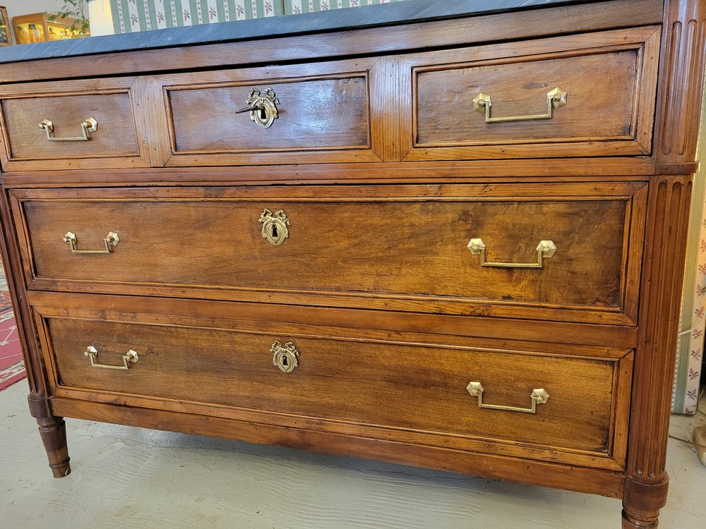 Belle commode de style Louis XVI, époque XVIIIè. Meuble  plein de charme en noyer, surmonté d’un marbre gris- bleu turquin. 3 tiroirs en façade, munis de poignées ballantes en laiton. Bon état. Meuble propre et sain.