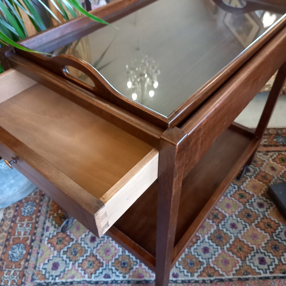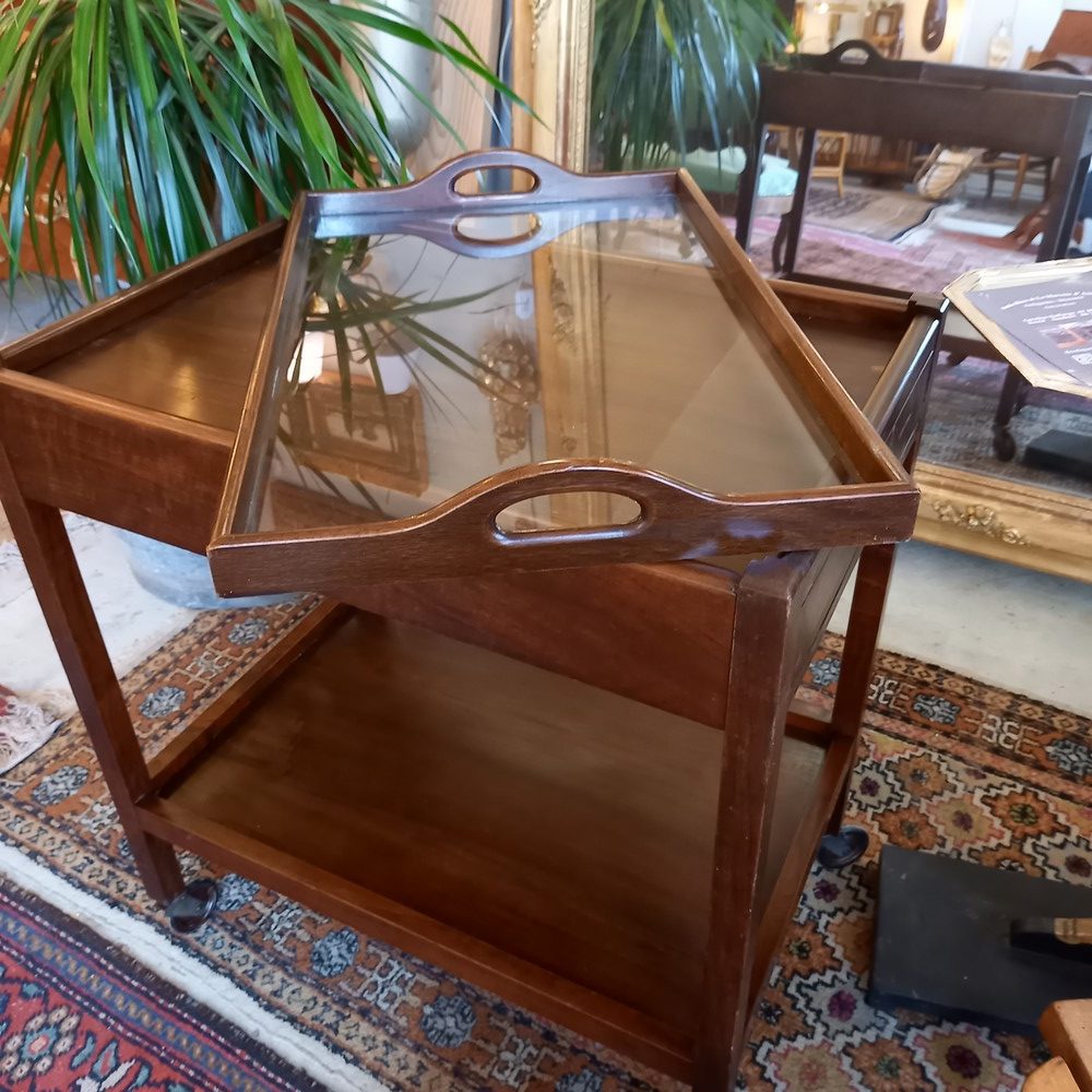 Table Roulante, Desserte Plateau amovible vitré Acajou 2 tiroirs, boutons lentille époque XXè Prix : 180€ Livraison:50€ Nous contacter pour toute Réservation.