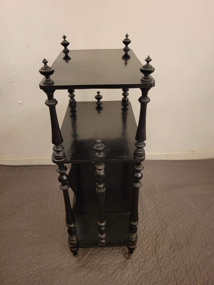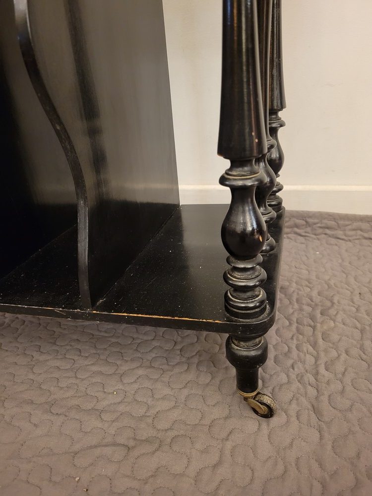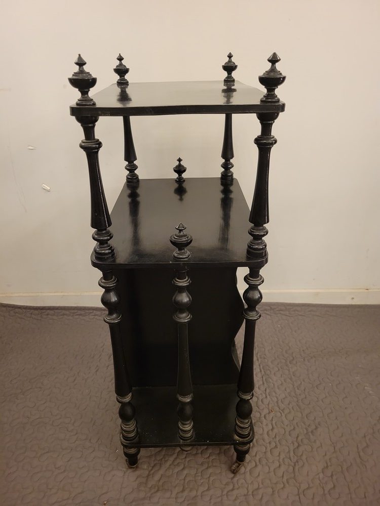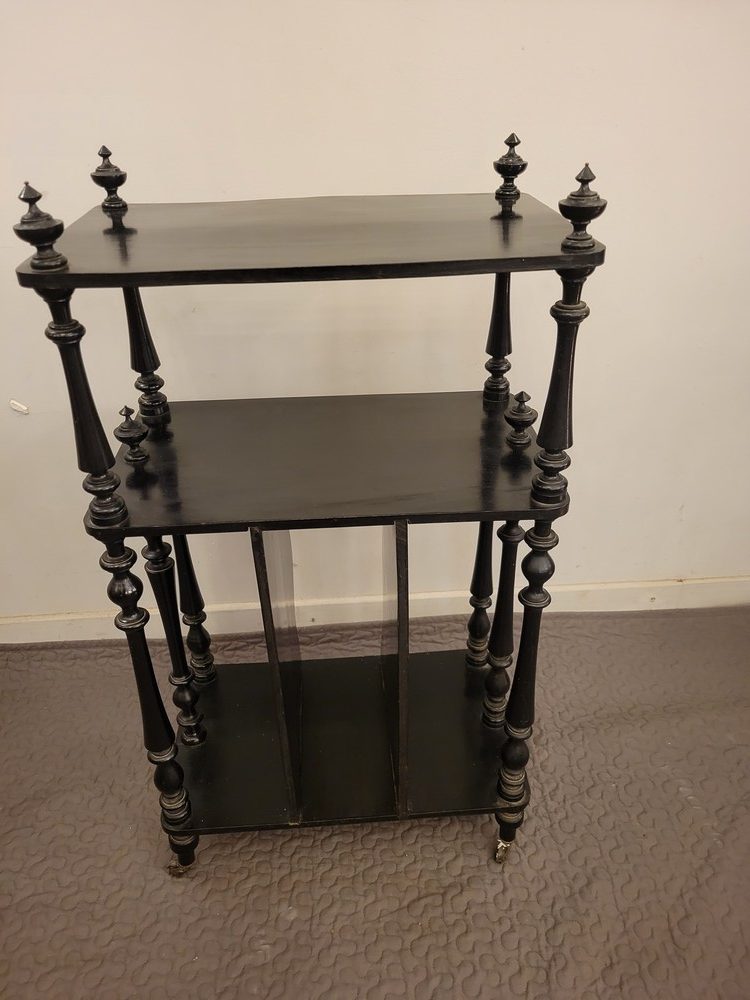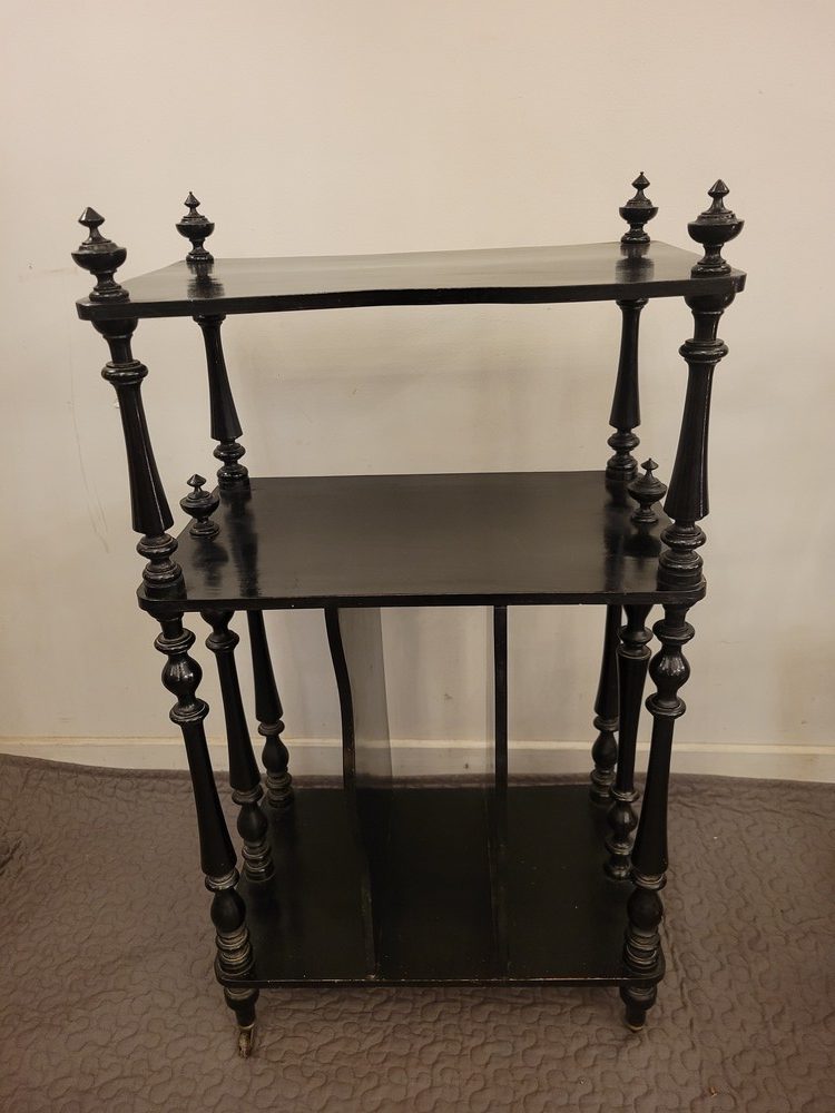 Etagère à Musique, époque Napoléon III, 3 niveaux, montée sur roulettes. Bois noirci. Bon état. Pour ranger des disques ou des partitions.