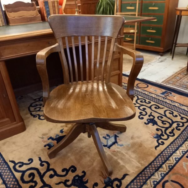 Fauteuil de bureau en chêne, tournant, monte-et-baisse. Fauteuil de qualité qui vous offrira une assise agréable et un style raffiné. Il est en bon état et présente de belles finitions.