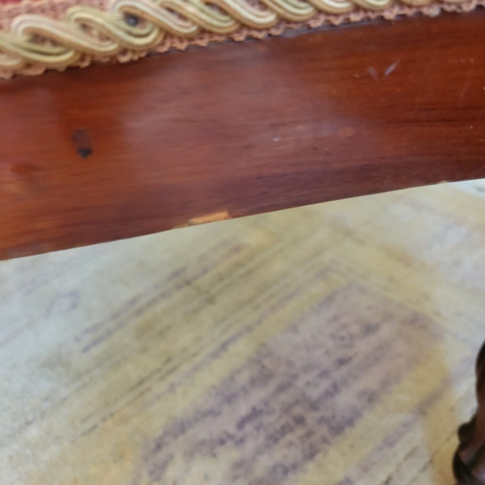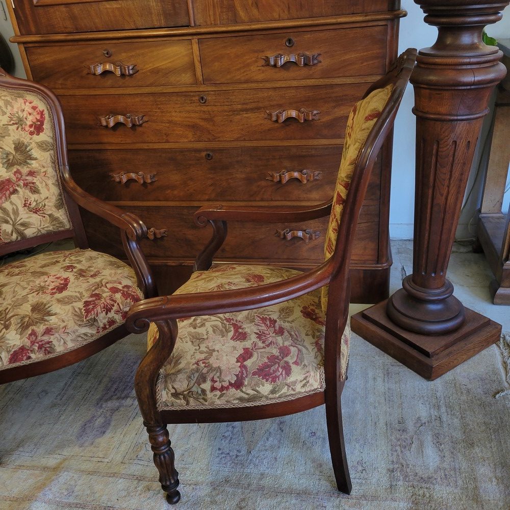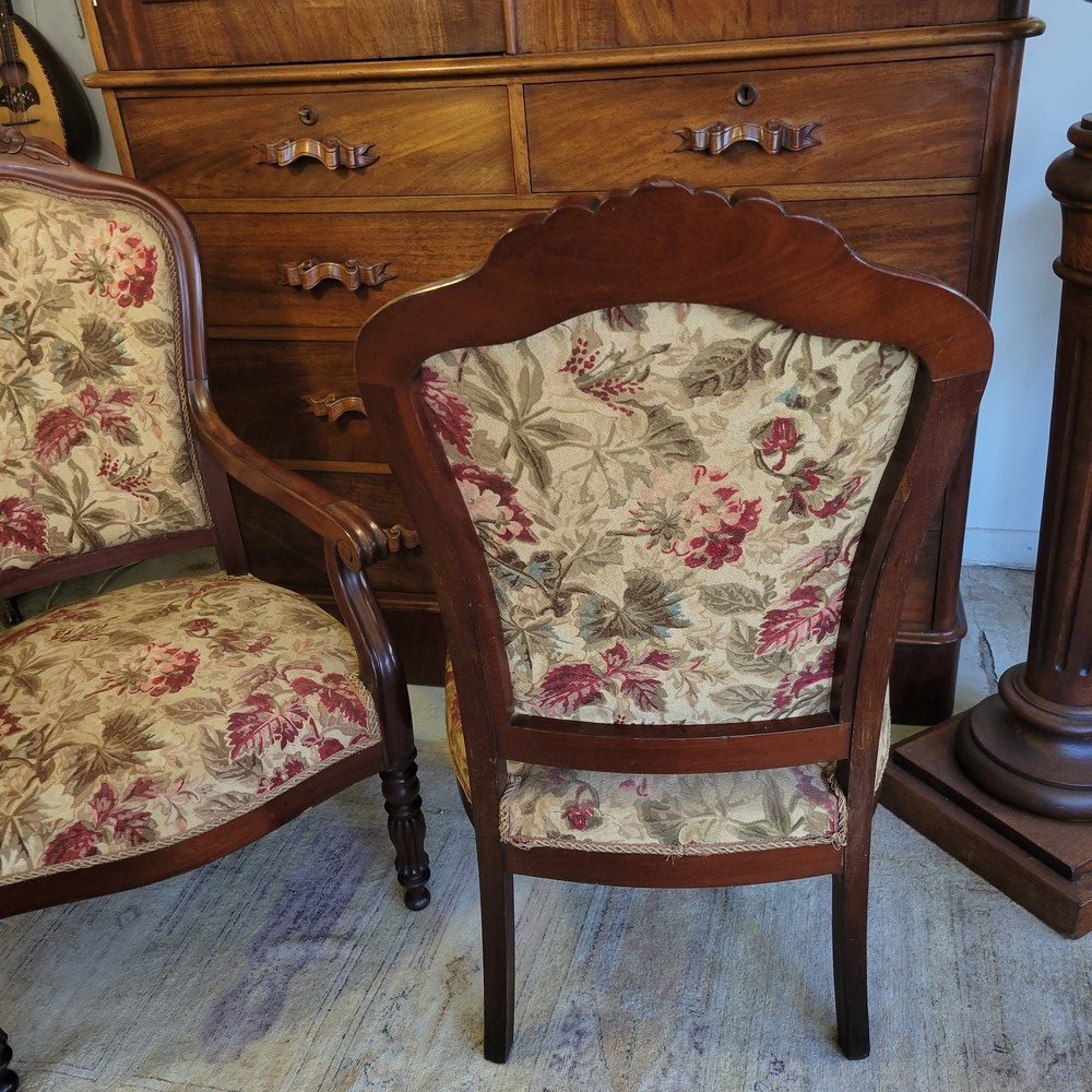 Paire de Fauteuils en acajou ciré, d’époque Napoléon III. Tissu d’époque avec des motifs floraux aux belles teintes automnales mais assises à refaire si c’est pour s’en servir. La structure en bois, elle est en bon état.