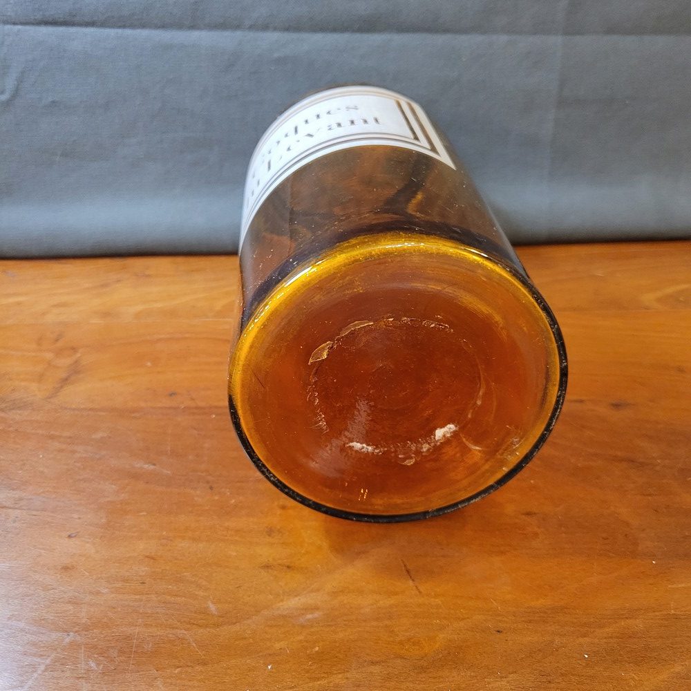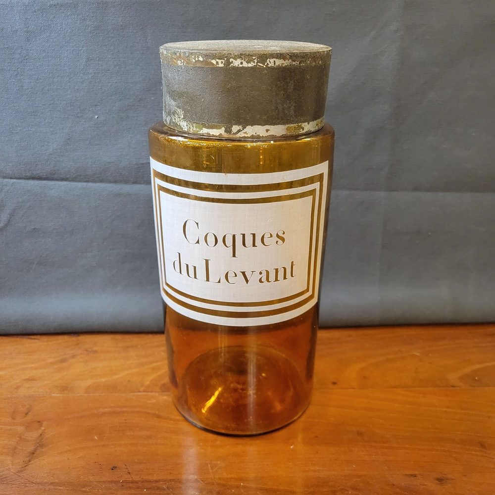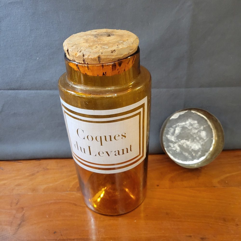 Flacons d’apothicaire datant du XIXè en verre fumé et soufflé. Double bouchon en liège et en métal. Etiquette Coques du Levant, gravée à l’acide.