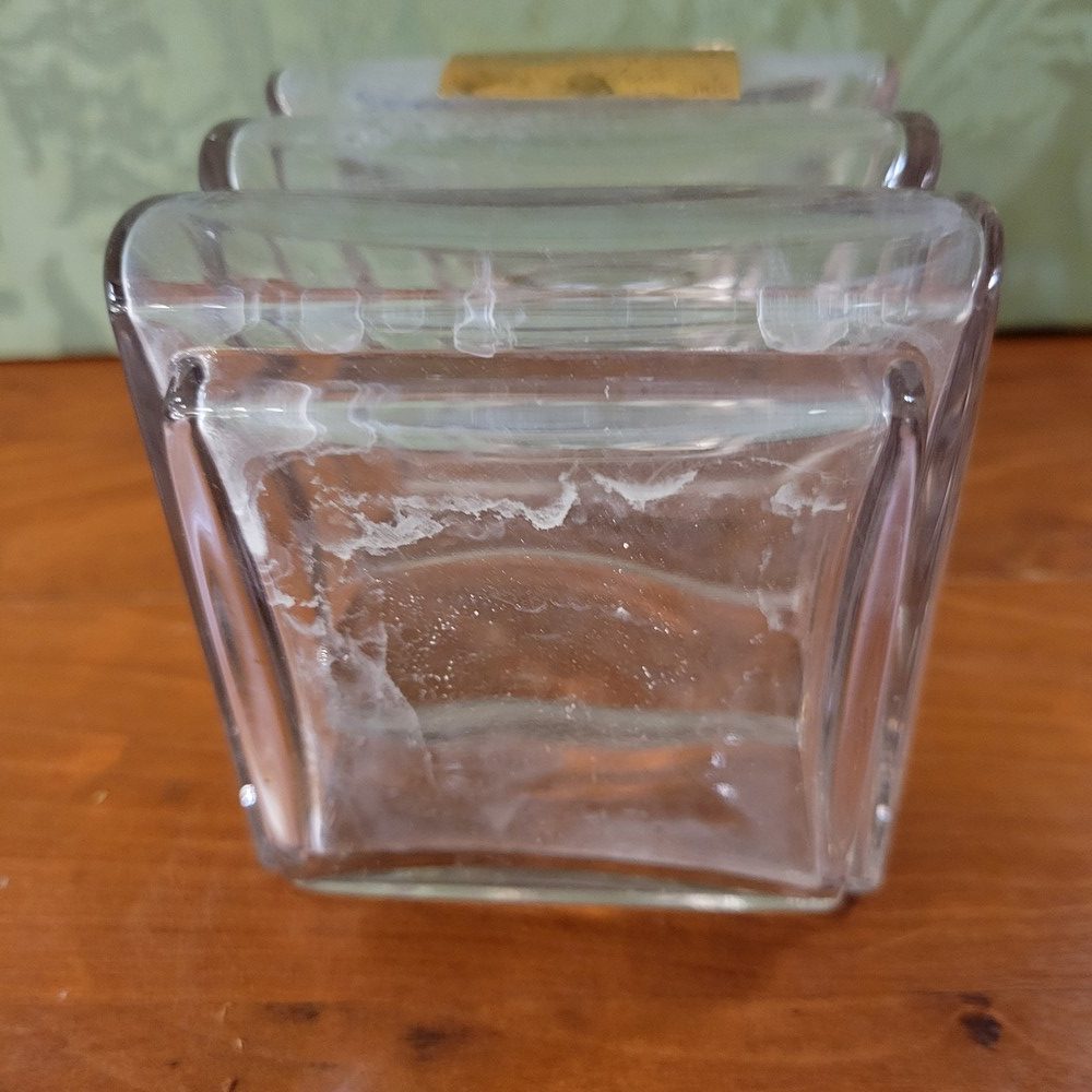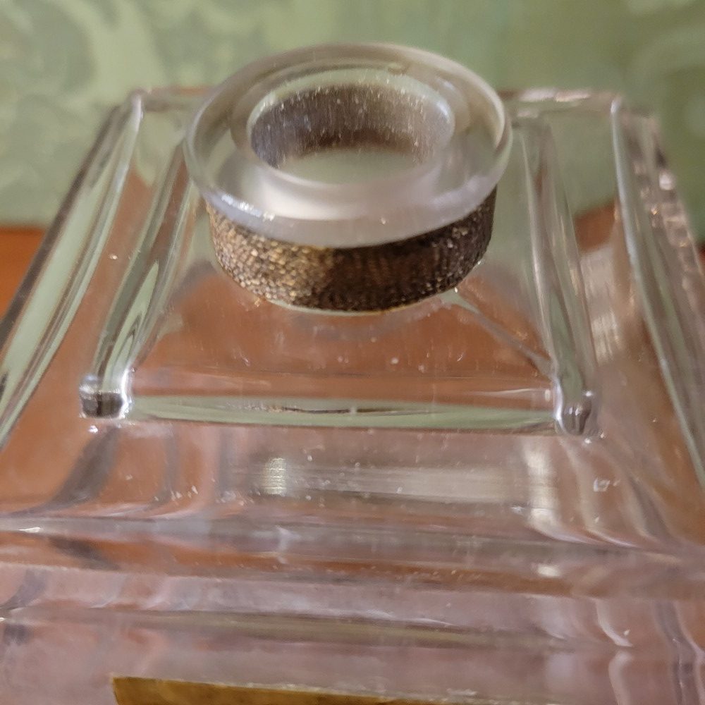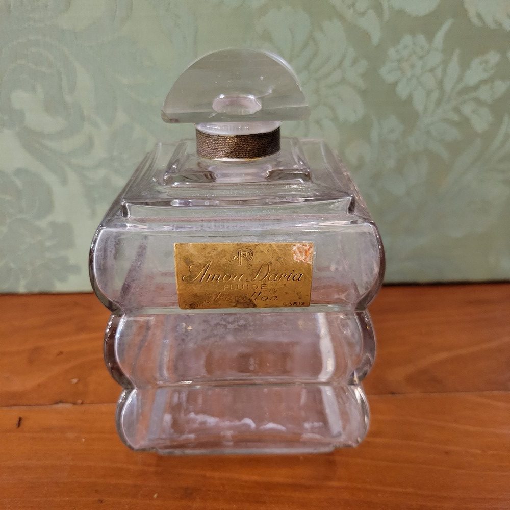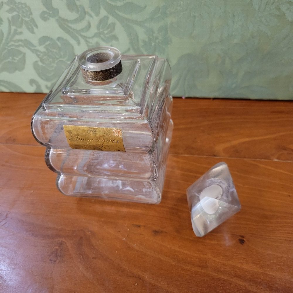 Flacon de parfum de collection, Amou Doria de Révillon 1935-Paris. Flacon tank en cristal incolore. Vide, étiquette usée, cristal un peu blanchi et intérieur bouchon égrené.