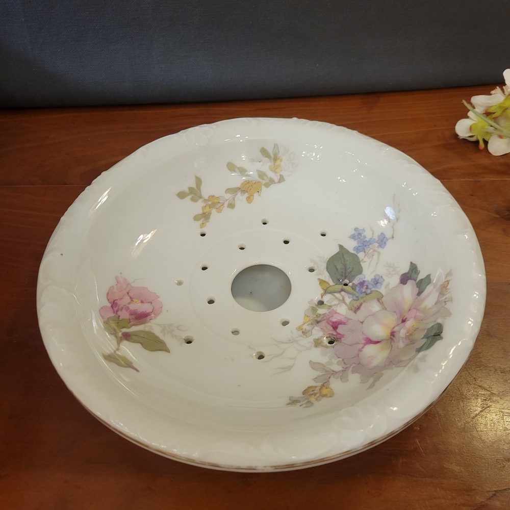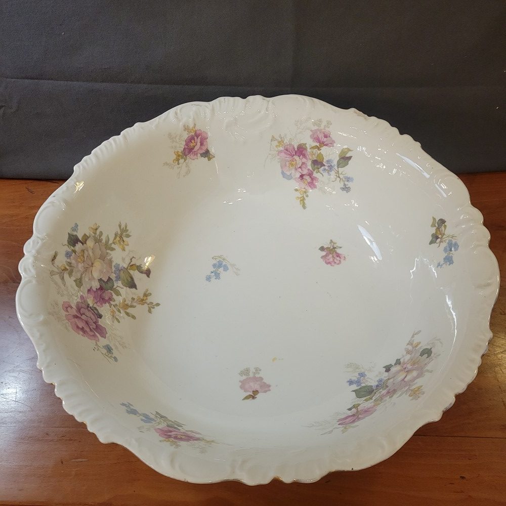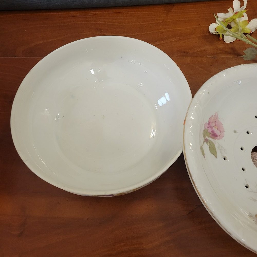 Ensemble de toilette en porcelaine de Limoges, décor de roses sur fond blanc. Bords chantournés, réhaussés d’un liseré doré. Il est composé d’un grand broc, d’une vasque et d’un égouttoir, porte-savon ou éponge, assorti. Chaque pièce est marquée Limoges France. Très bon état, à noter un discret défaut de fabrication sur le bord de la vasque (manque de glaçure).