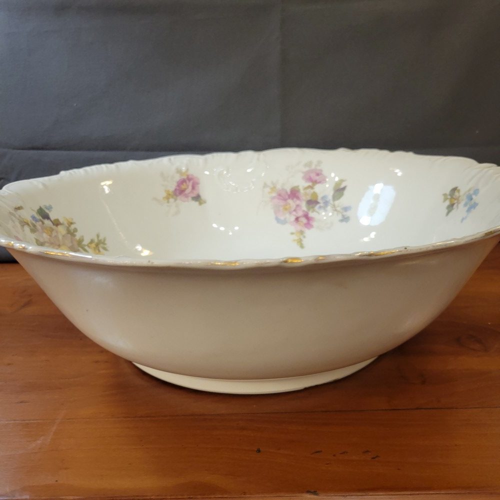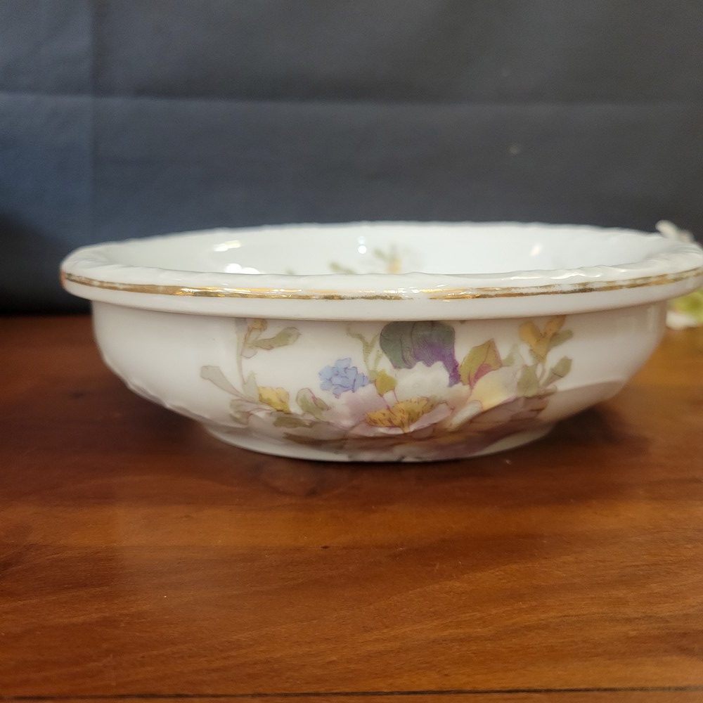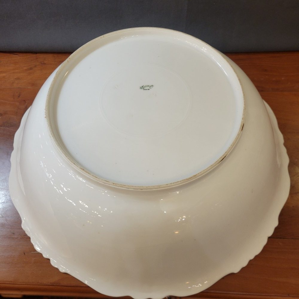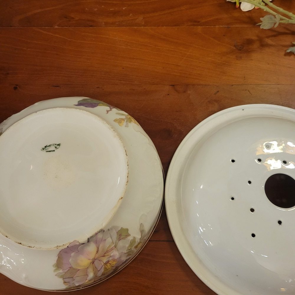 Ensemble de toilette en porcelaine de Limoges, décor de roses sur fond blanc. Bords chantournés, réhaussés d’un liseré doré. Il est composé d’un grand broc, d’une vasque et d’un égouttoir, porte-savon ou éponge, assorti. Chaque pièce est marquée Limoges France. Très bon état, à noter un discret défaut de fabrication sur le bord de la vasque (manque de glaçure).