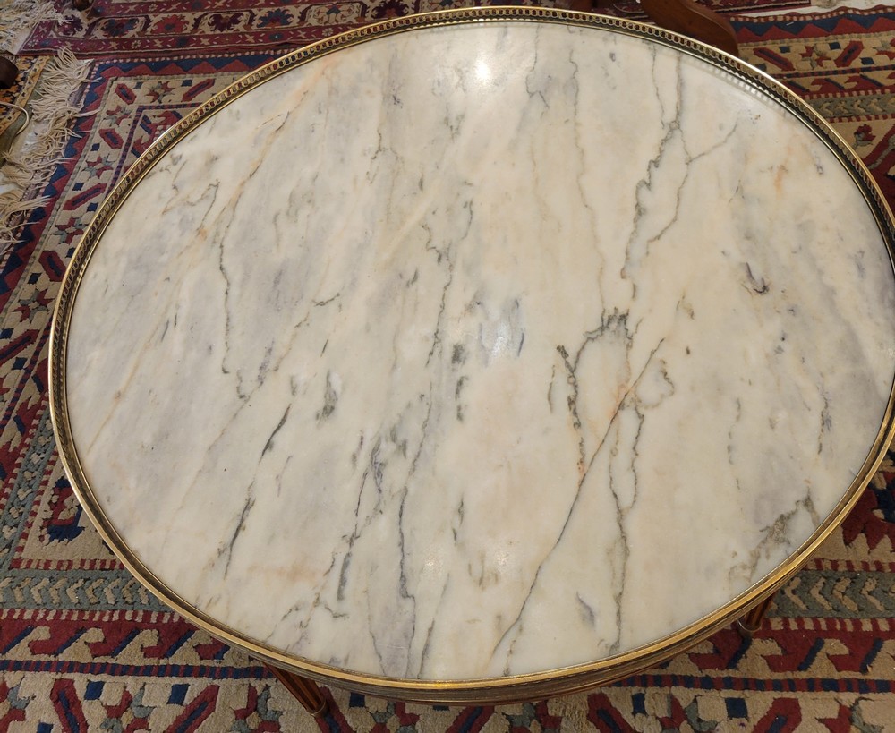 Grand guéridon bouillotte bas de style Louis XVI, datant de la première moitié du XXè siècle. Il est en acajou, muni de 4 tiroirs avec un plateau en marbre blanc veiné de gris et cerclé d’une galerie en laiton. Bon état général.