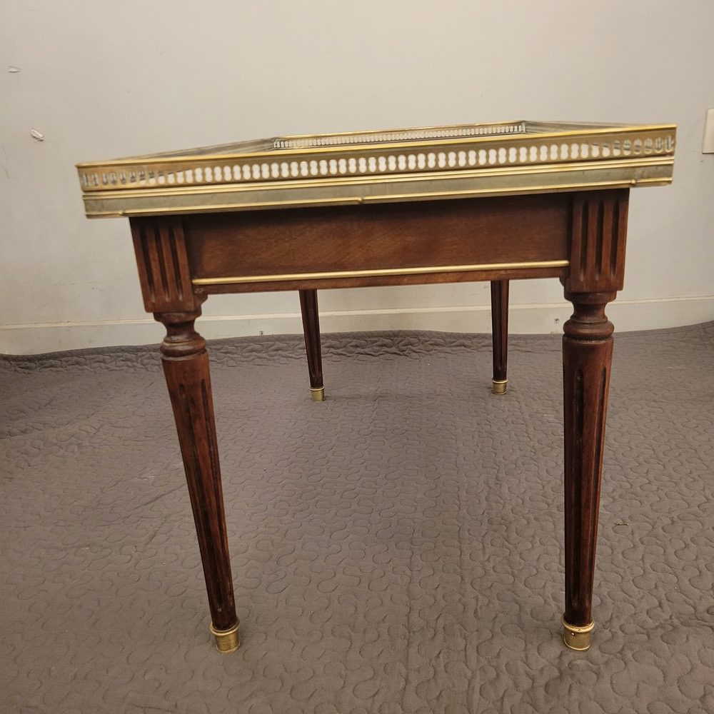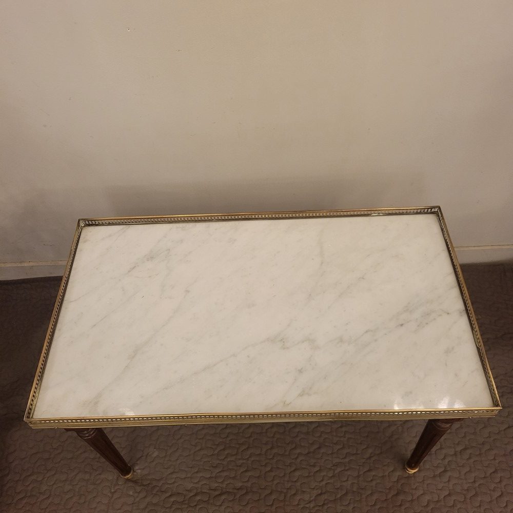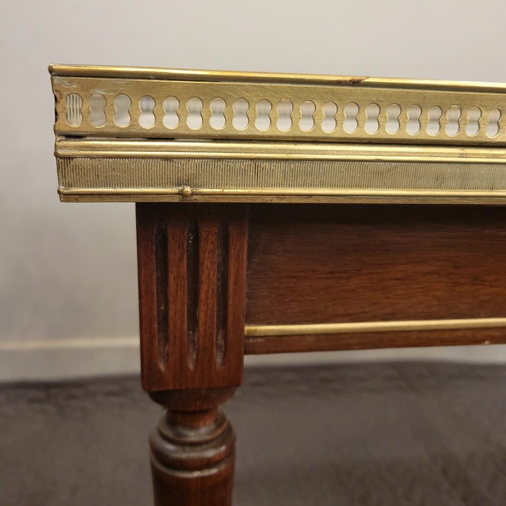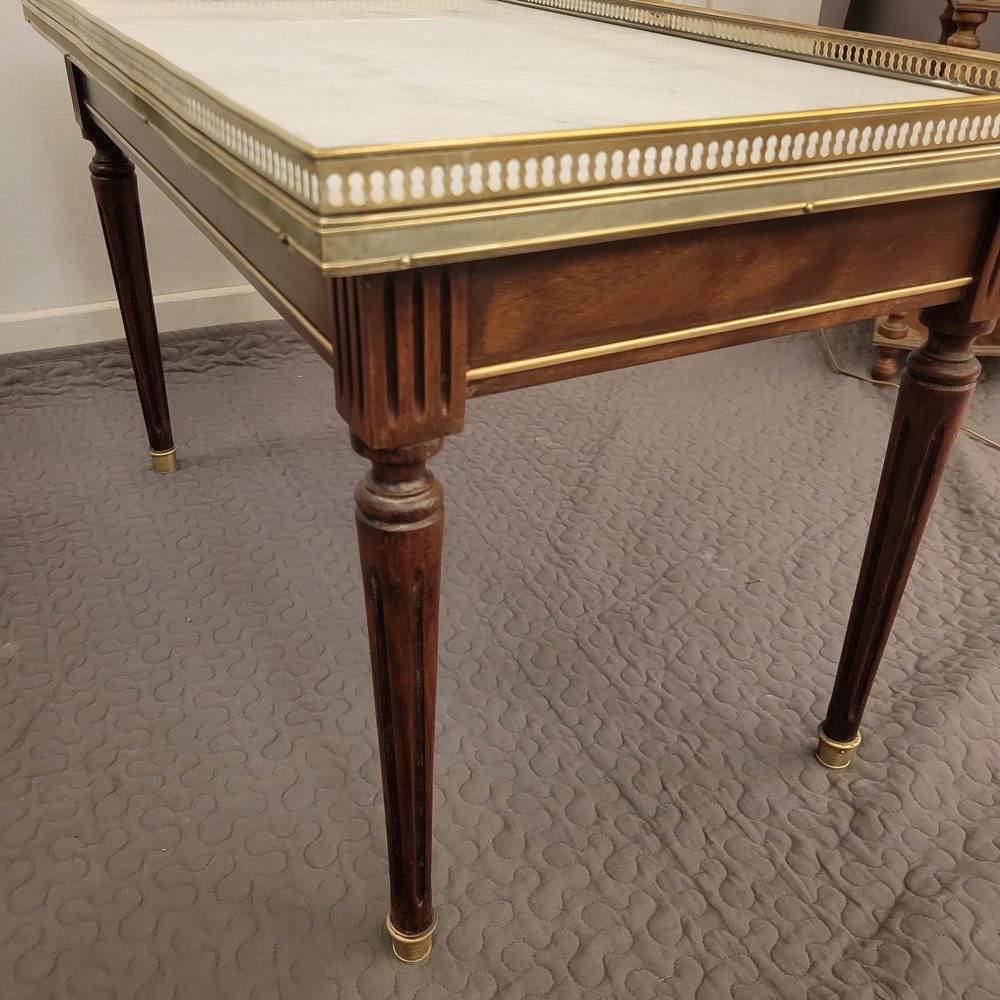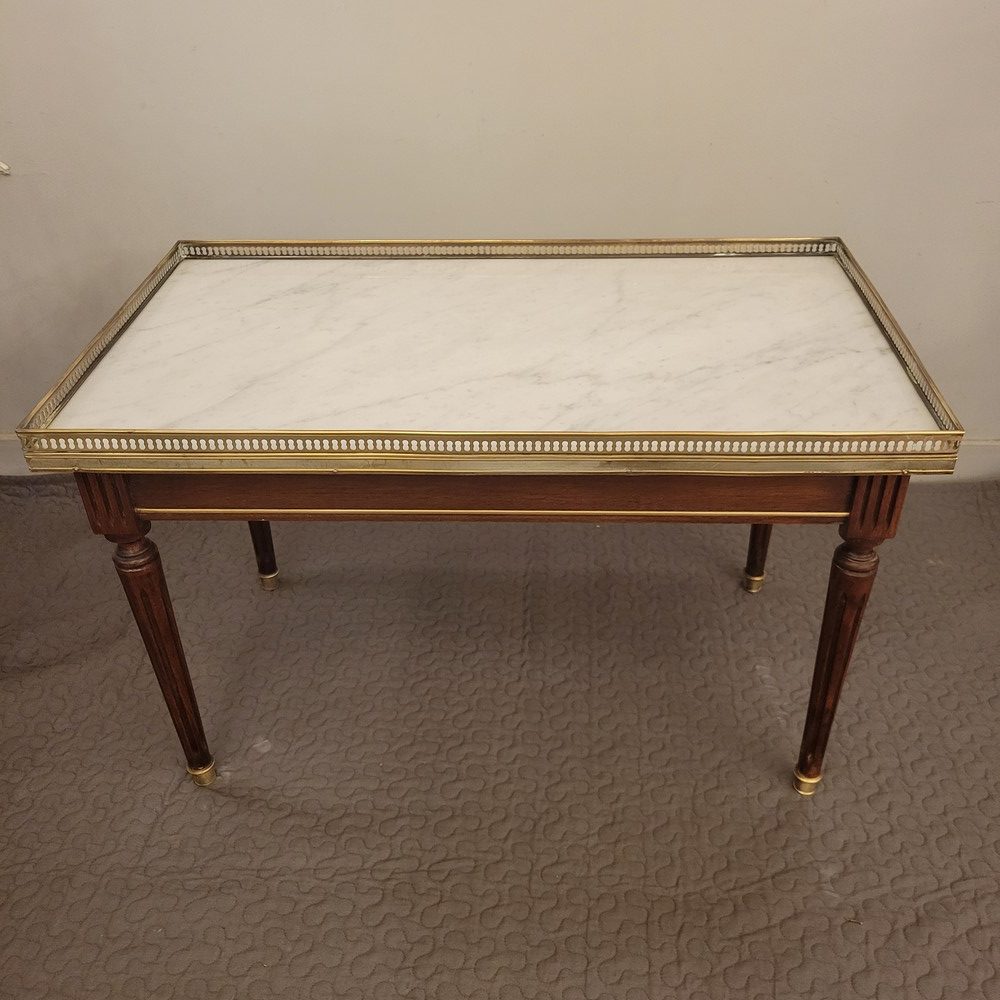 Guéridon bouillotte rectangulaire bas de style Louis XVI, datant de la première moitié du XXè siècle. Il est en acajou,  avec un plateau en marbre blanc  cerclé d’une galerie en laiton. Bon état général.