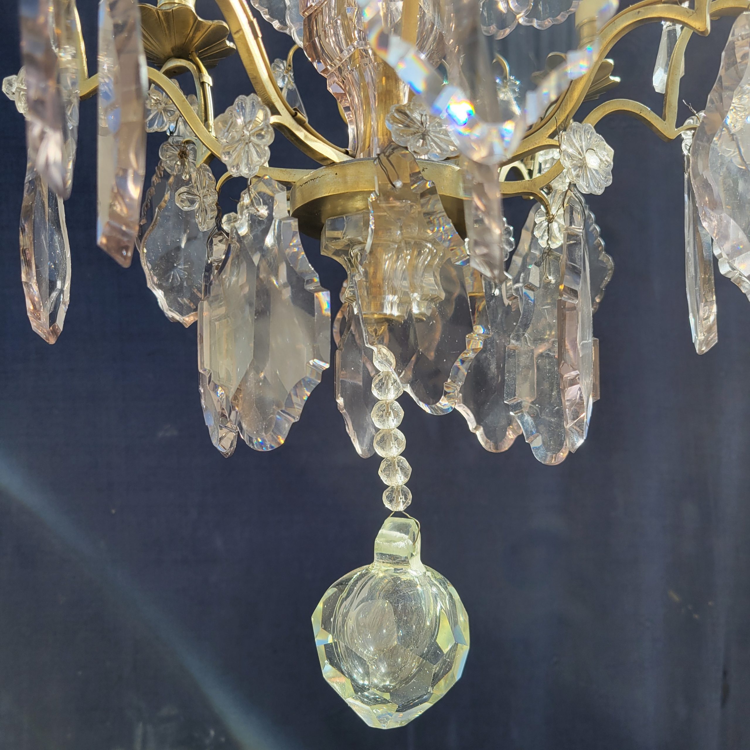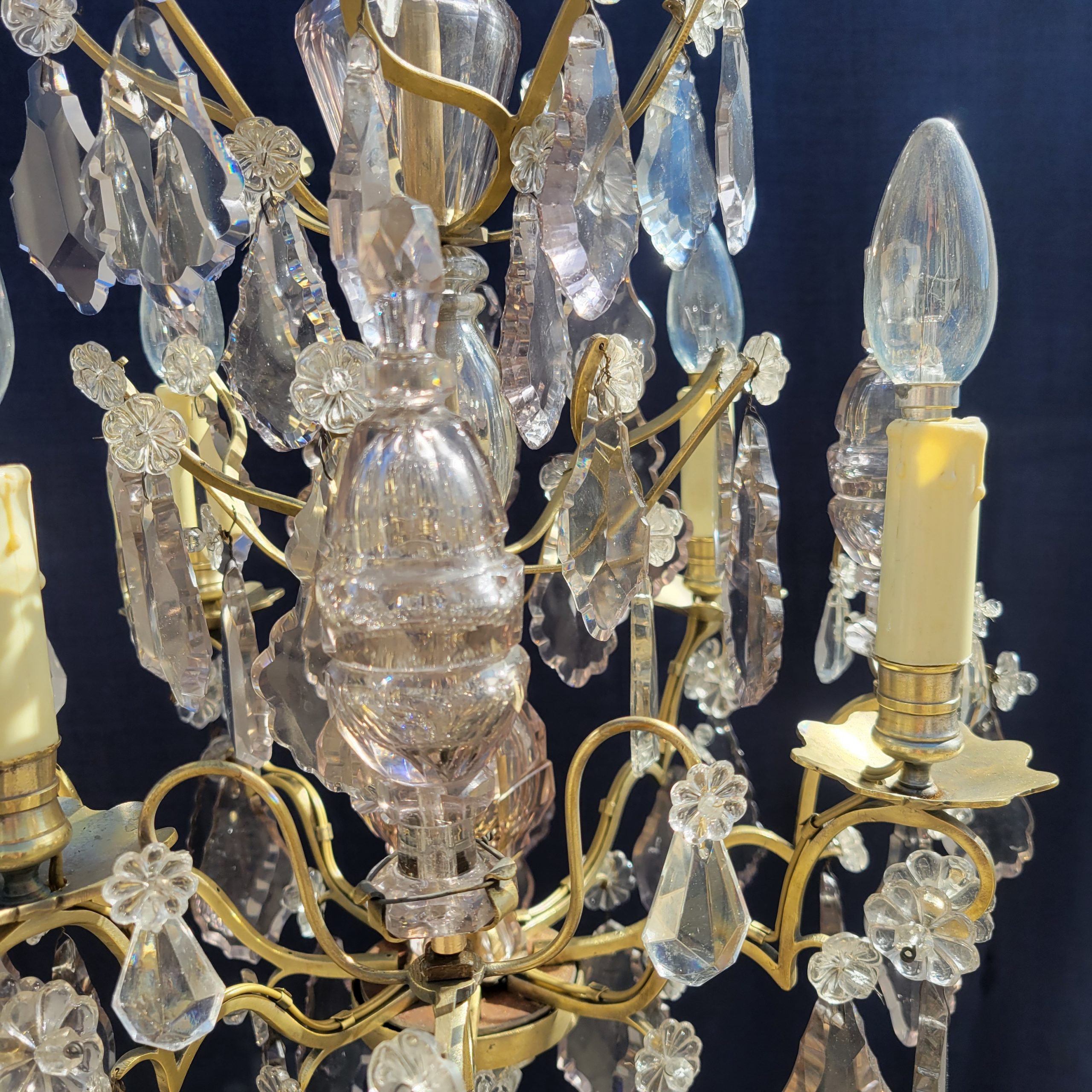 Lustre à pampilles de verre et de cristal taillés, à 4 couronnes et orné de pignons. De style Napoléon III et époque 1900. Structure en bronze avec une chaine qui peut se régler. Muni de 4 lumières, entièrement révisées et en parfait état de marche avec des ampoules à vis E14.