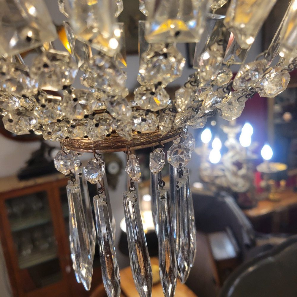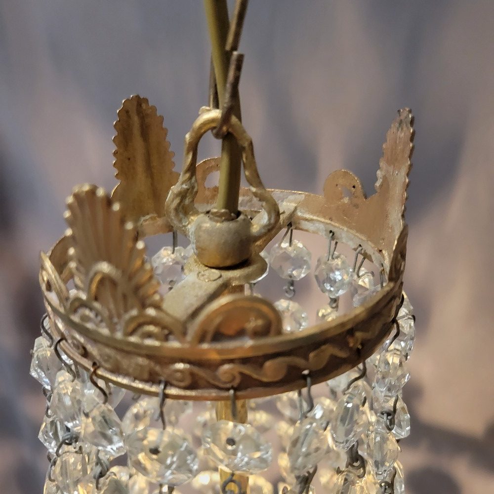Petit lustre montgolfière à 1 lumière, de style Louis XVI et d’époque 1940 . Structure en bronze et pampilles de verre. Système électrique refait avec une douille à vis E14 . La chaine peut s’ajuster pour modifier la hauteur.