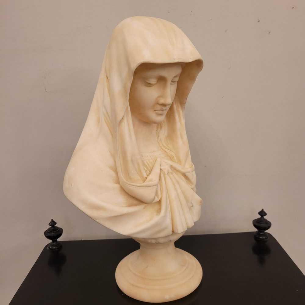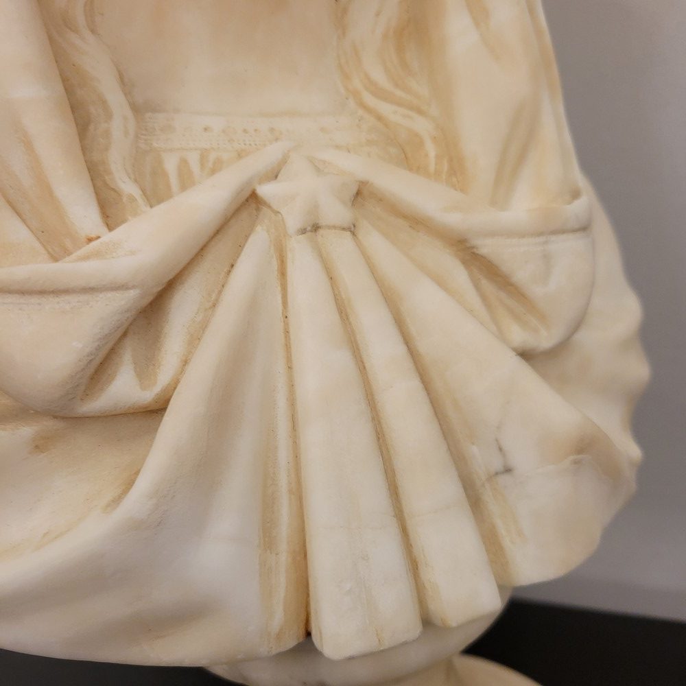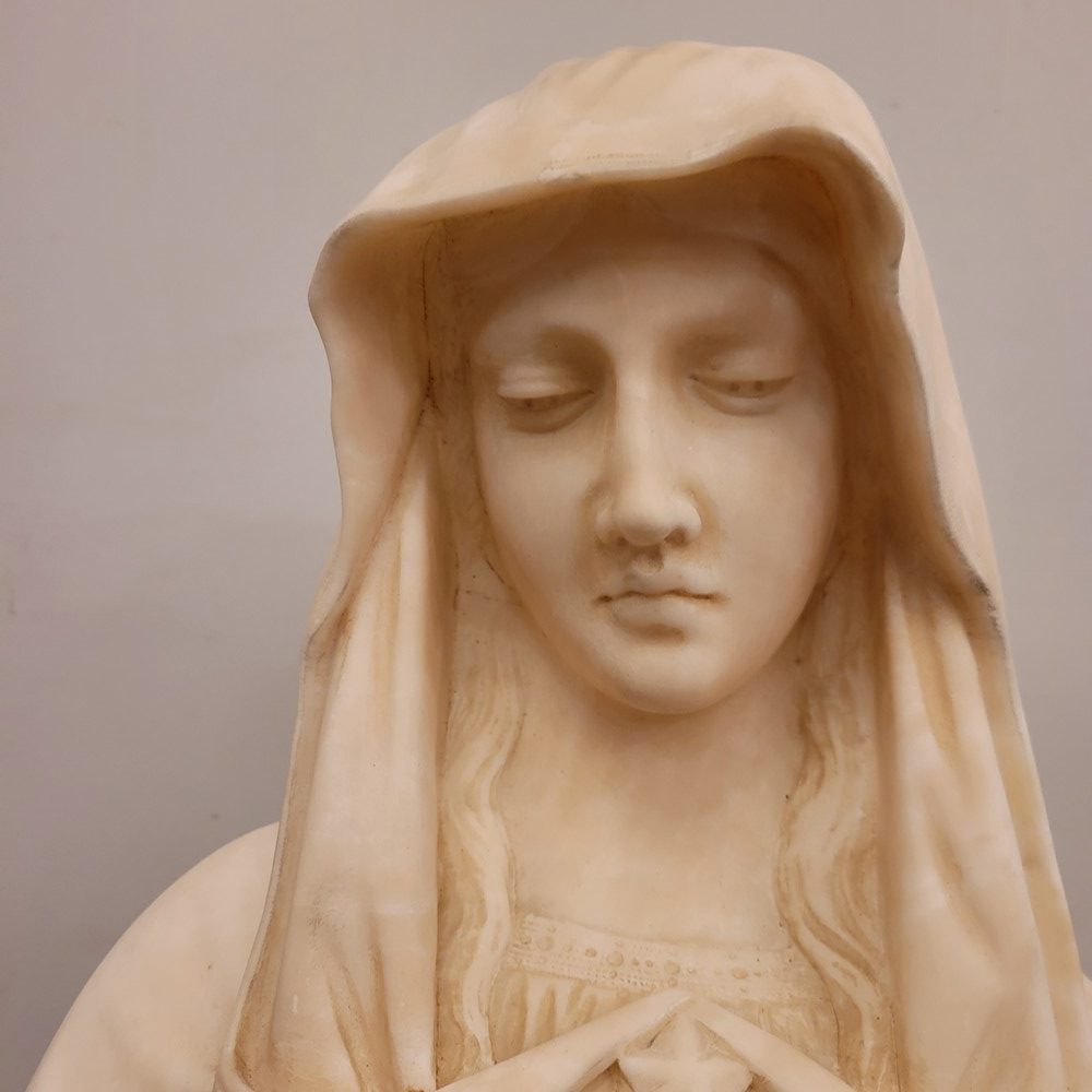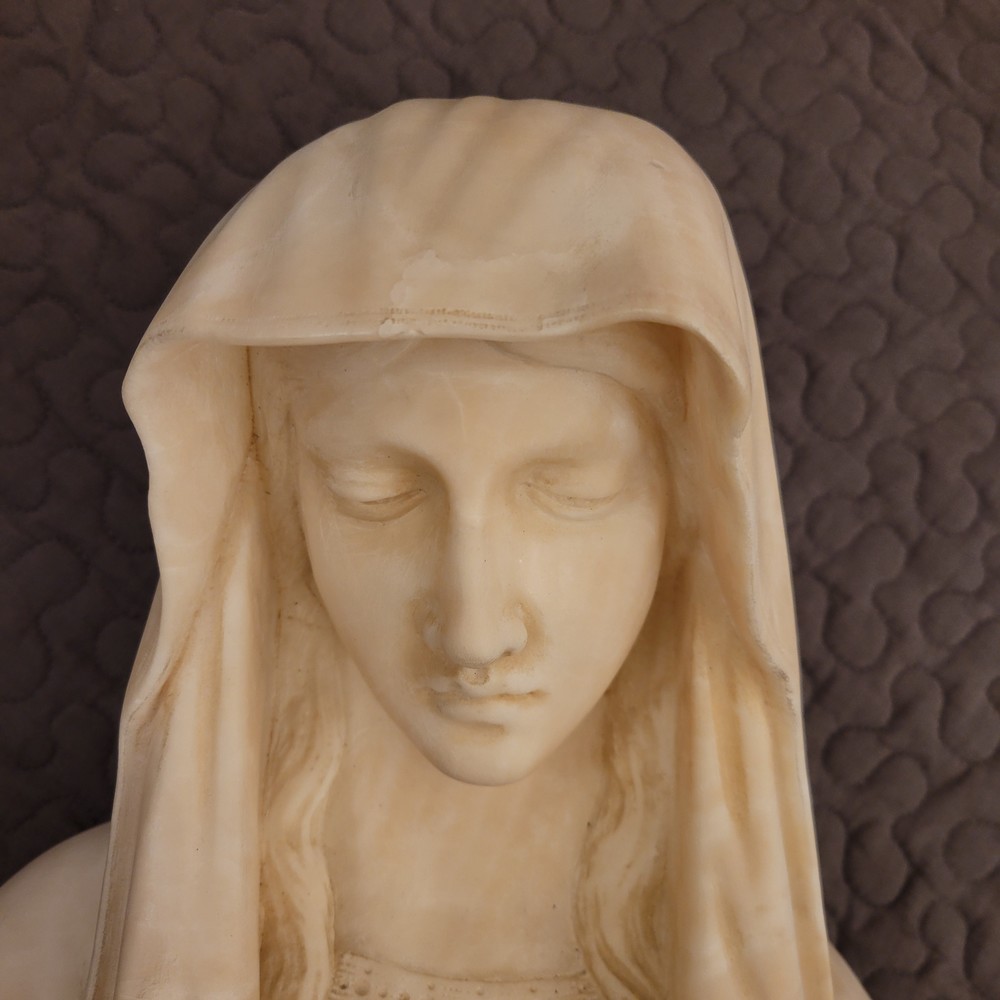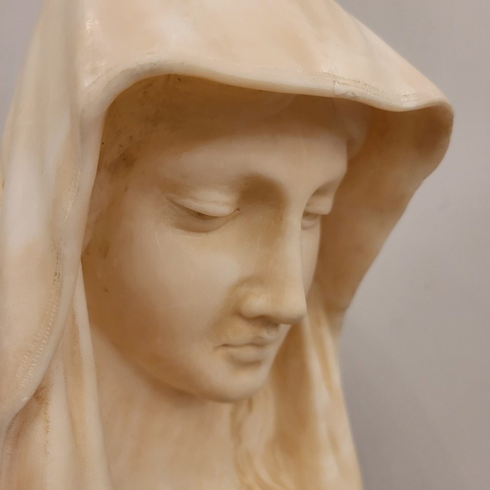 Buste en albâtre représentant la vierge Marie sous les traits de la douleur maternelle.