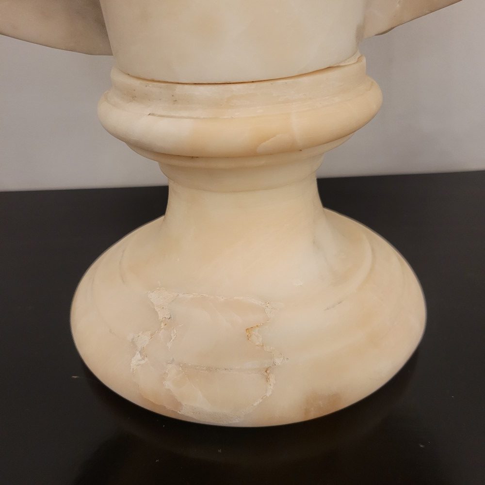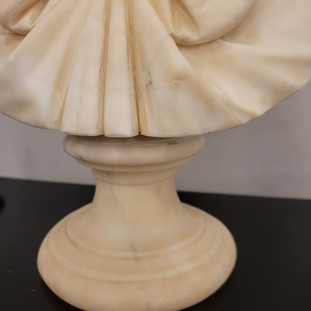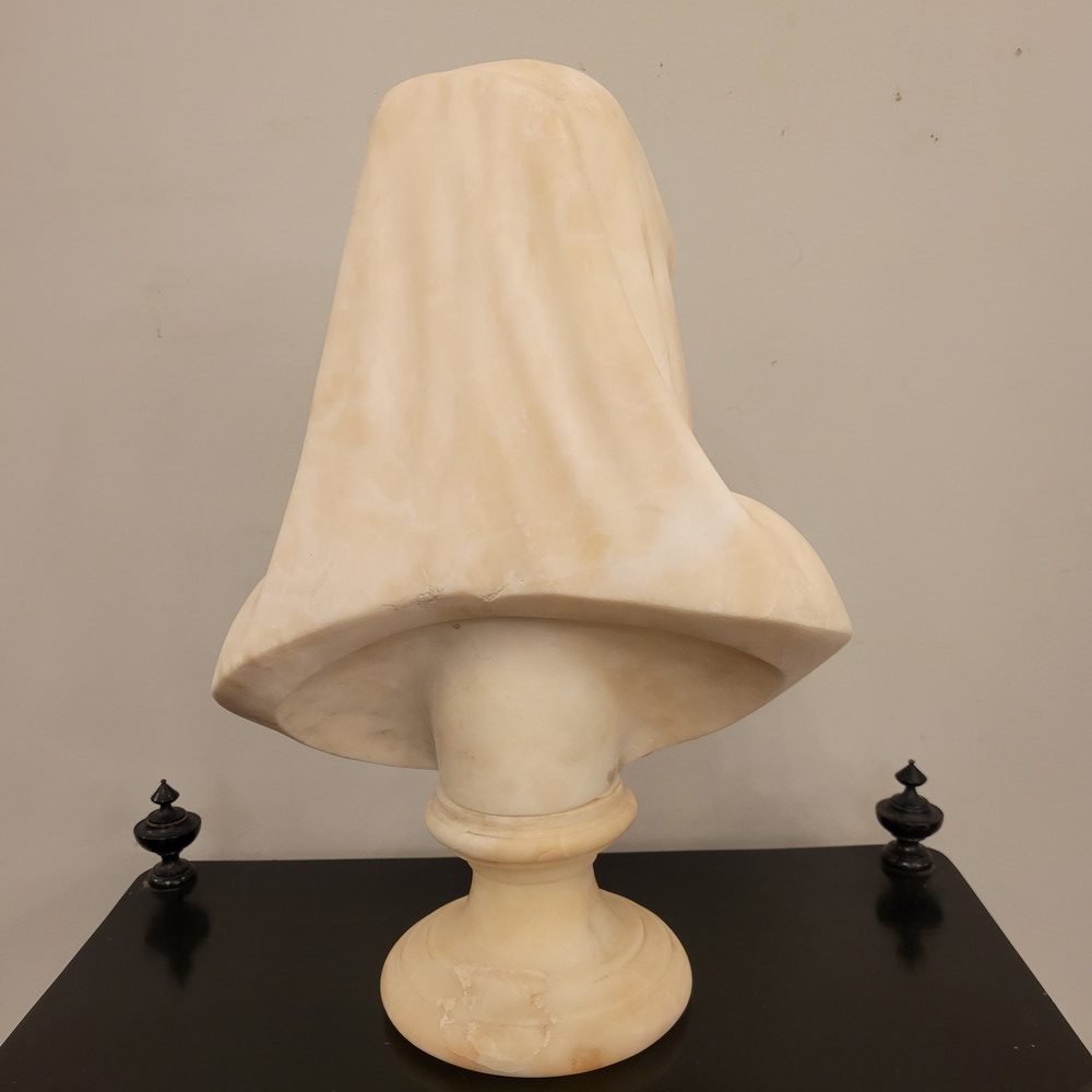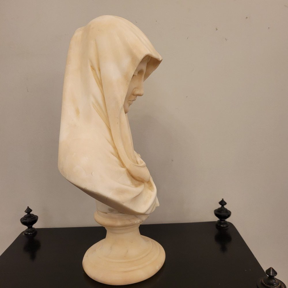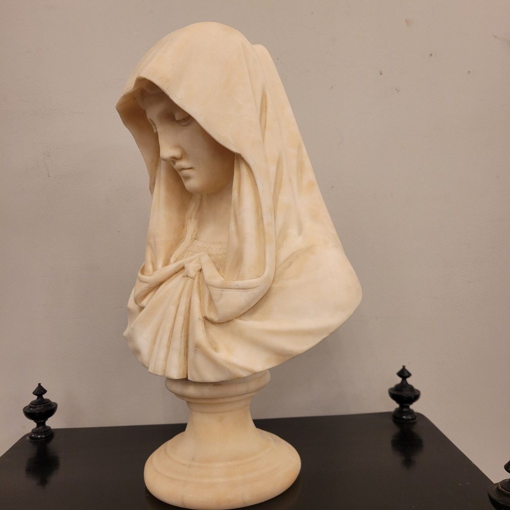 Buste en albâtre représentant la vierge Marie sous les traits de la douleur maternelle.